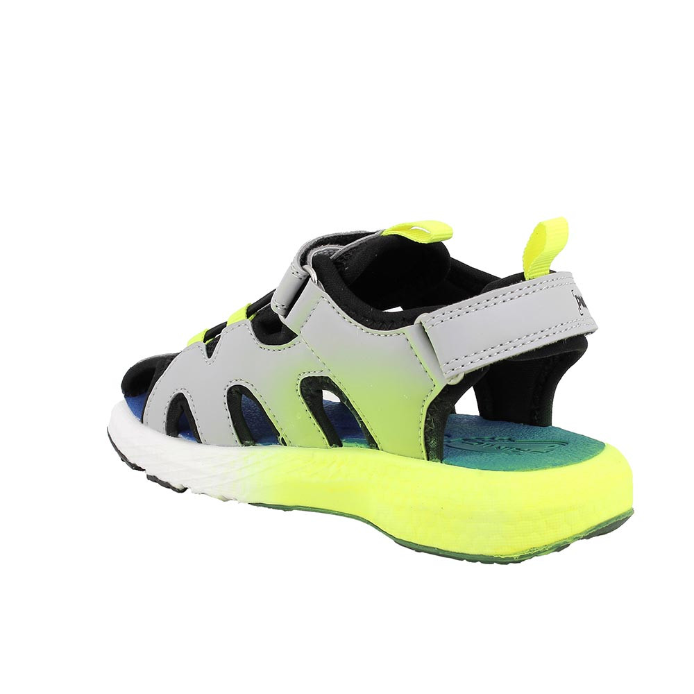 Sandalias de inspiración energica,fácilmente ajustables y seguras gracias a los velcros en el tobillo. Los materiales han sido seleccionados para crear un calzado ligero y cómodo para llevar incluso durante muchas horas. La plantilla de EVA es higiénica, repelente al agua. La suela ergonómica es ligera y muy flexibles.