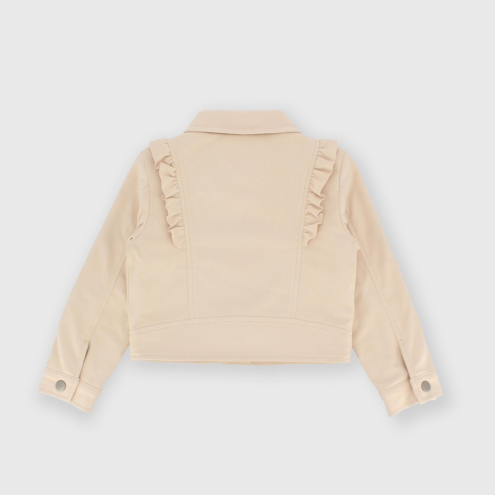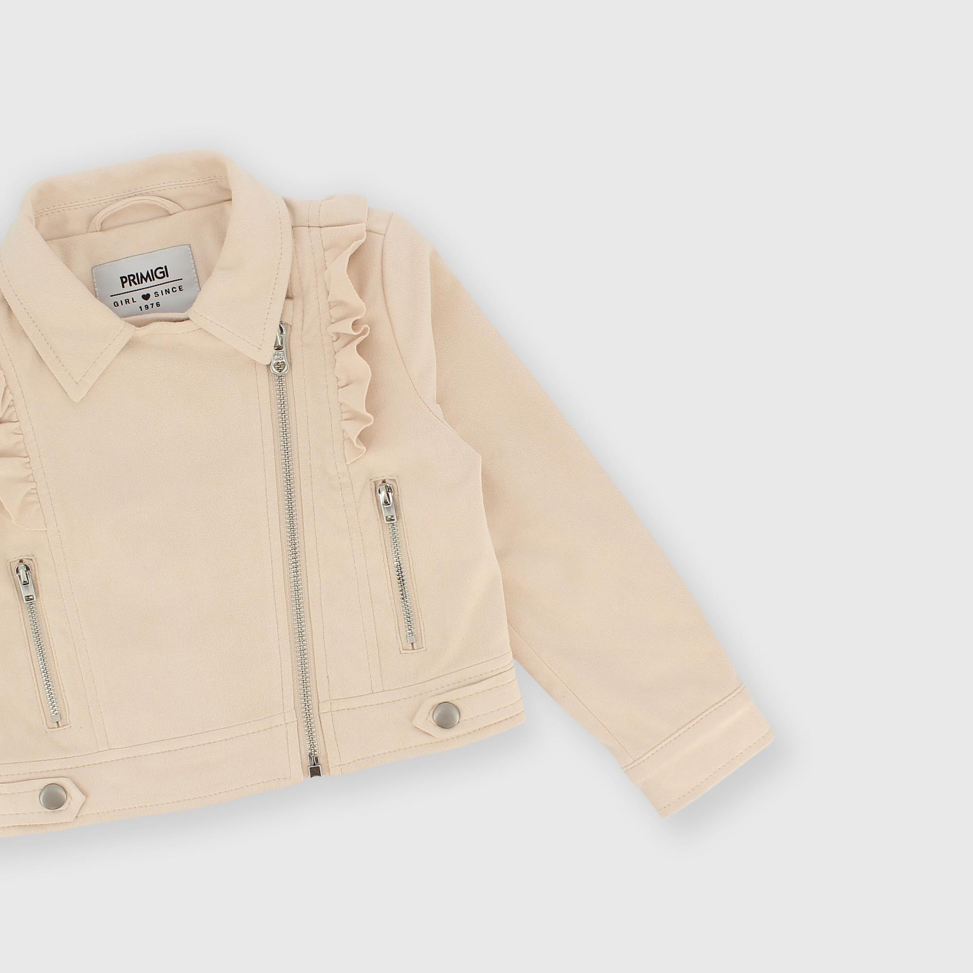 Cazadora de piel sintética ante, con cuello, mangas largas. Cierre con cremallera lateral. Volantes en los hombros y bolsillos oja con cremallera. Forro interior.