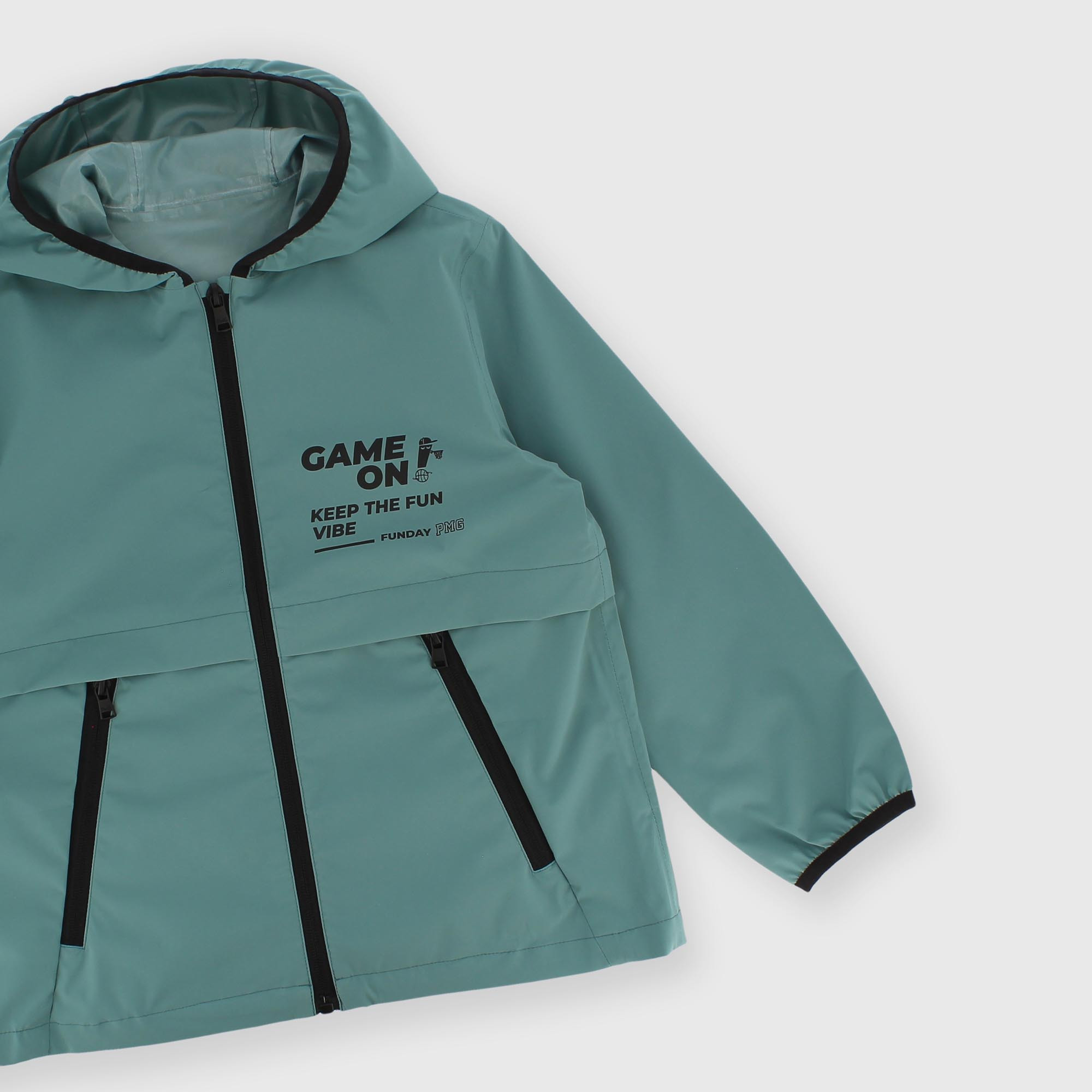 Cazadora de nylon con capucha y mangas largas. Cierre frontal con cremallera. Bolsillos delanteros con cremallera insertada. Estampado pequeño. Detalles a contraste.