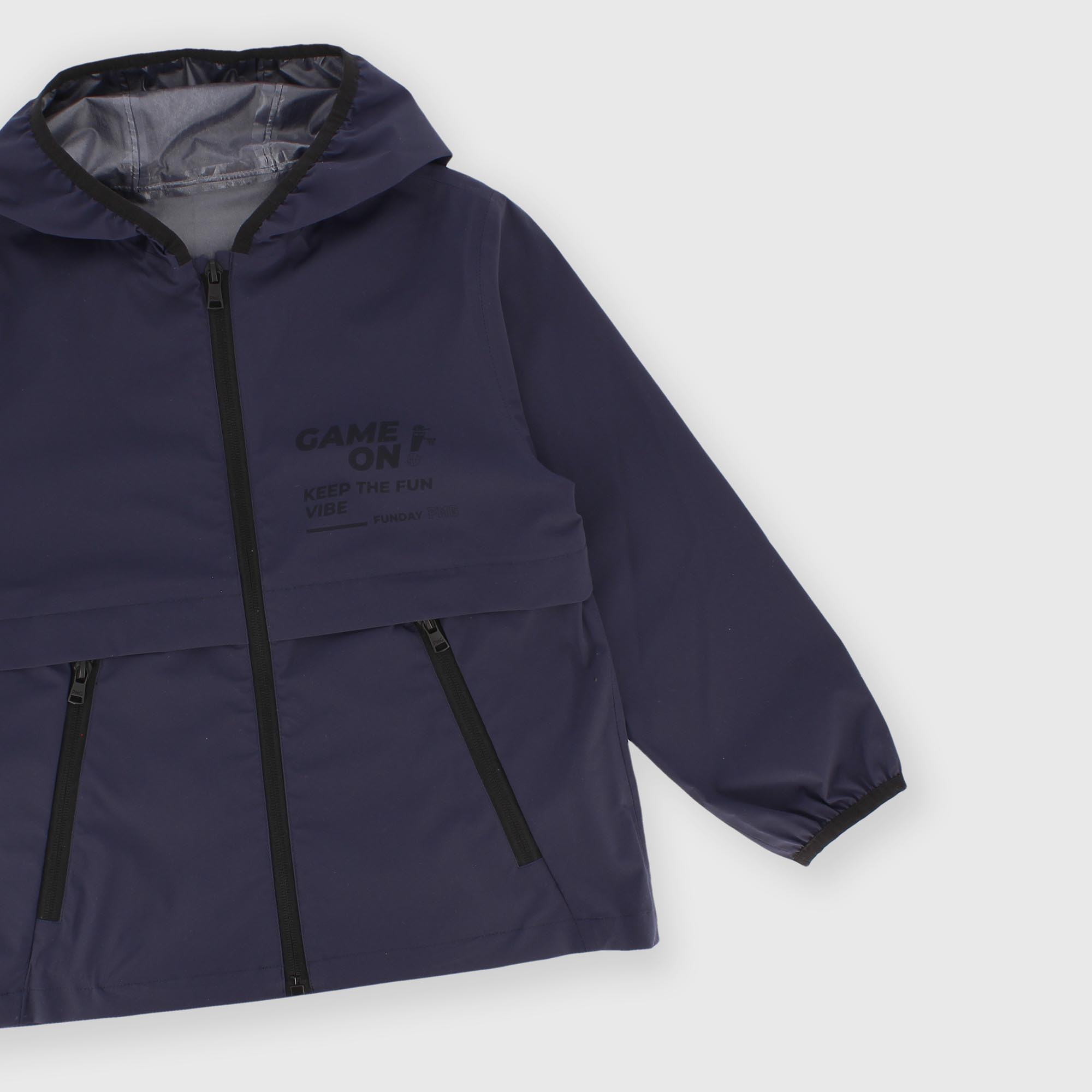 Cazadora de nylon con capucha y mangas largas. Cierre frontal con cremallera. Bolsillos delanteros con cremallera insertada. Estampado pequeño. Detalles a contraste.