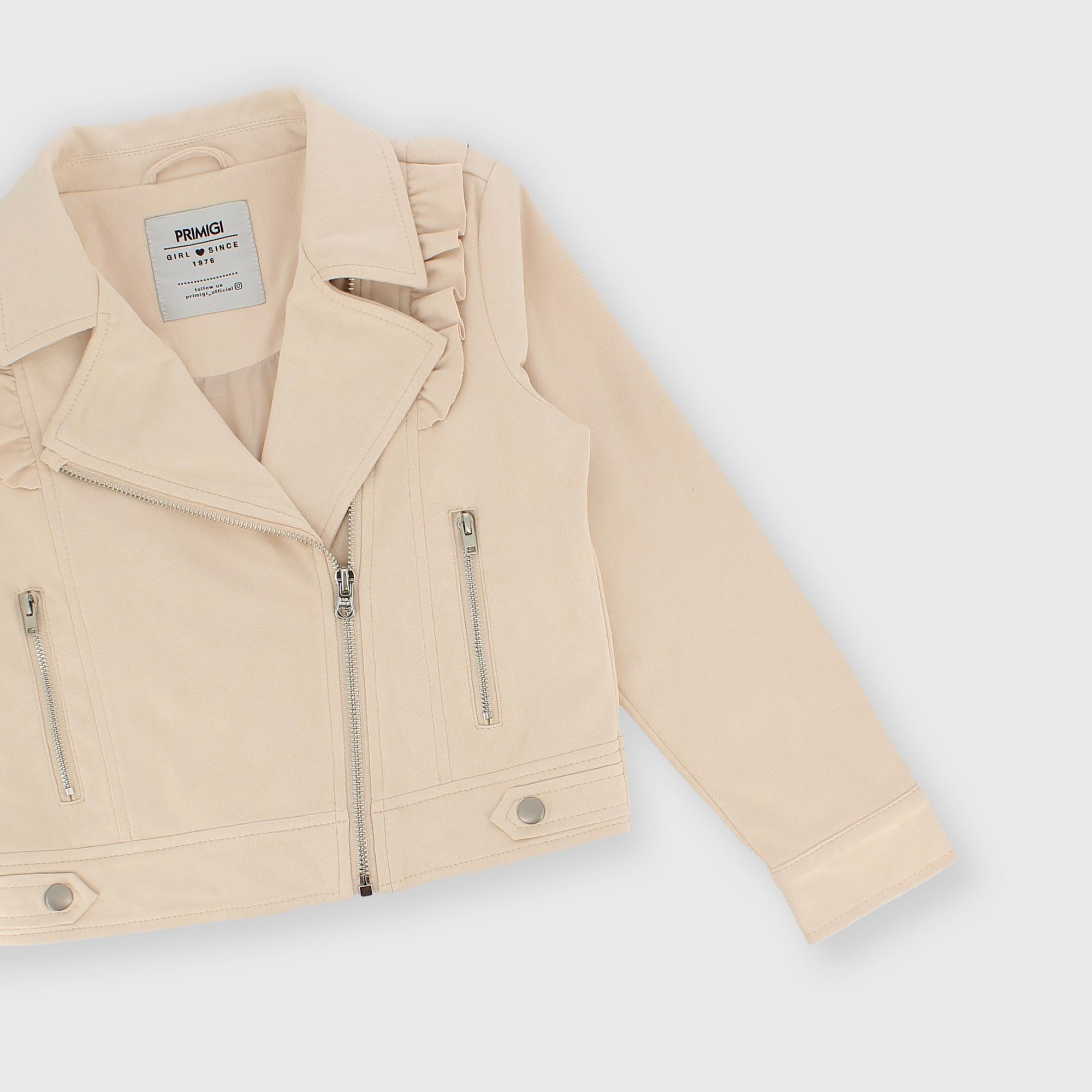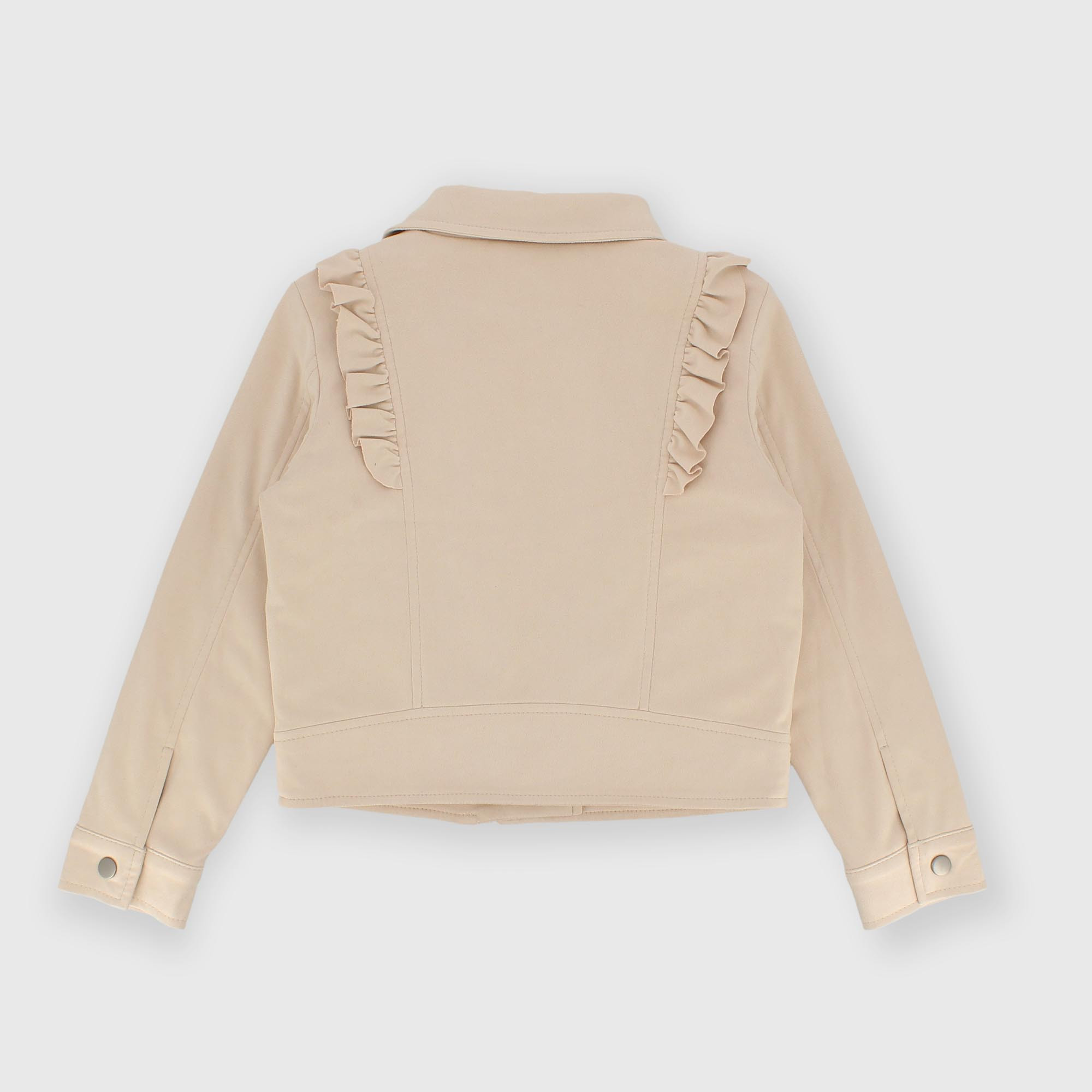 Cazadora de piel sintética ante, con cuello, mangas largas. Cierre con cremallera lateral. Volantes en los hombros y bolsillos oja con cremallera. Forro interior.
