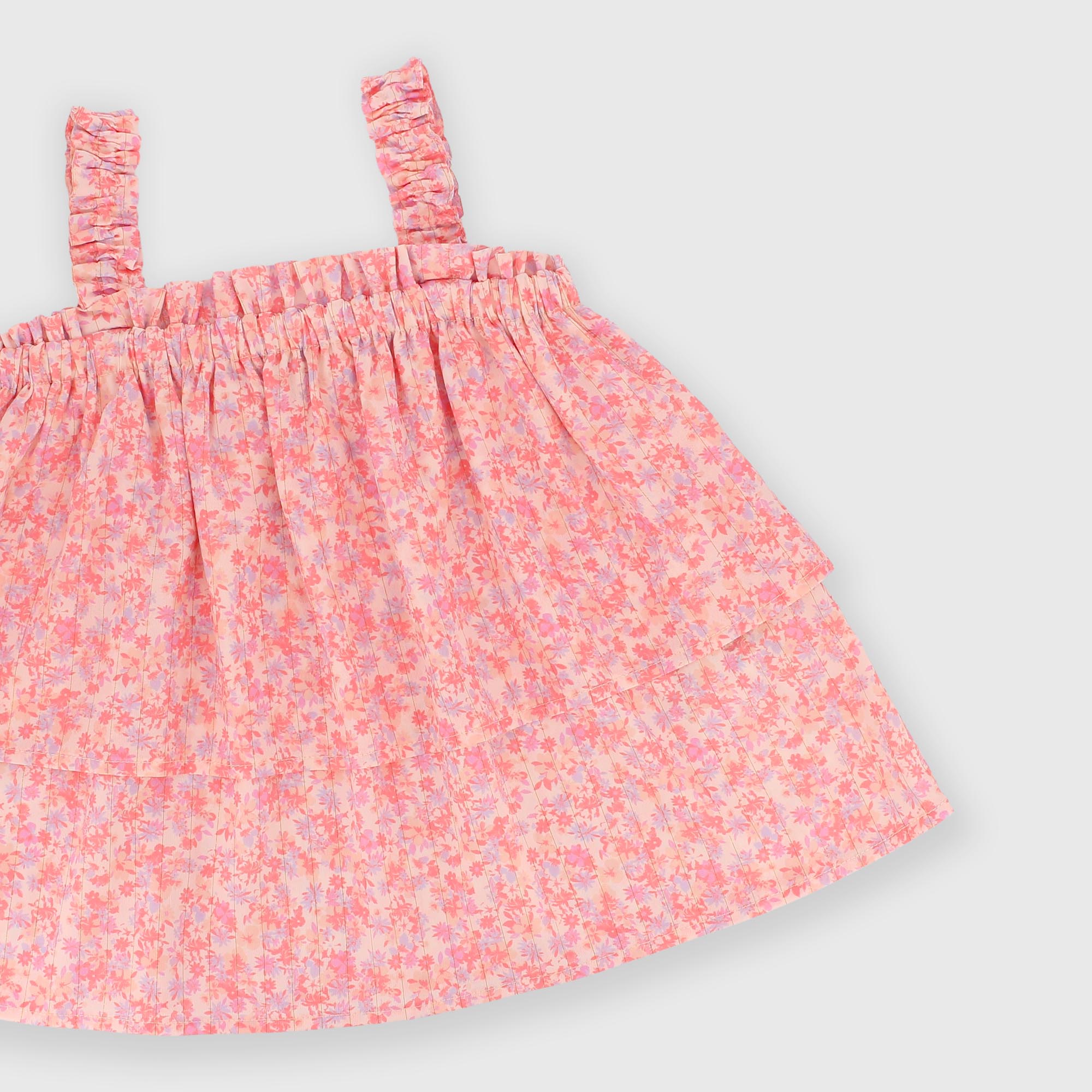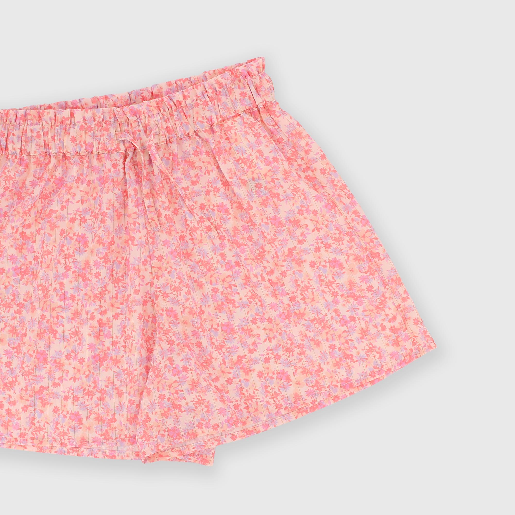 Conjunto formado por dos piezas con estampado total de flores. Top con volante, cuello cuadrado. Tirantes fruncidos. Pantalones cortos con cintura elástica y cordones en la parte frontal.