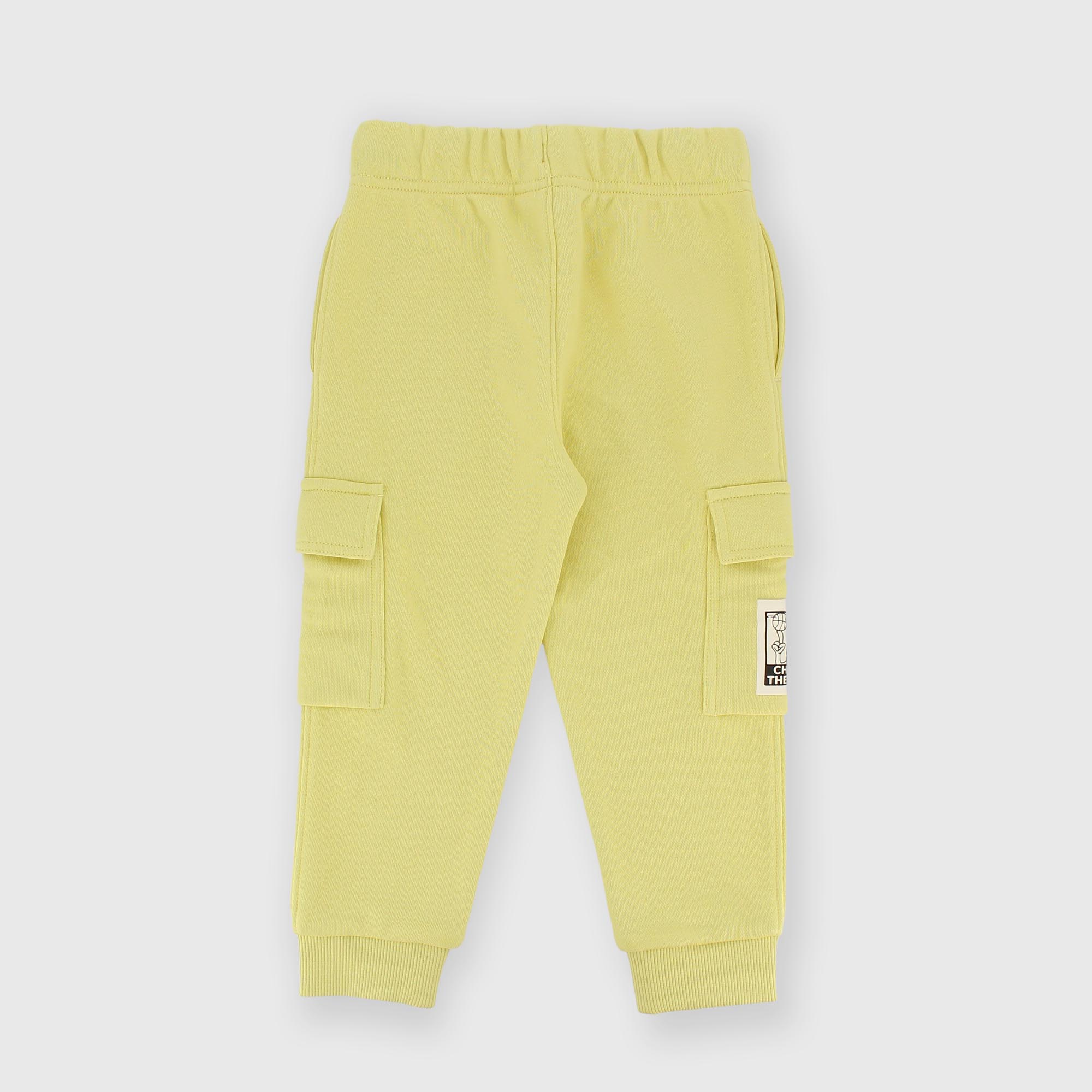 Pantalón de felpa con cintura elástica y cordones delanteros. Bolsillos de parche con solapa en los laterales. Estampado efecto gomado en el bolsillo. Bajo en canalé.