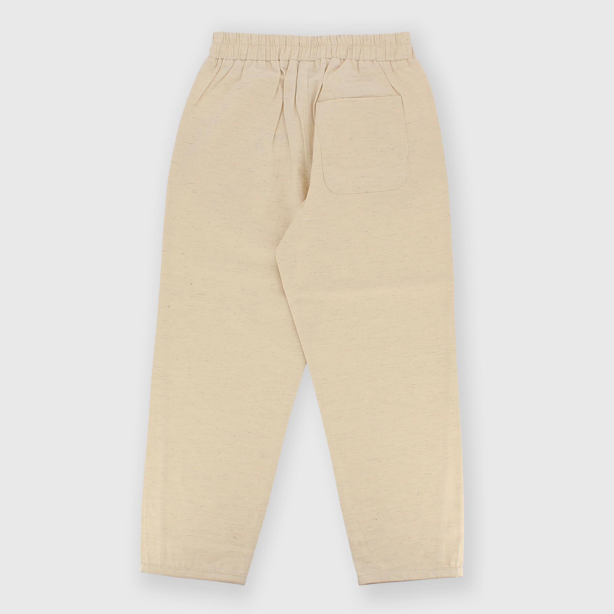 Pantalón de algodón y lino con elástico en la parte trasera. Cierre con botón y cremallera. Bolsillos delanteros y un bolsillo de parche en la parte trasera. Corte holgado.