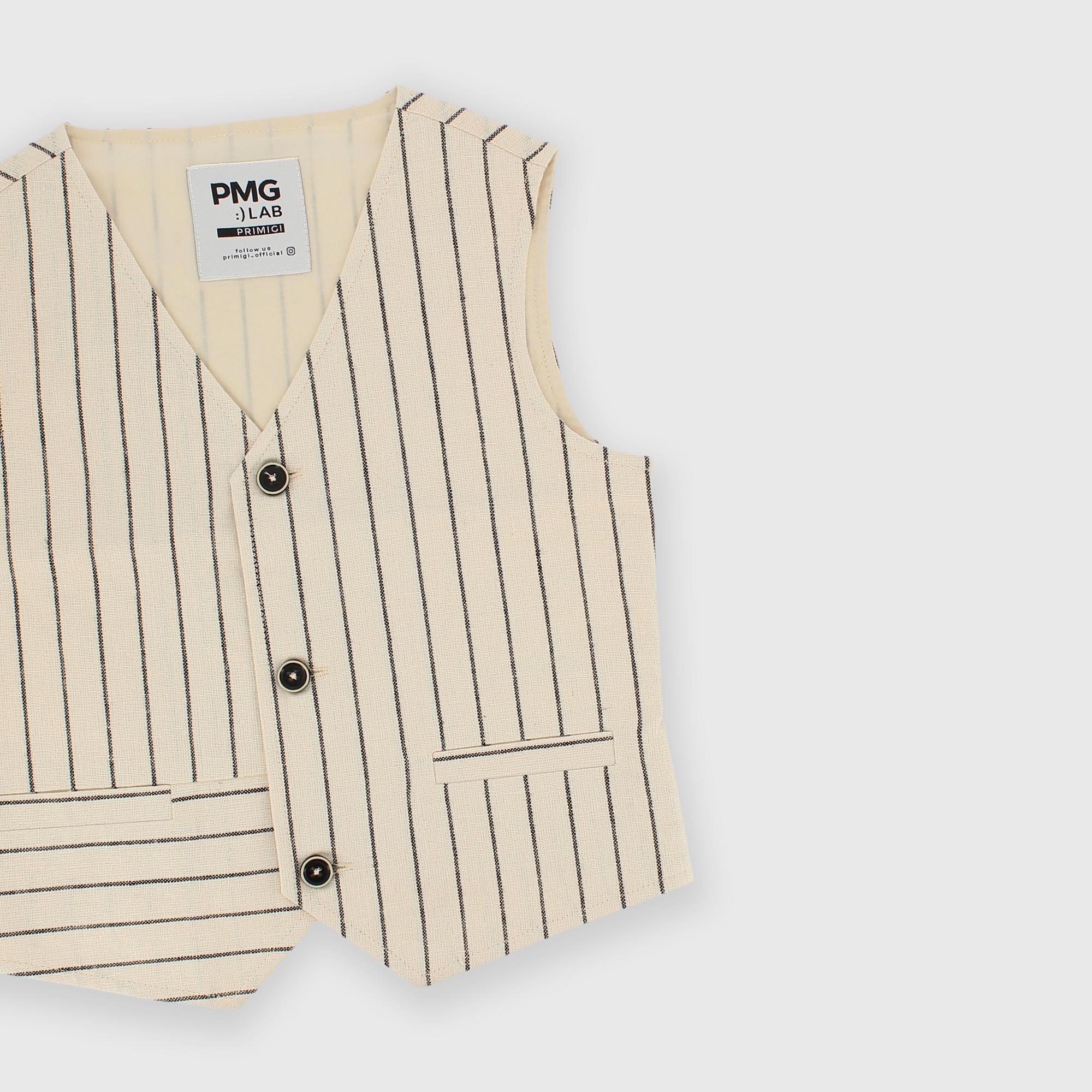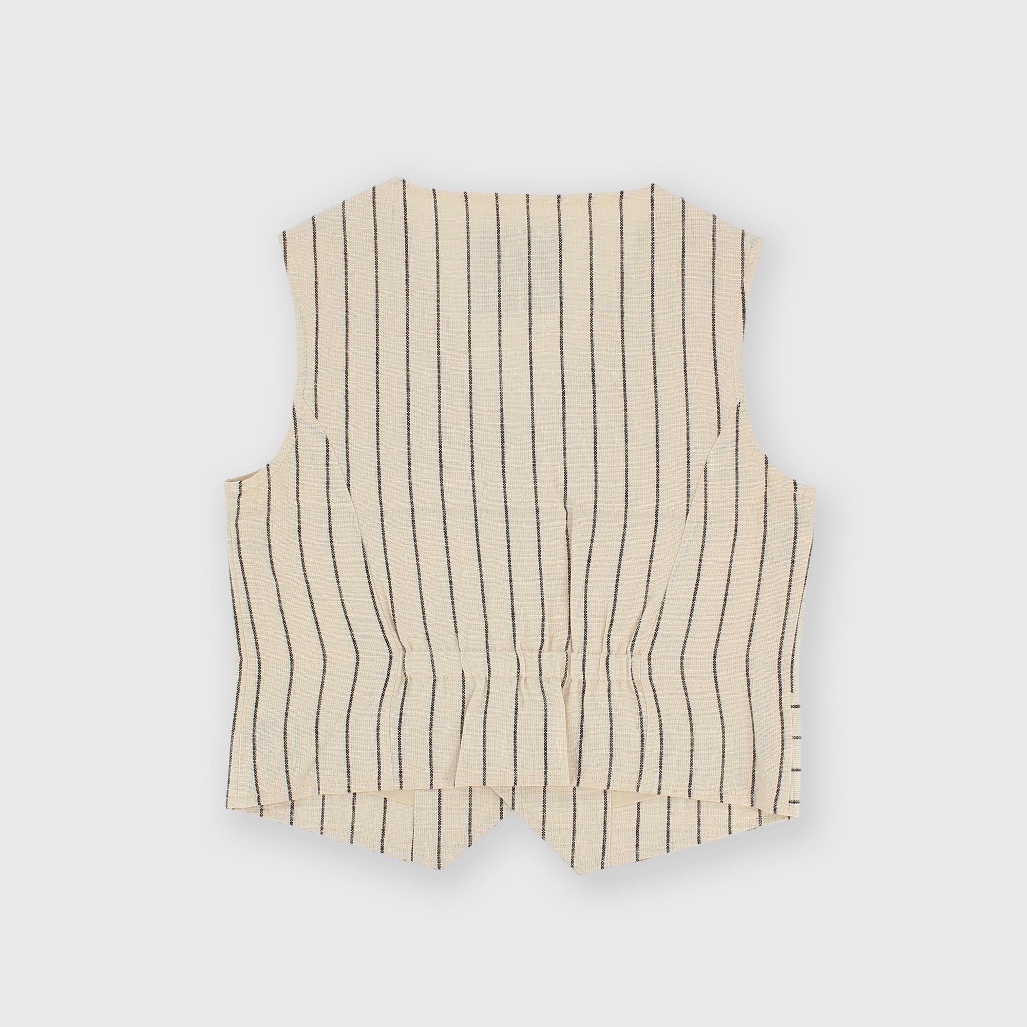 Chaleco de mezcla de lino con rayas teñidas en hilo y botones en la parte delantera. Bolsillos de ojal. Elástico en la parte trasera.