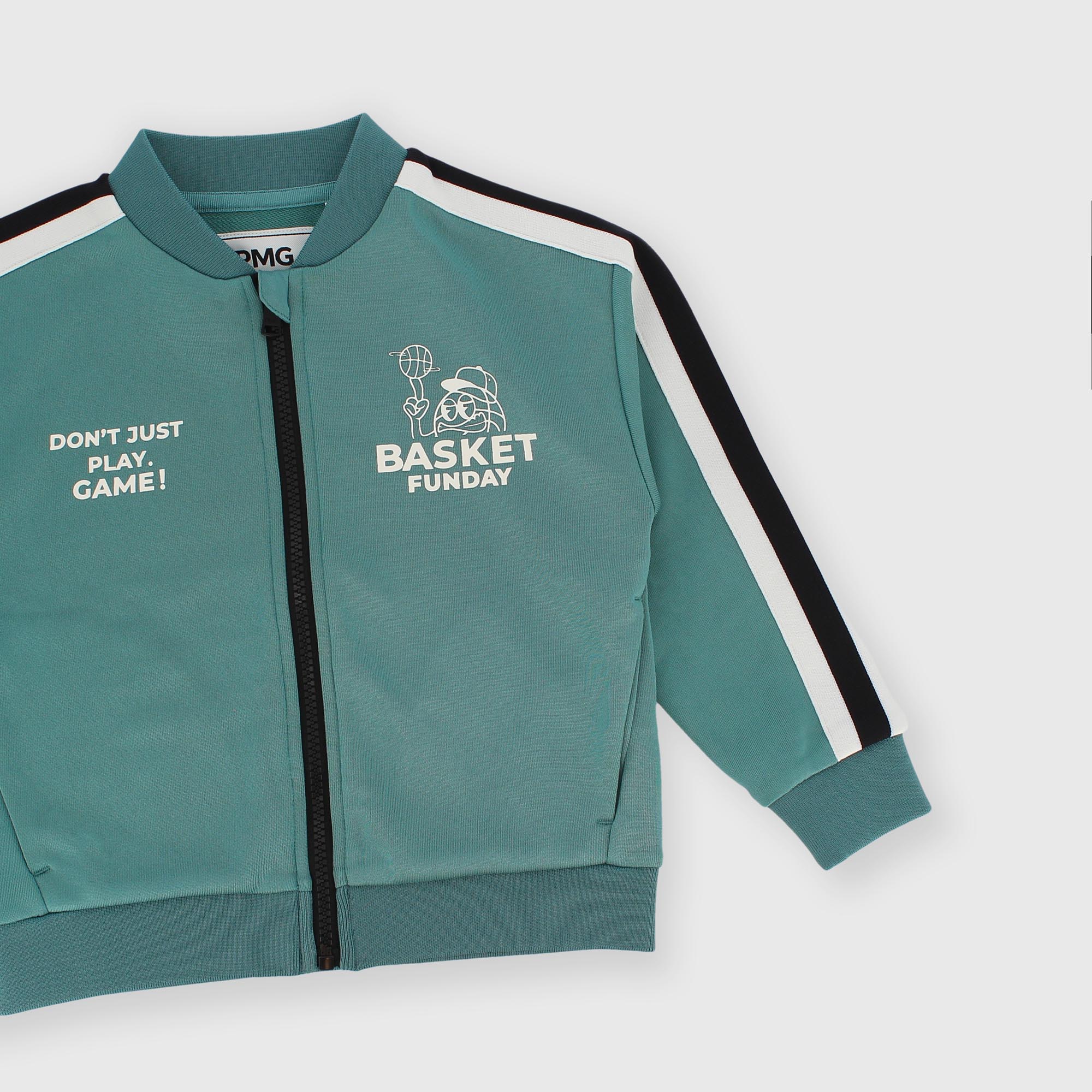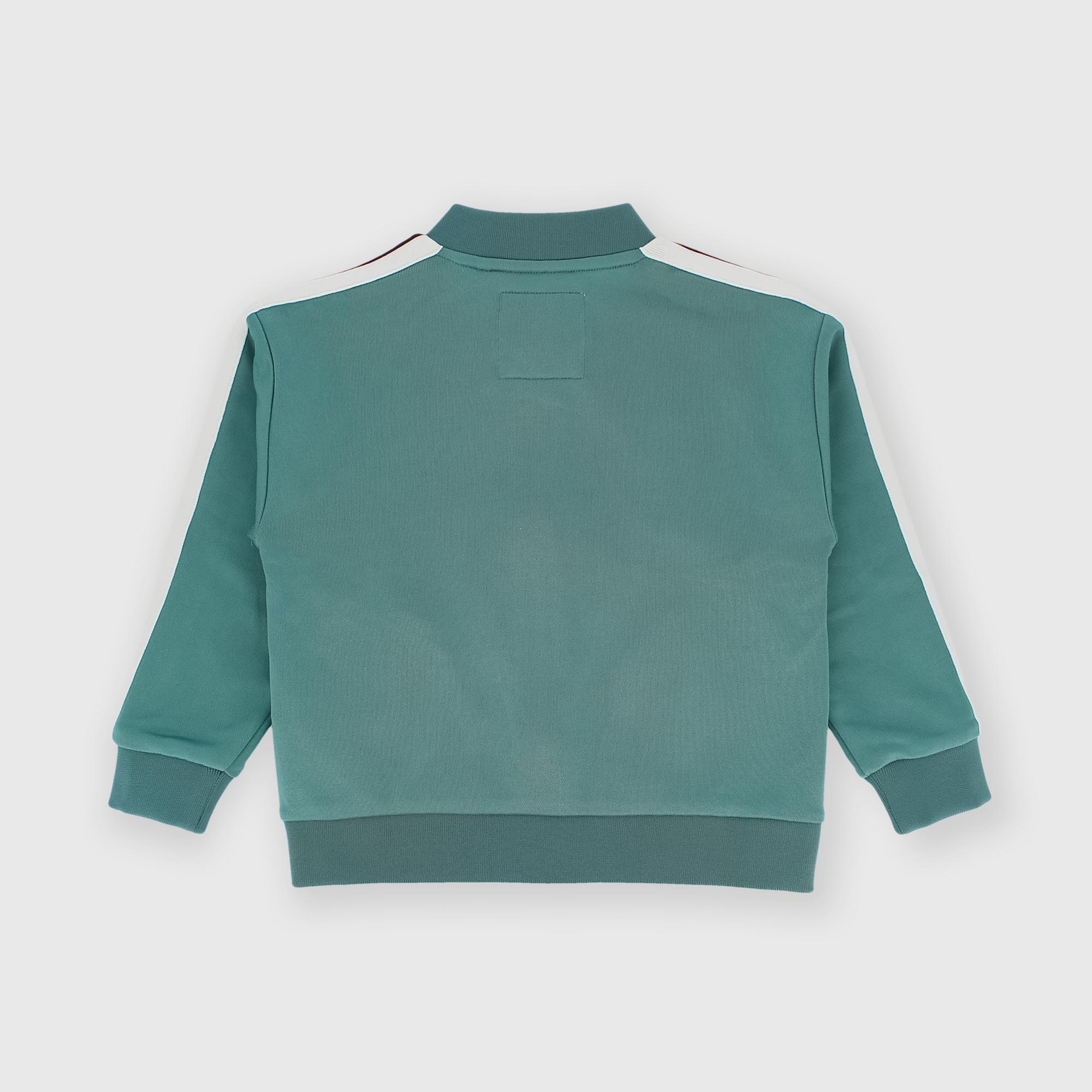 Sudadera de medio cuello de triacetato y mangas largas. Cierre frontal con cremallera. Bolsillos ocultos. Bandas laterales en contraste. Estampado efecto goma en el frente. Cuello, puños y bajo de canalé.
