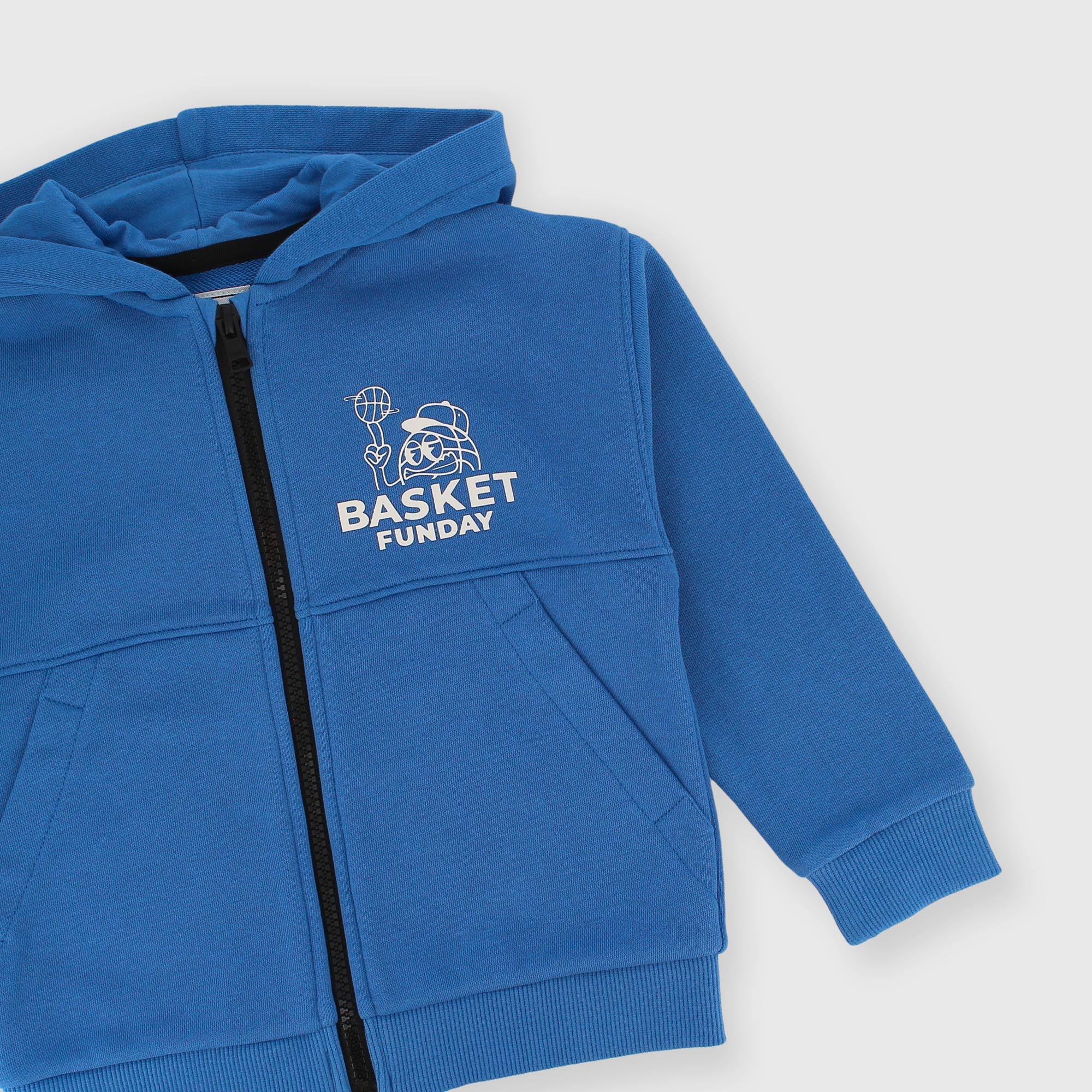 Sudadera con capucha y mangas largas. Cierre frontal con cremallera. Bolsillo tipo canguro. Estampado efecto goma en el pecho. Puños y bajo de canalé.