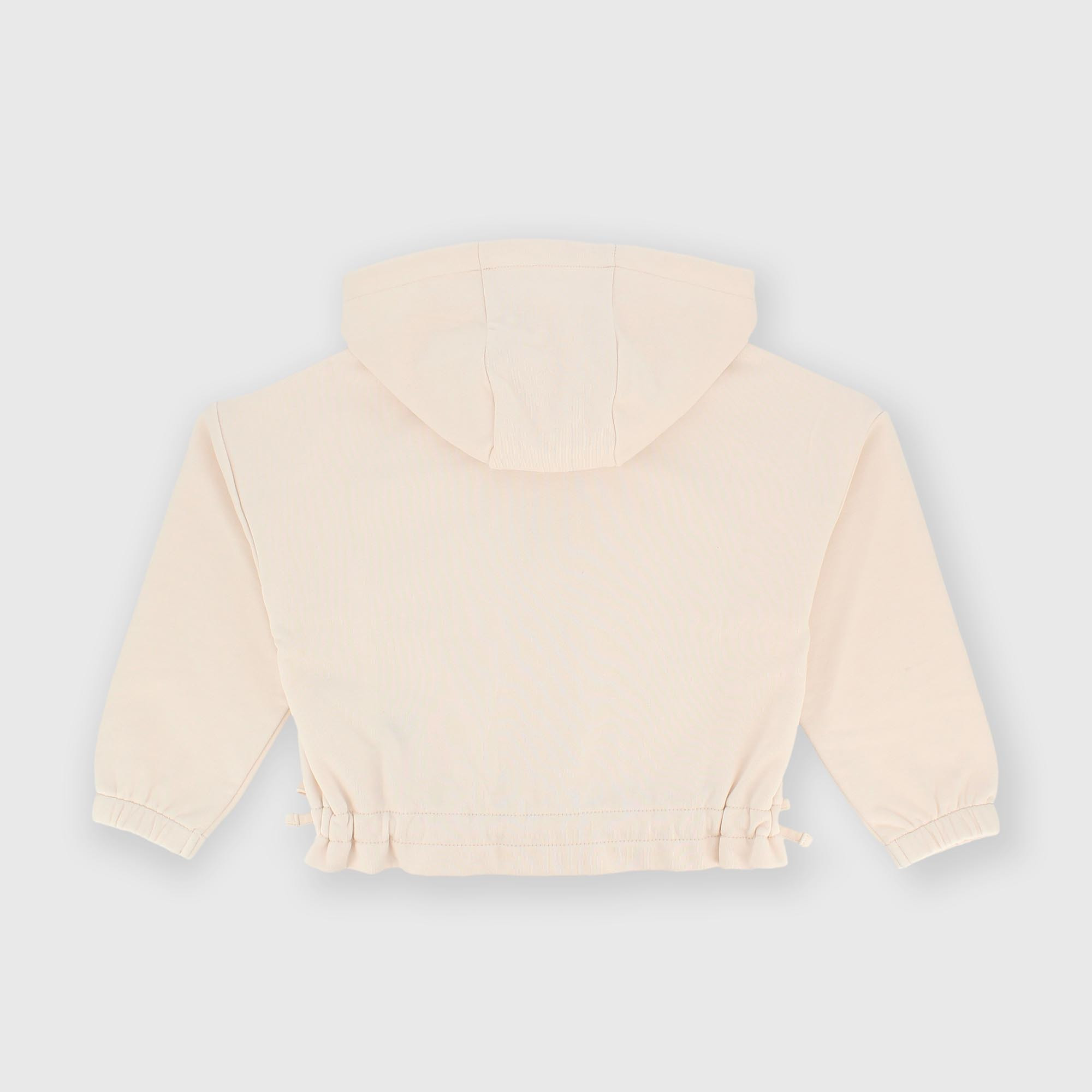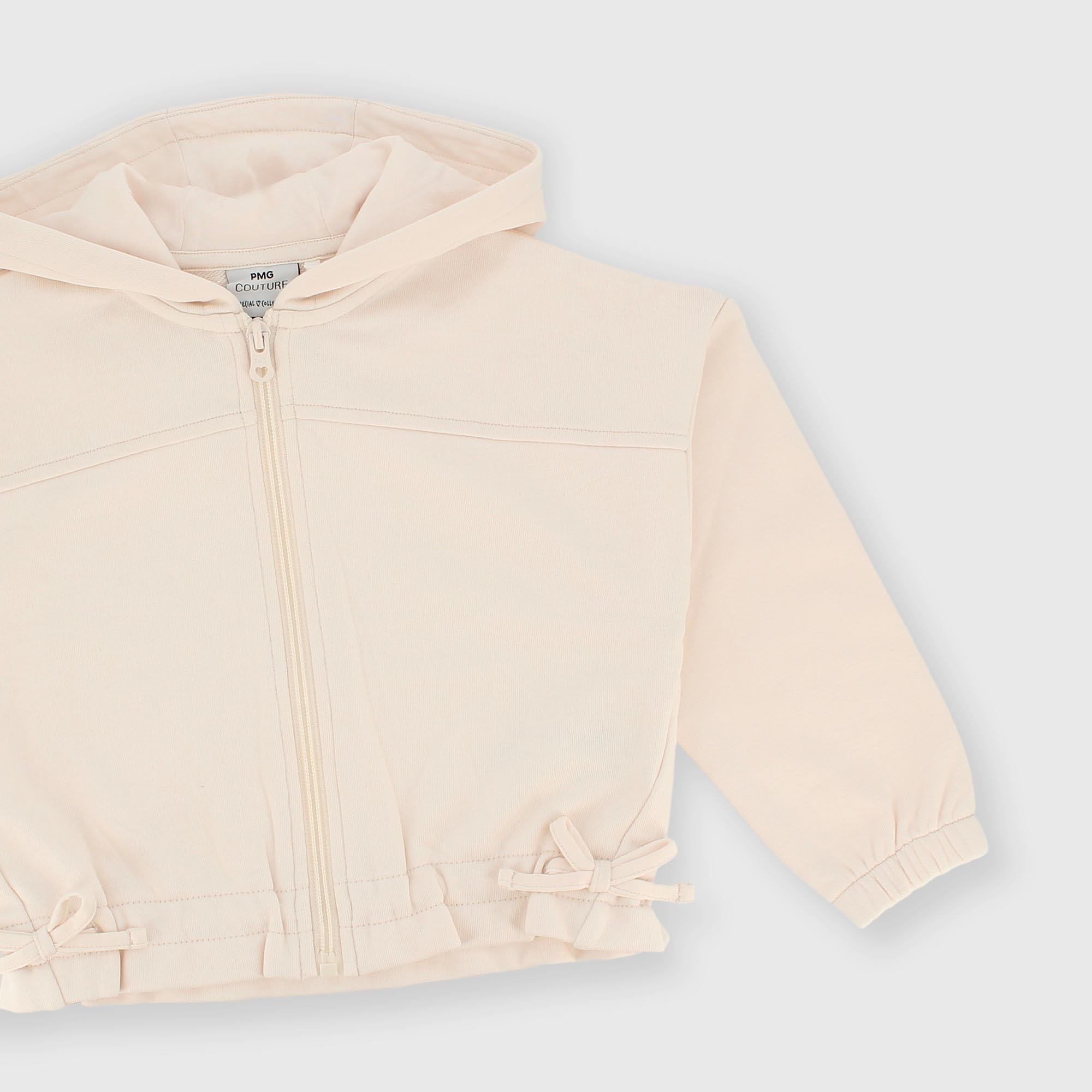 Sudadera con capucha y mangas largas. Cierre frontal con cremallera. Lazos laterales aplicados. Puños y bajo elásticos.