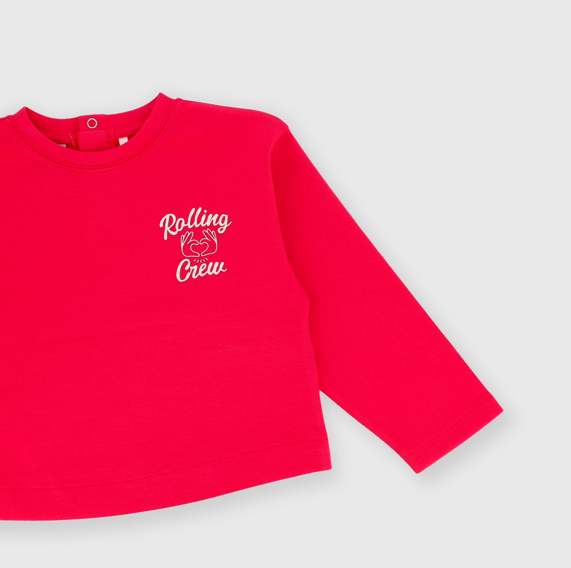 Sudadera de interlock de cuello redondo y mangas largas. Cierre con botones a presión en la espalda. Estampado efecto goma en el frente.