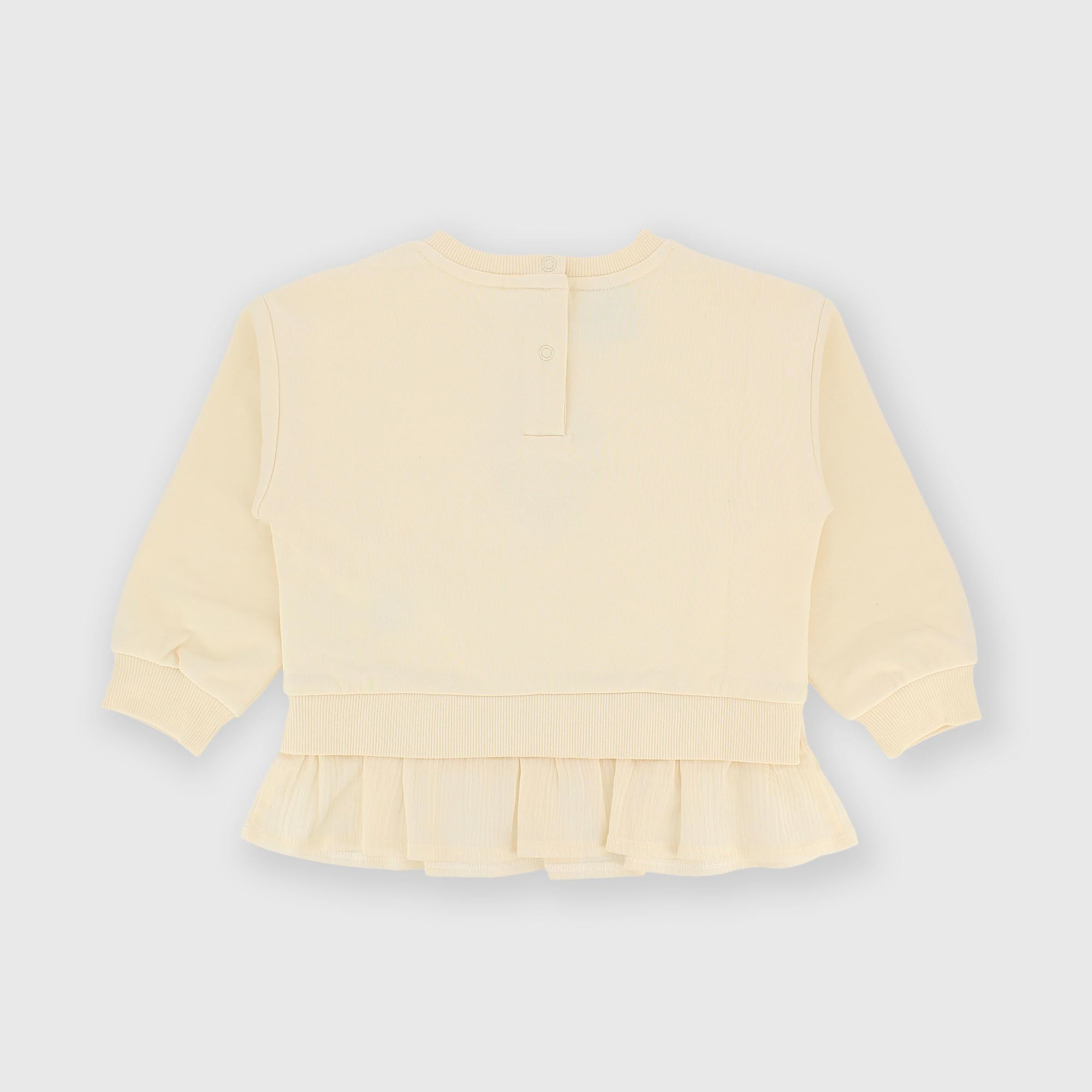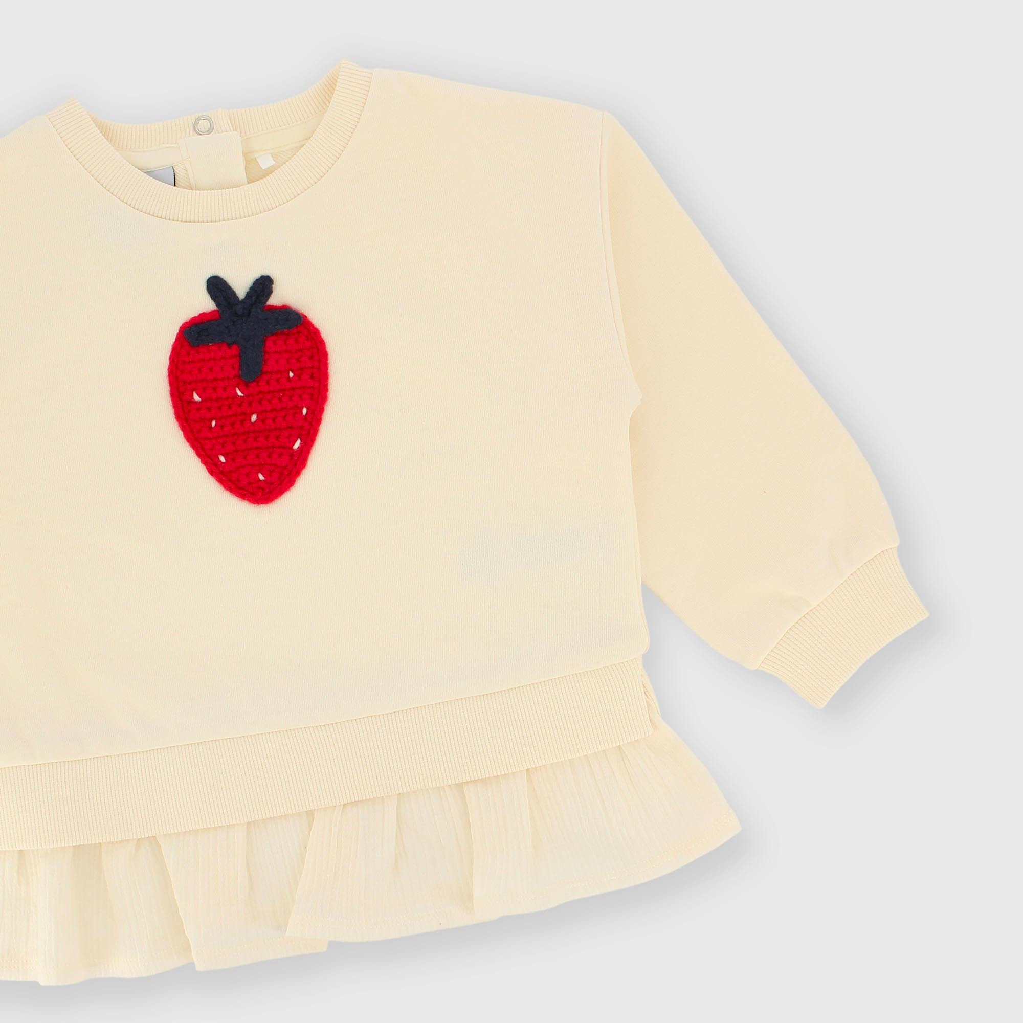 Sudadera de cuello redondo y mangas largas. Cierre trasero con botones a presión. Aplicaciones de fresa en el frente. Volante en gasa de algodón en el bajo. Cuello, puños y bajo de canalé.