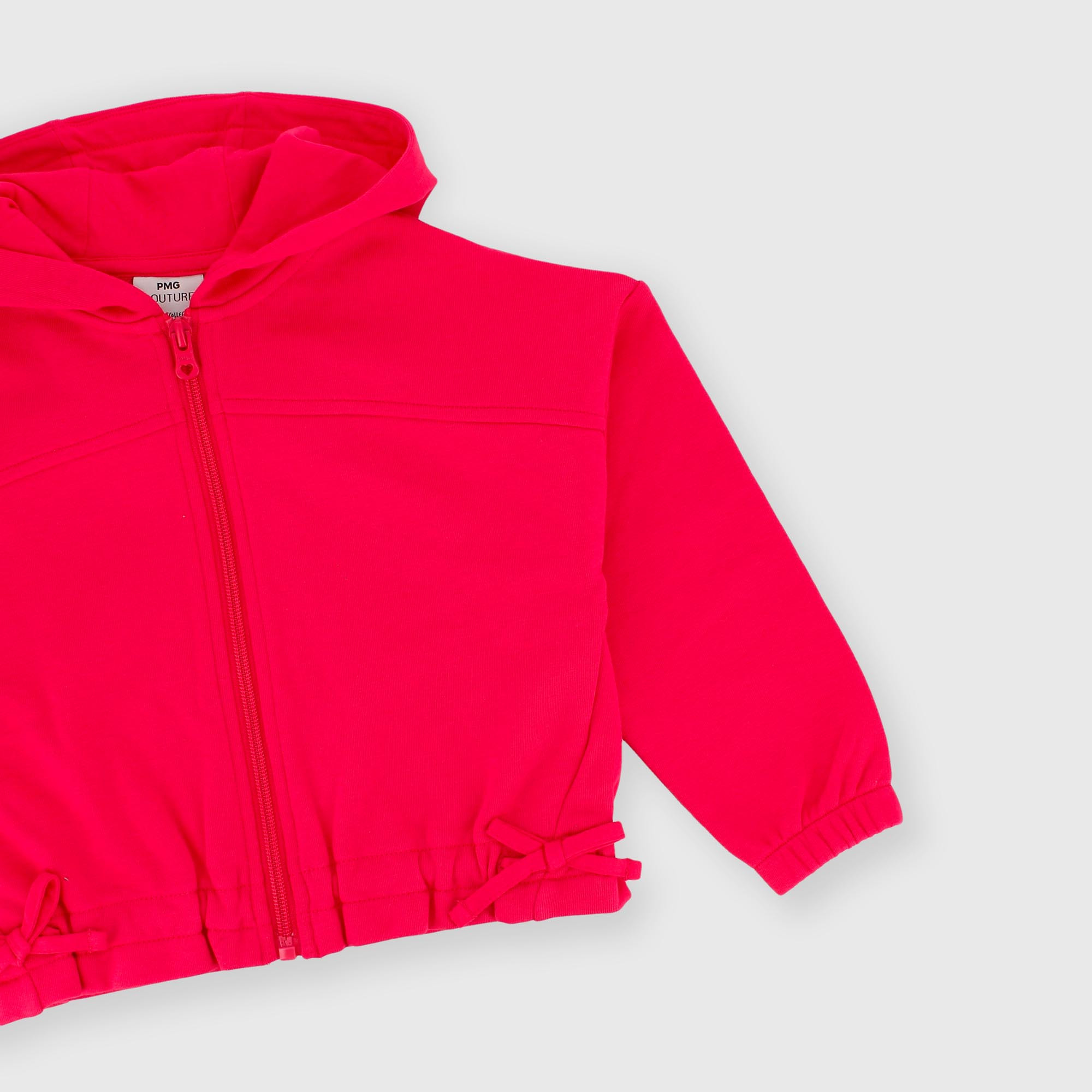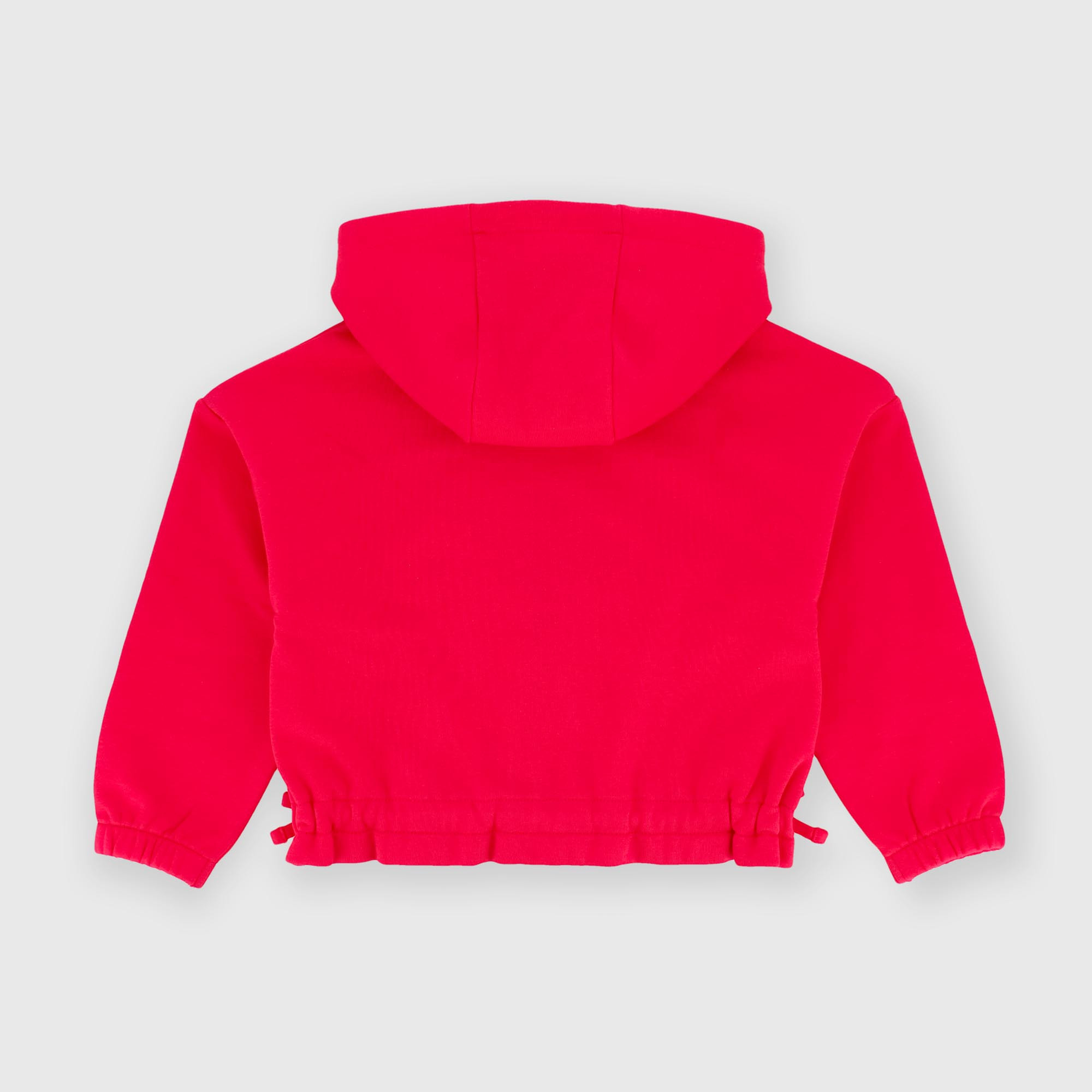 Sudadera con capucha y mangas largas. Cierre frontal con cremallera. Lazos laterales aplicados. Puños y bajo elásticos.