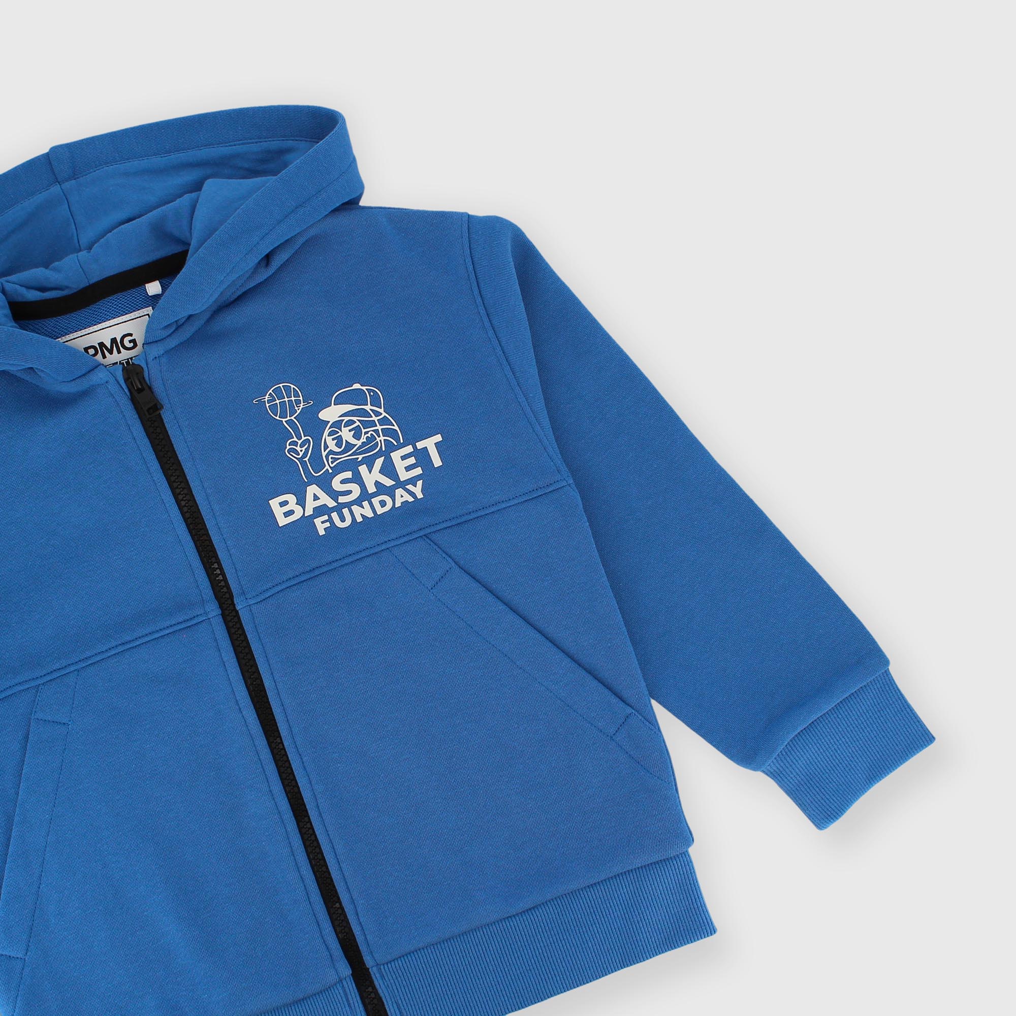 Sudadera con capucha y mangas largas. Cierre frontal con cremallera. Bolsillo tipo canguro. Estampado efecto goma en el pecho. Puños y bajo de canalé.