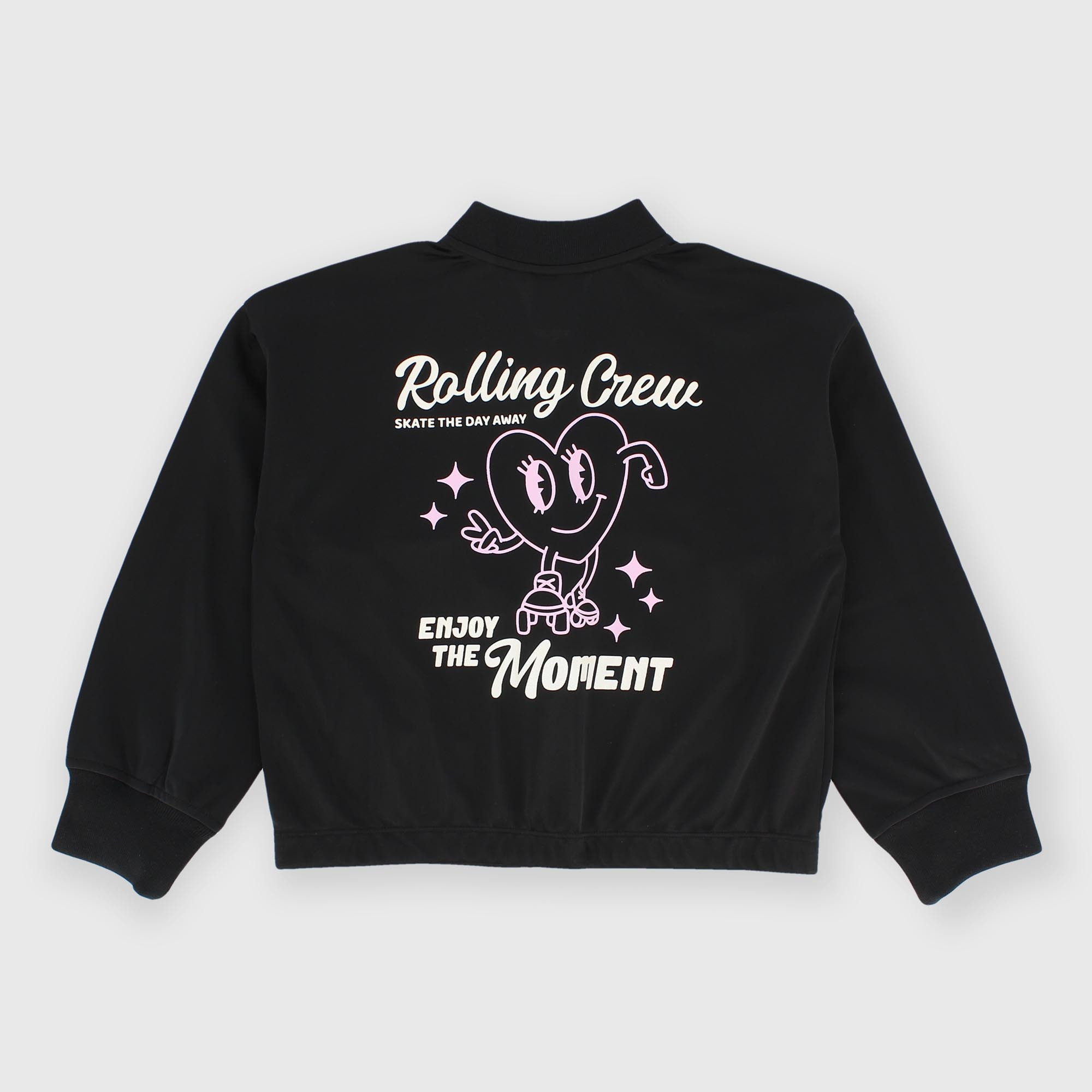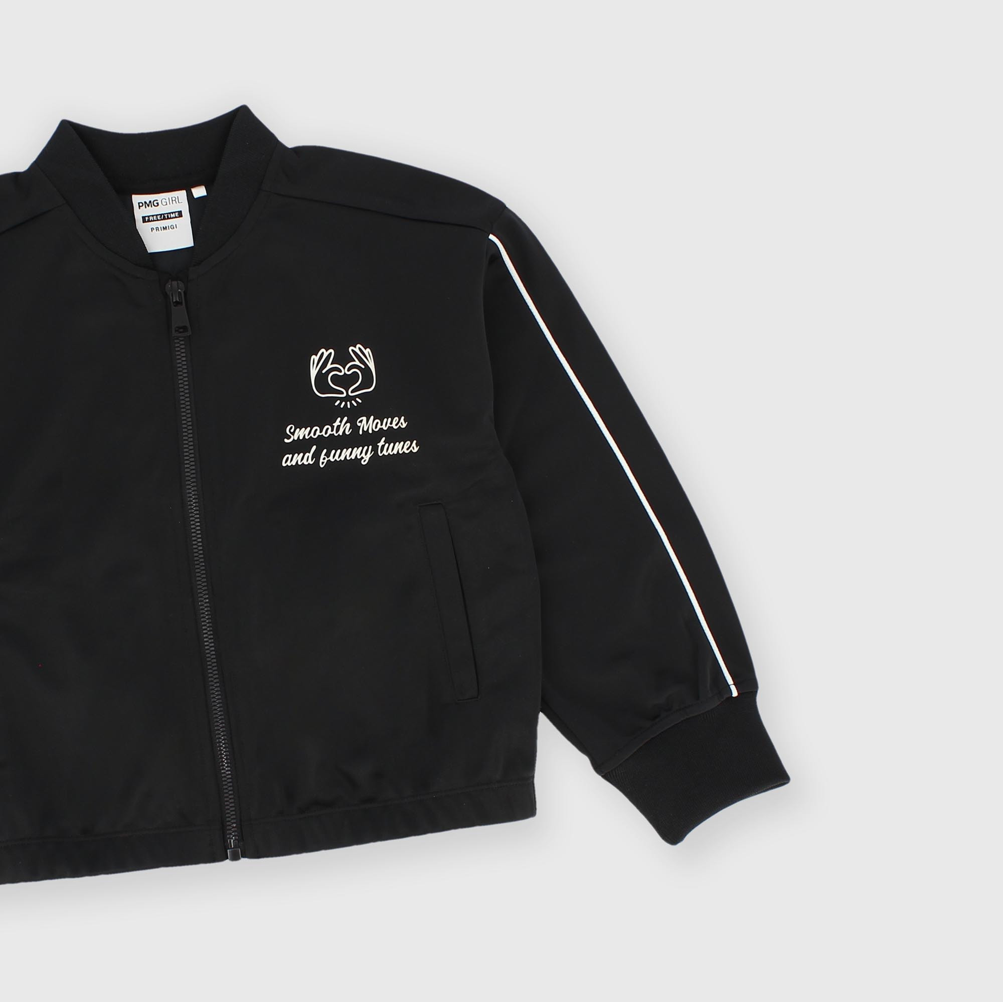 Sudadera de triacetato y mangas largas. Cierre frontal con cremallera. Bolsillos de ojal. Inserto en contraste en las mangas. Estampados efecto goma y con detalles glitter en el frente y en la espalda. Cuello y puños de canalé, bajo elástico.