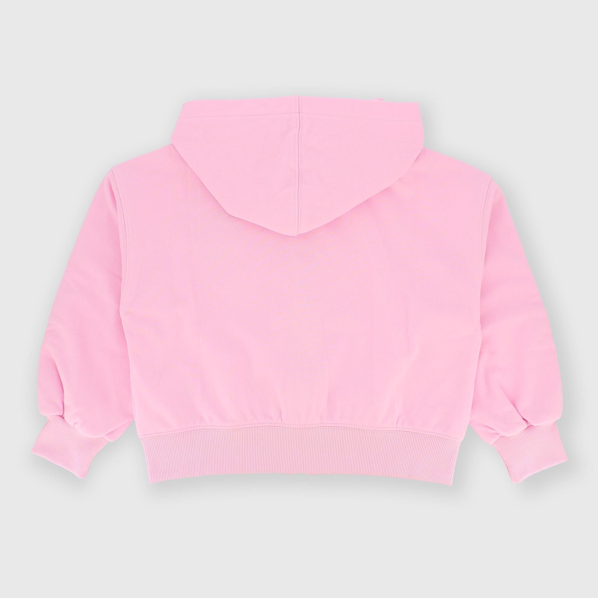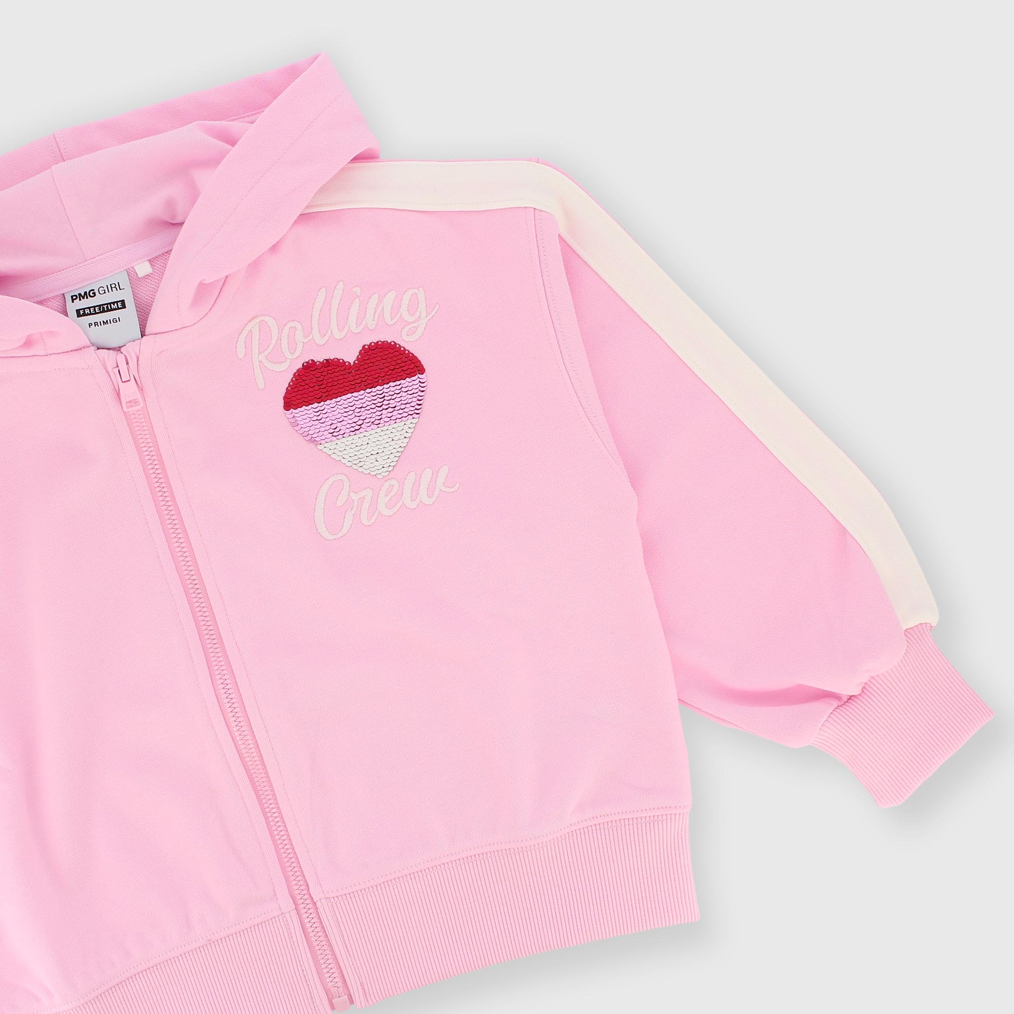 Sudadera con capucha y mangas largas. Cierre frontal con cremallera. Bordado con lentejuelas en el frente. Bandas en contraste aplicadas en las mangas. Puños y bajo de canalé.
