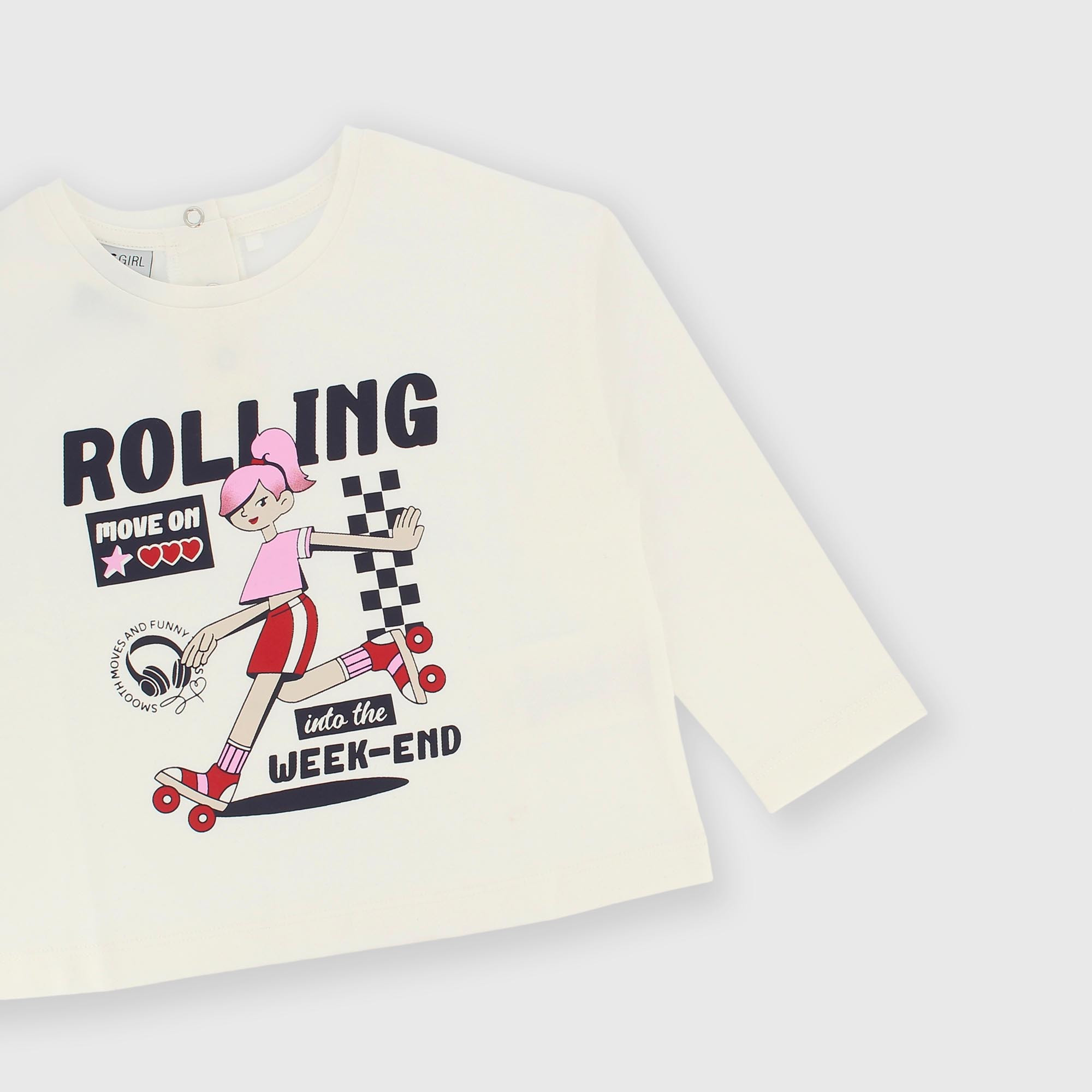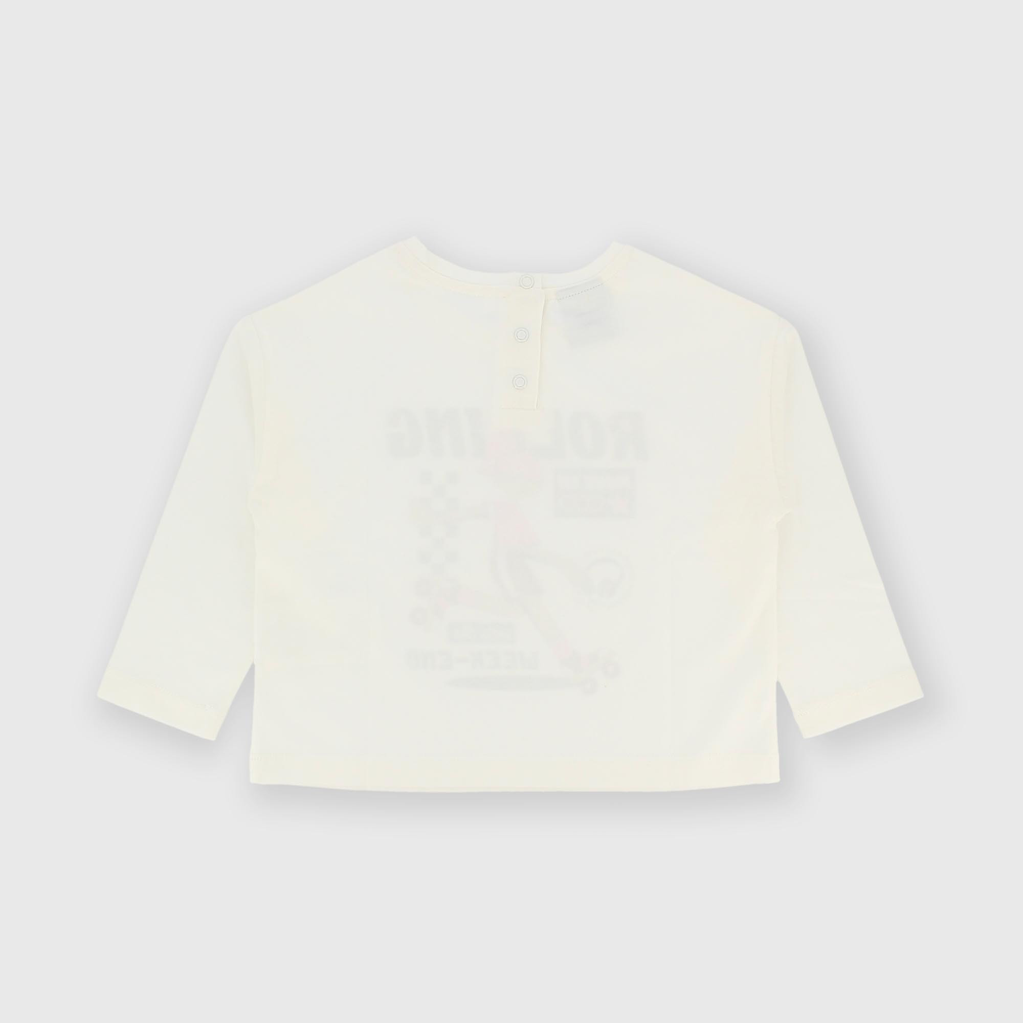 Camiseta de jersey, cuello redondo y manga larga. Cierre posterior con corchetes automáticos. Estampado en la parte delantera.