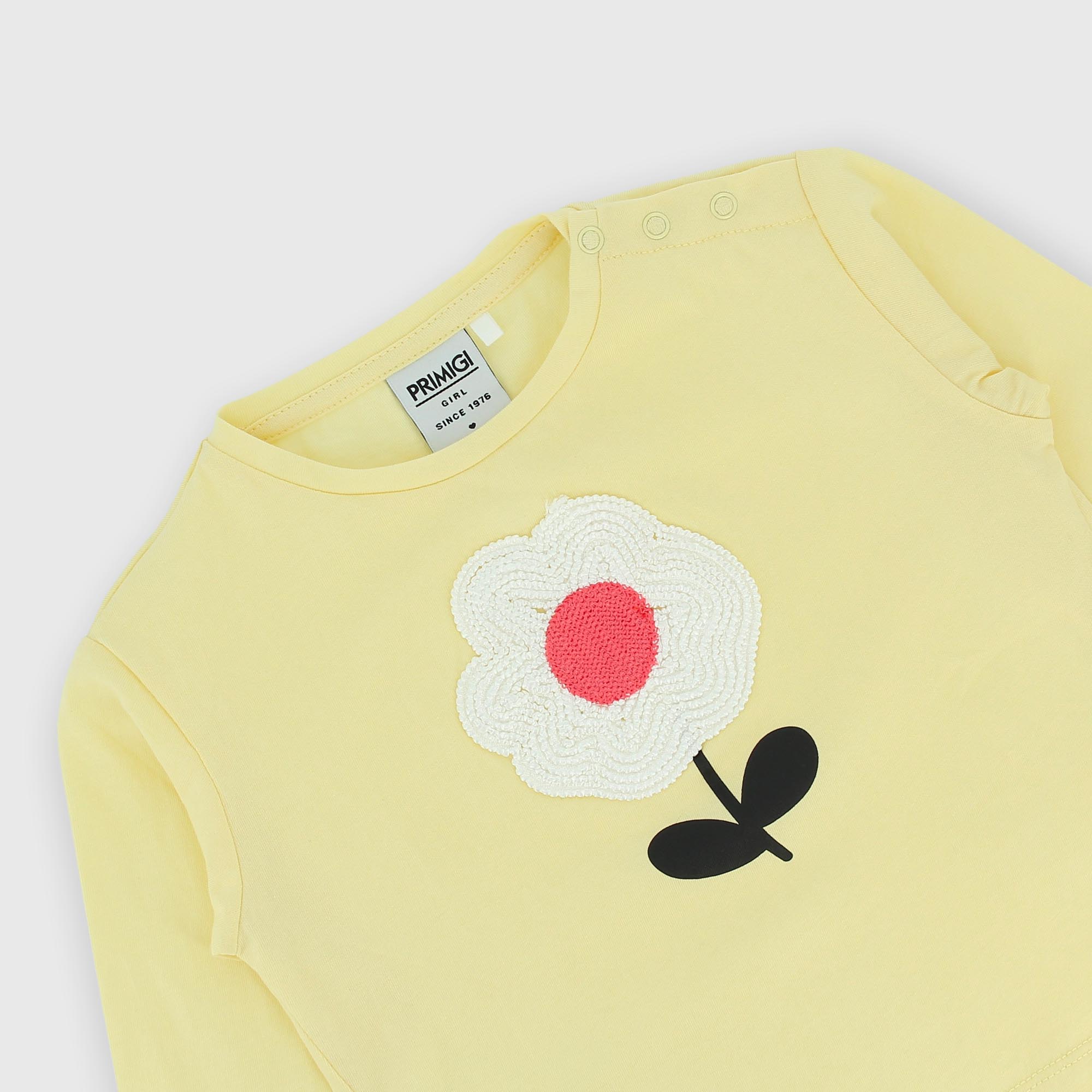 Camiseta de tejido Jersey, con cuello redondo, mangas largas. Cierre con botones automáticos en el hombro. Adorno de flor bordada en la parte delantera. Pequeños cortes laterales en la parte inferior.