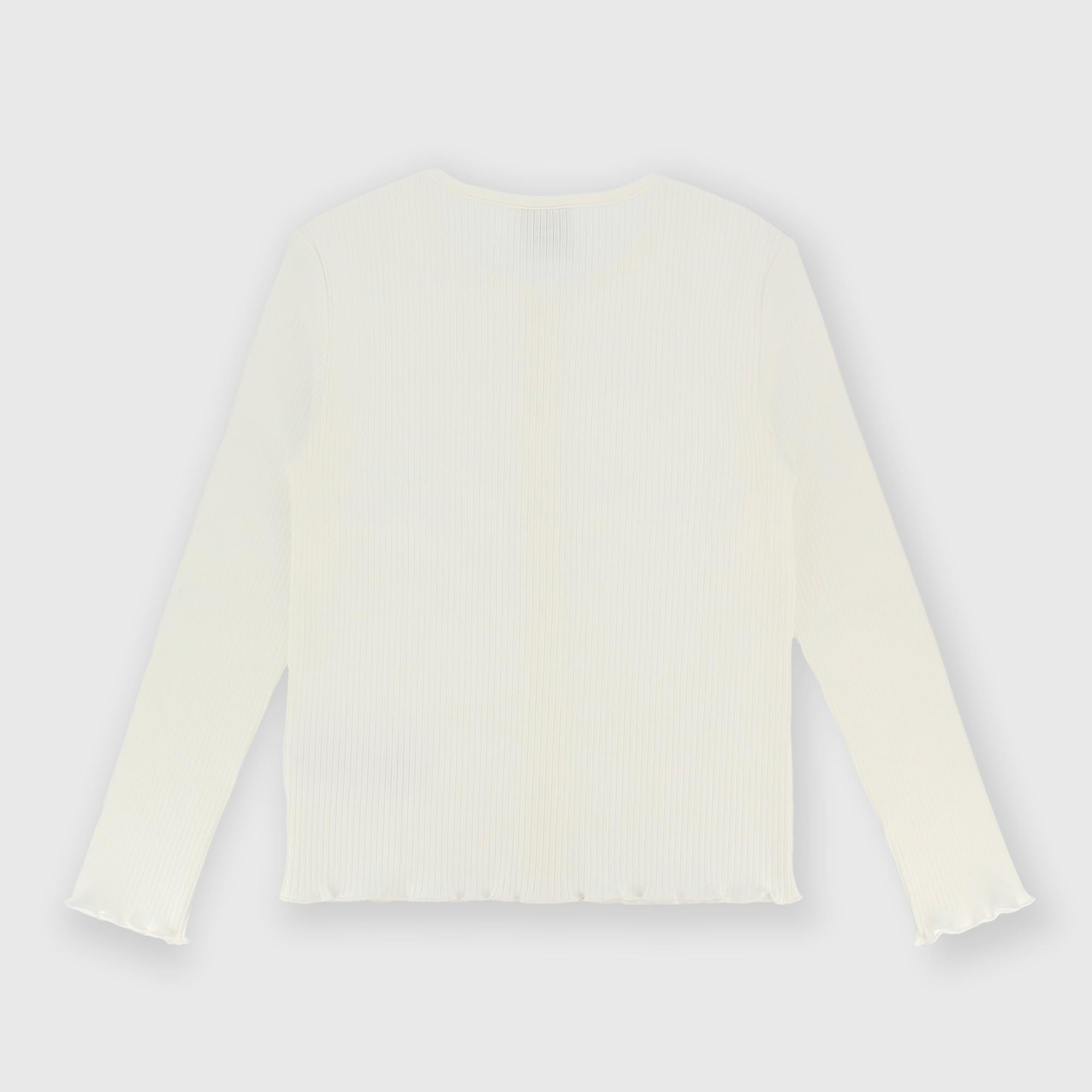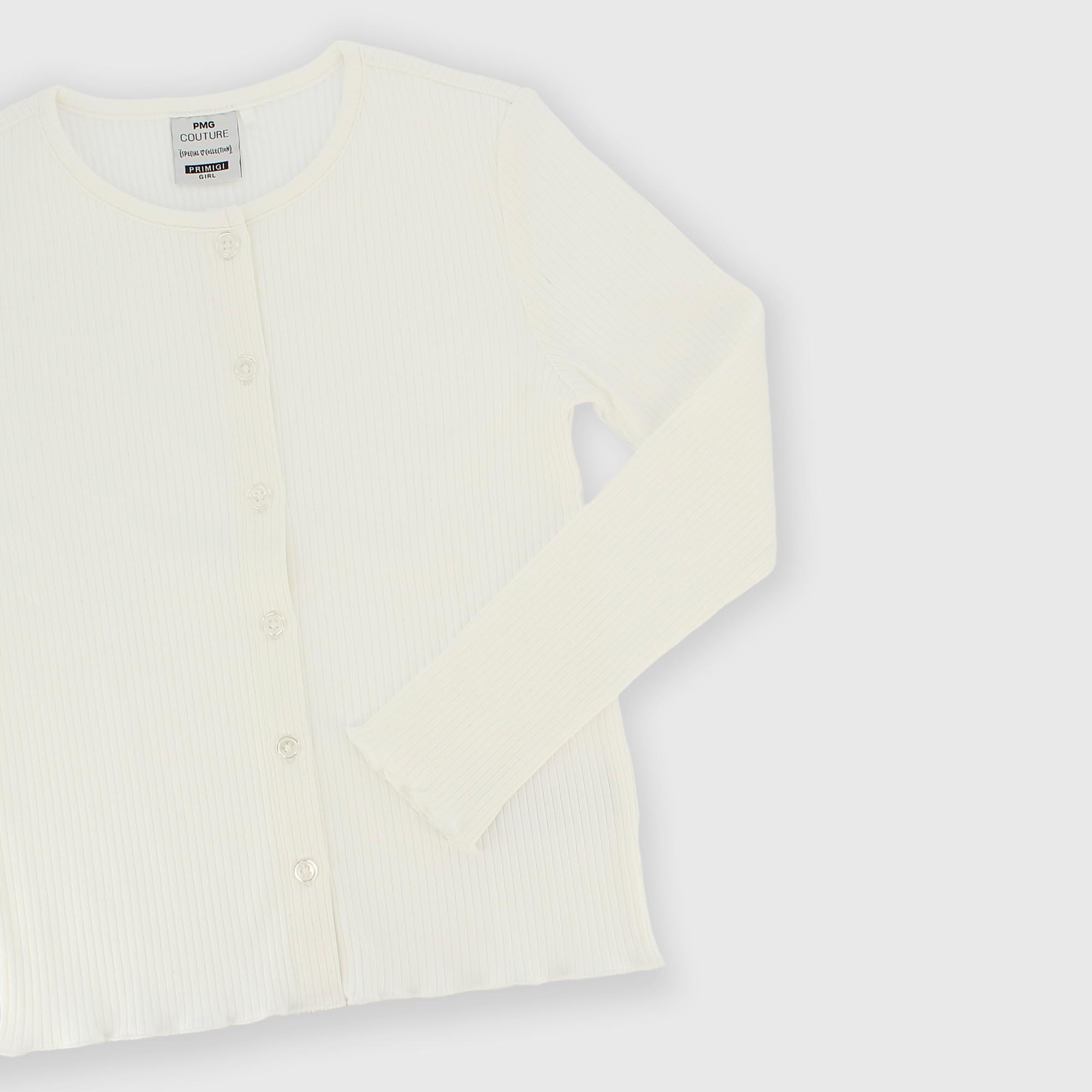 Rebeca canalé, cuello redondo. Cierre con botones en la parte delantera. Acabado con punto bambola.