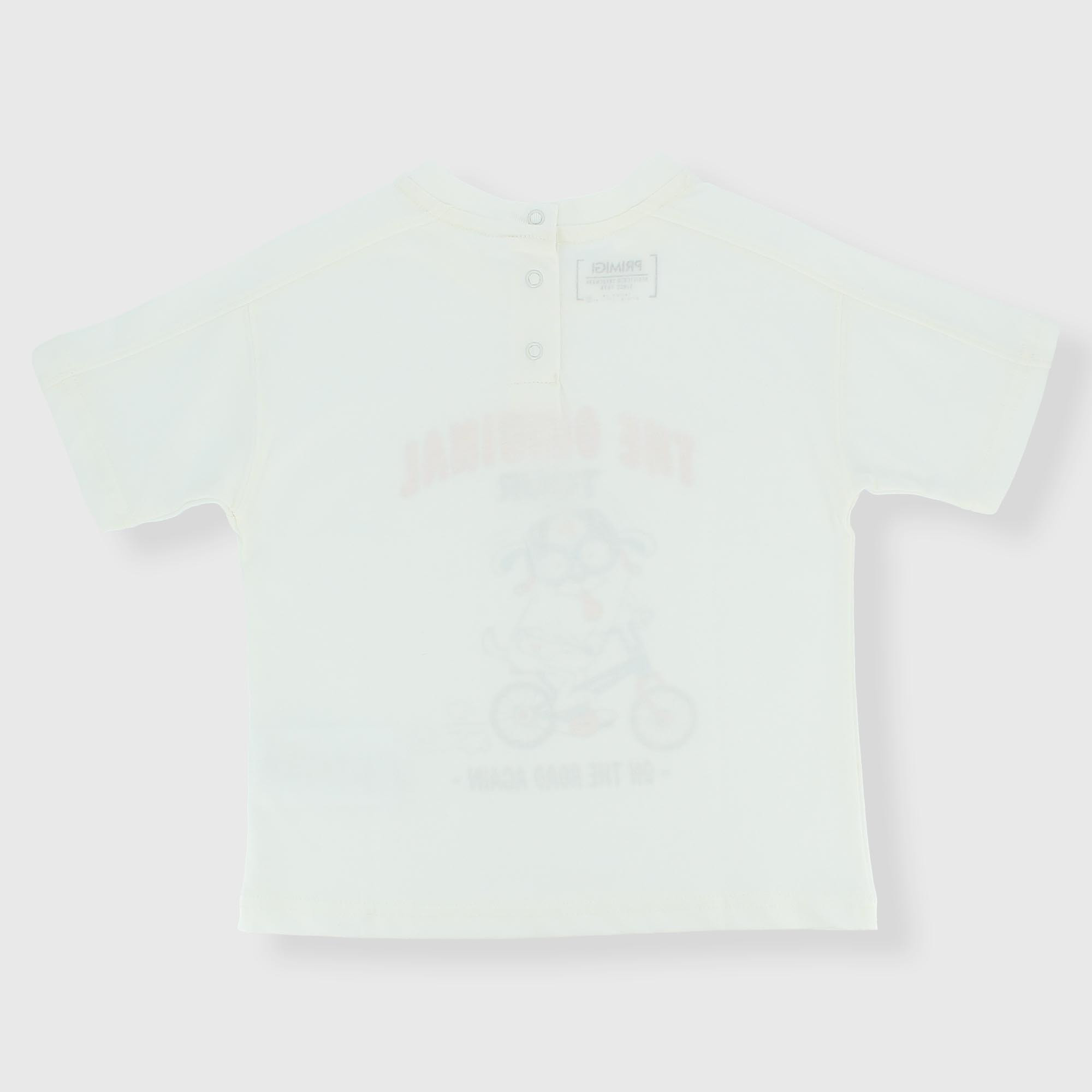Camiseta de tejido Jersey, con cuello redondo, mangas cortas. Cierre con botones automáticos en la parte posterior. Estampado con detalles efecto goma en la parte delantera.