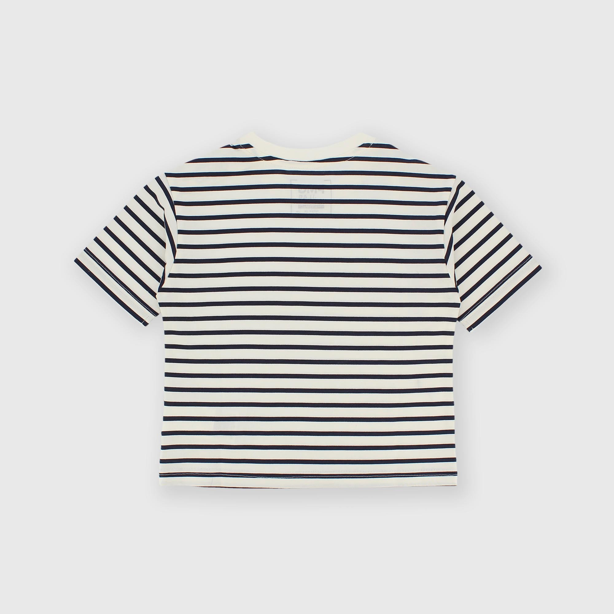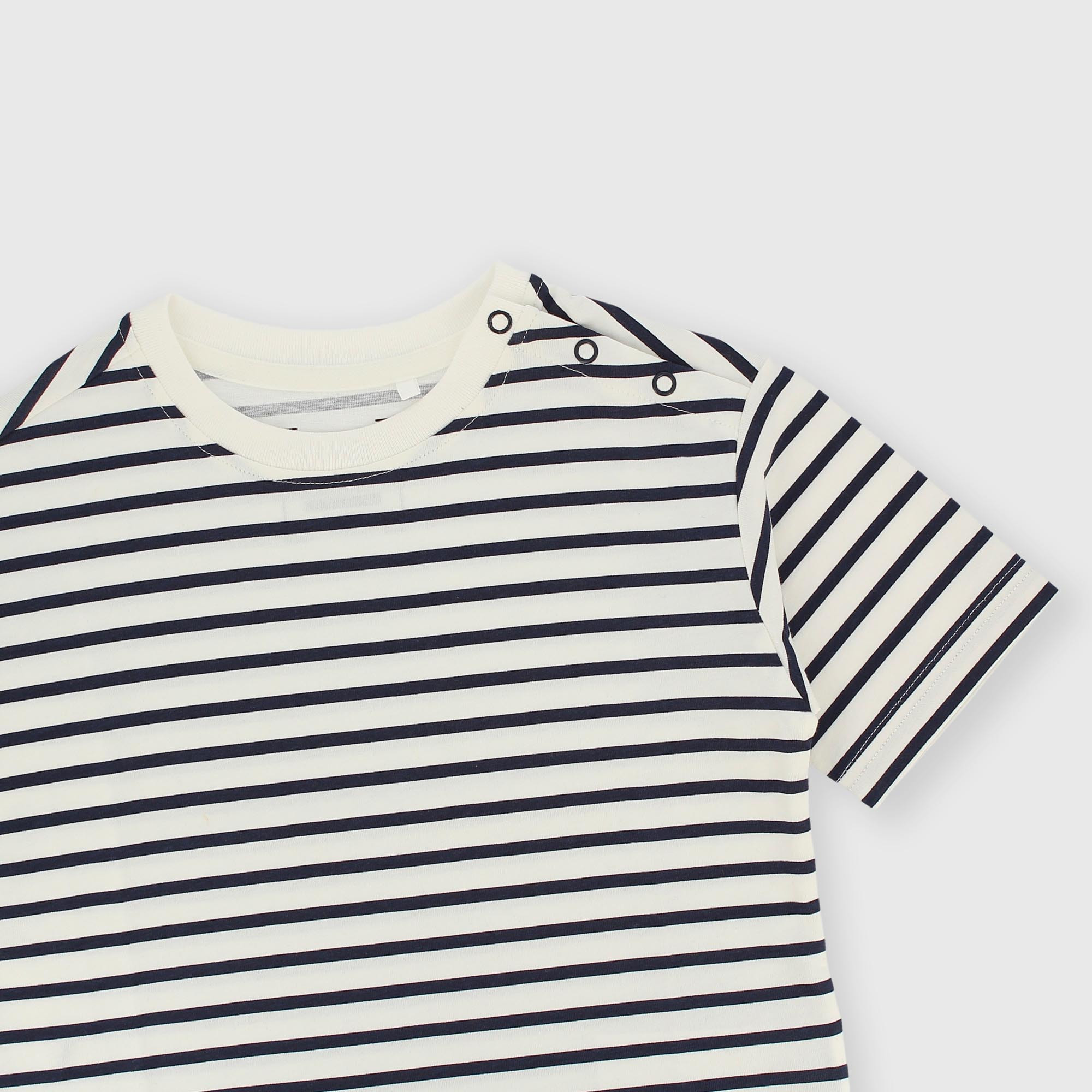 Camiseta de jersey a rayas, cuello redondo y manga corta. Cierre con botones en el hombro.