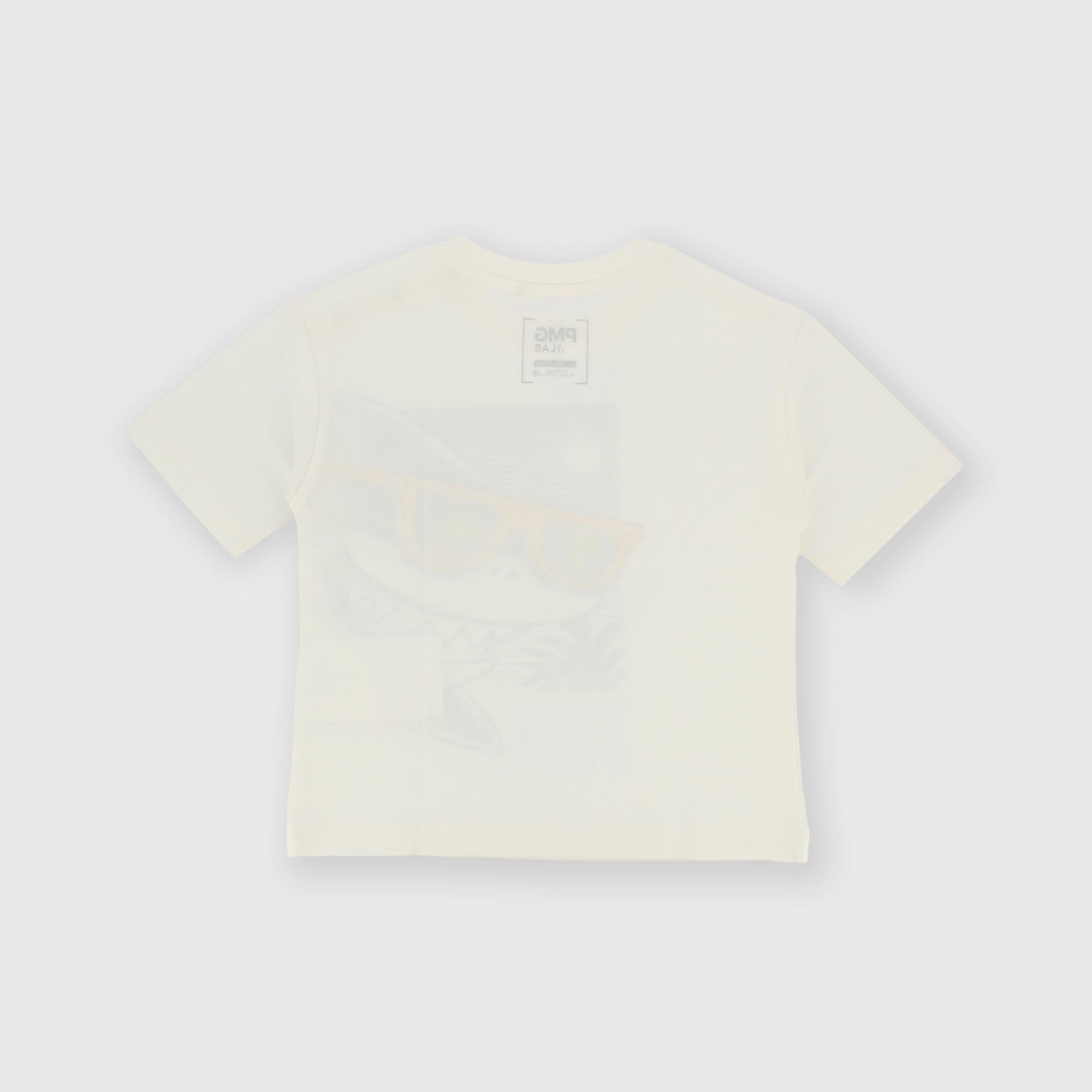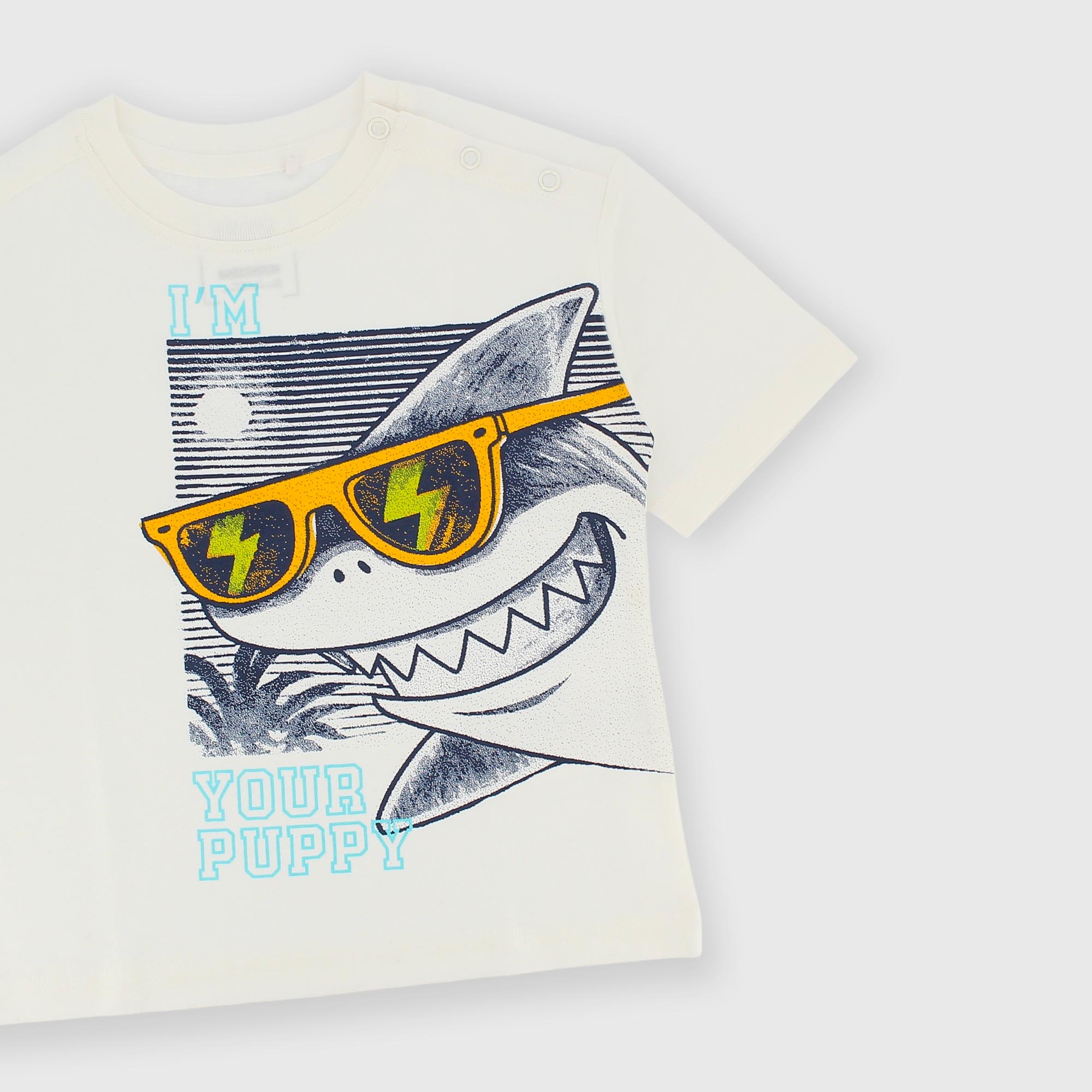 Camiseta de jersey, cuello redondo y manga corta. Cierre con corchetes automáticos en el hombro. Estampado en la parte delantera.