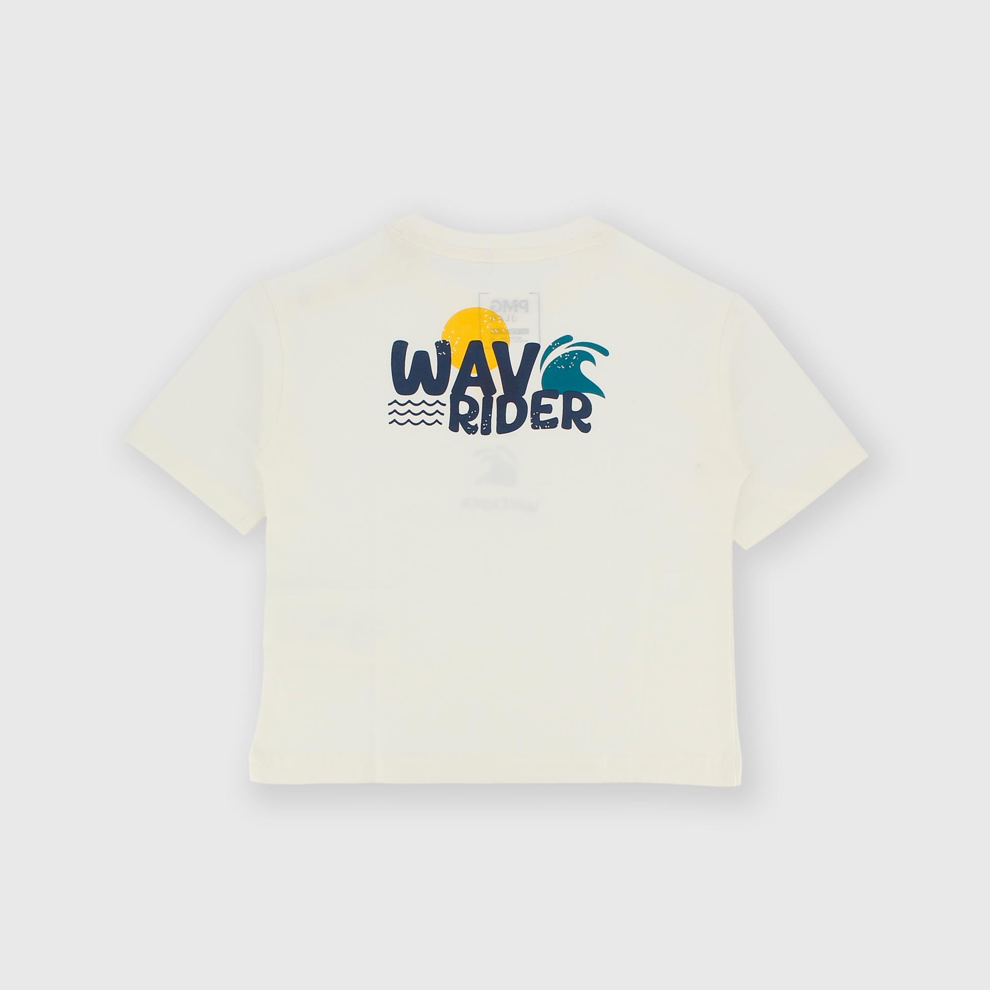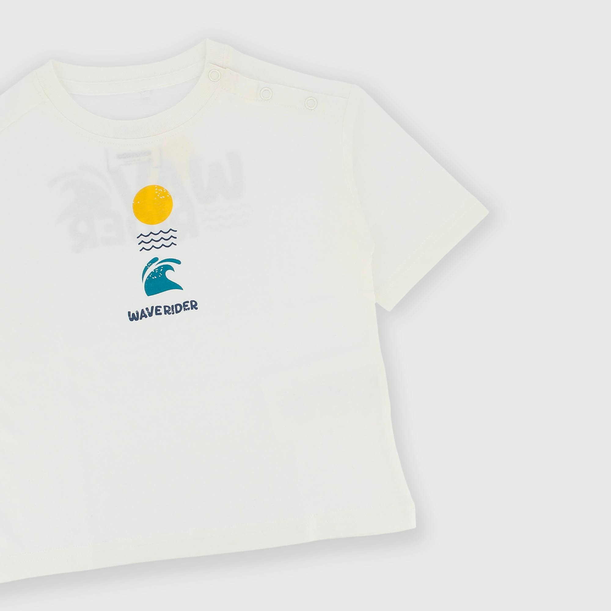 Camiseta de jersey, cuello redondo y manga corta. Cierre con corchetes automáticos en el hombro. Estampado en la parte delantera y trasera.
