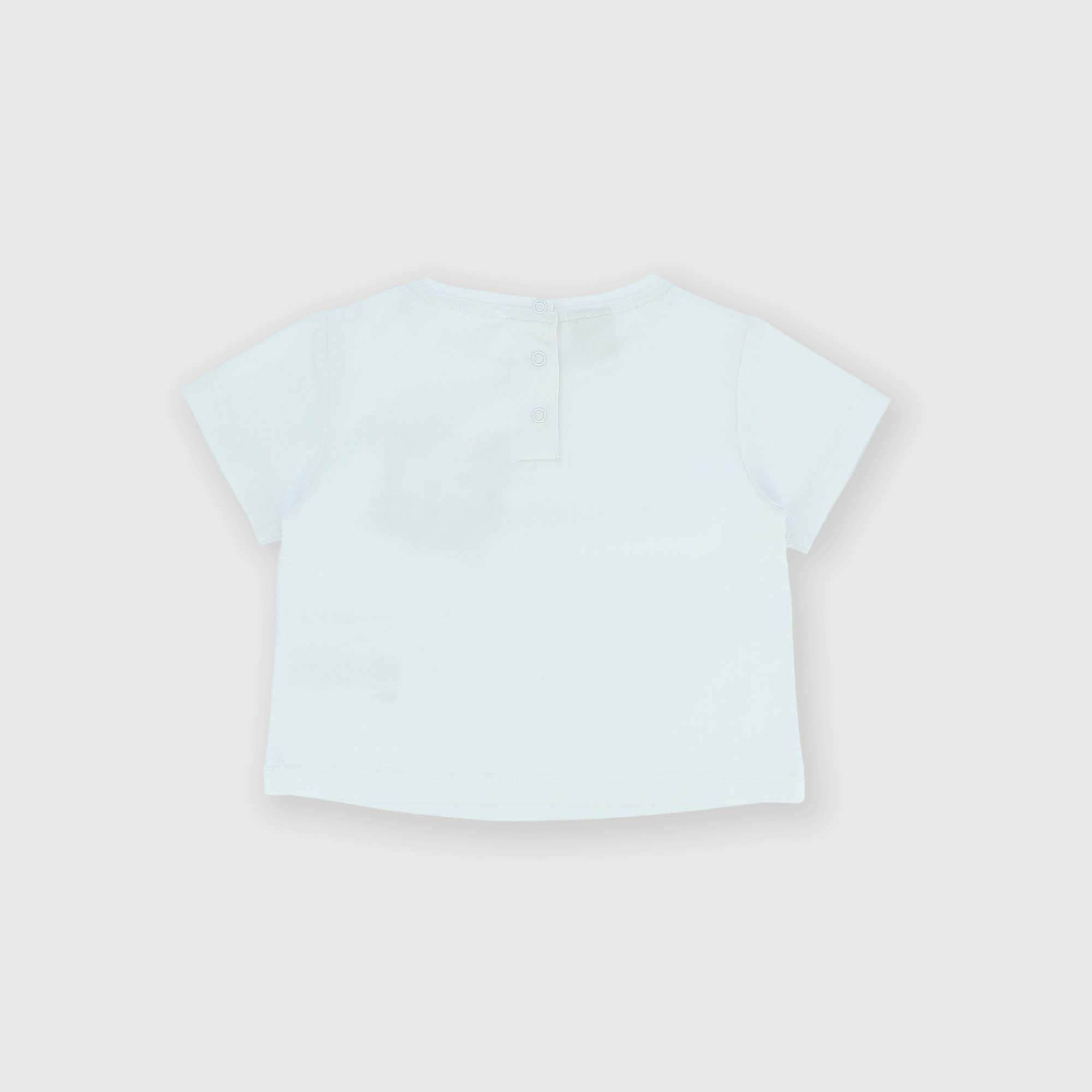 Camiseta de tejido Jersey, con cuello redondo, mangas cortas. Cierre con botones automáticos en el hombro. Bolsillo en contraste en el pecho con volantes alrededor.