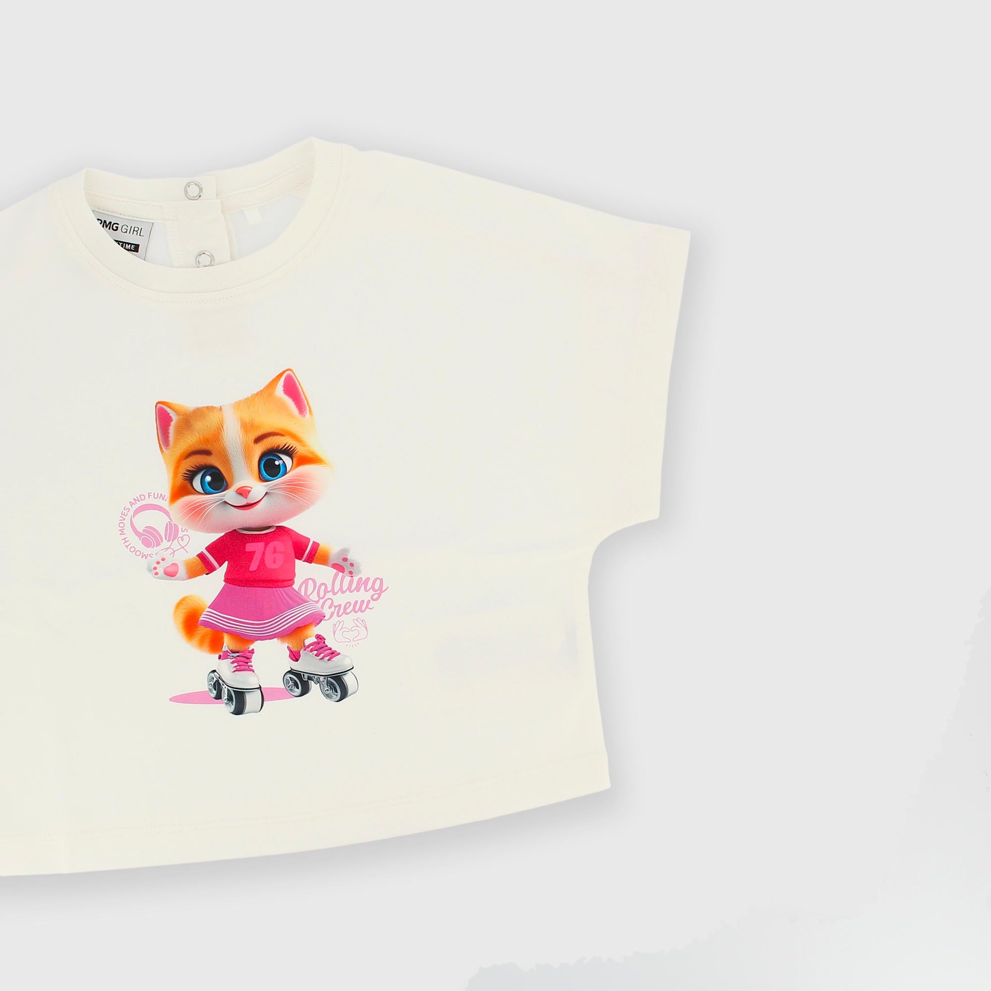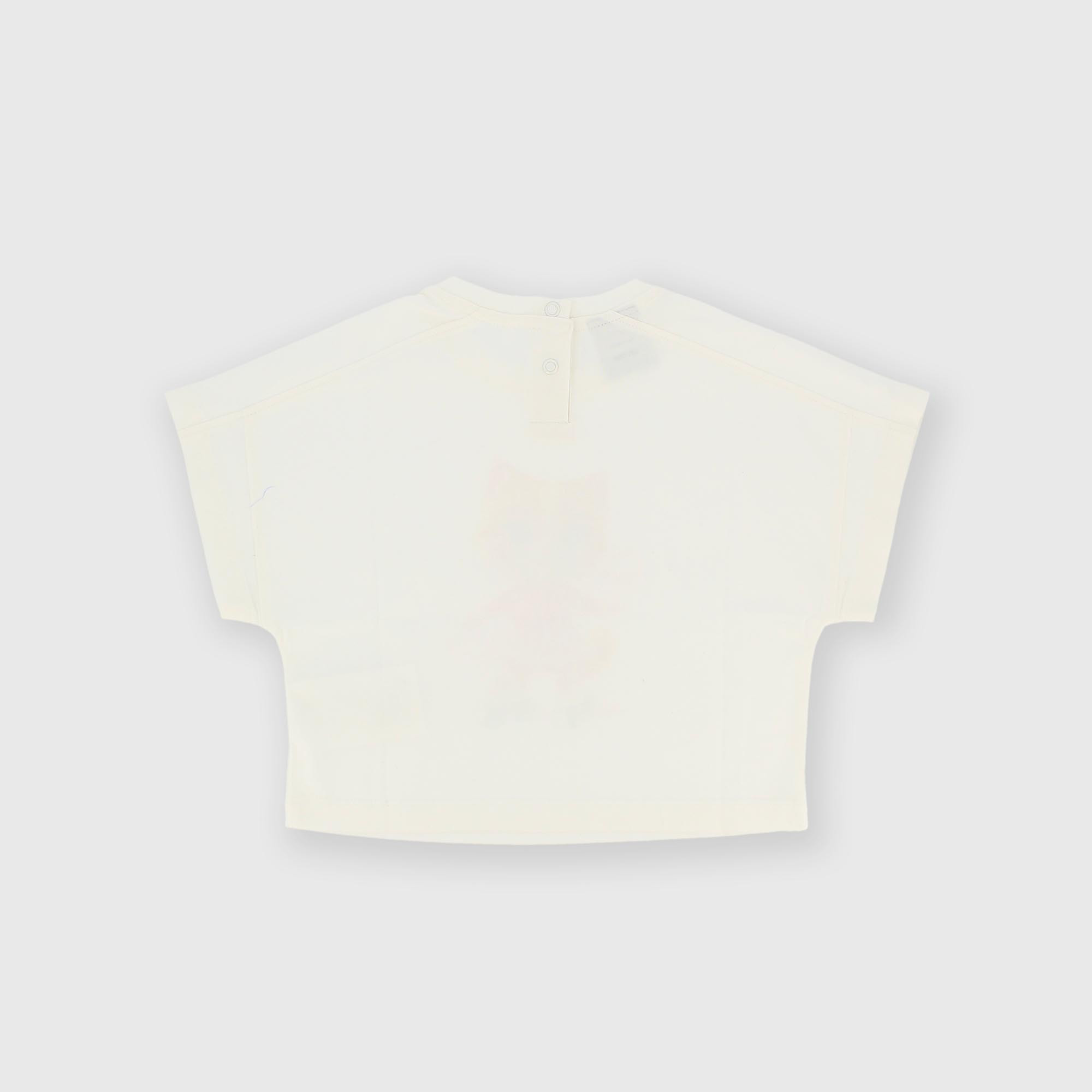 Camiseta de jersey, cuello redondo y manga corta. Cierre con corchetes automáticos en la parte posterior. Estampado en la parte delantera.