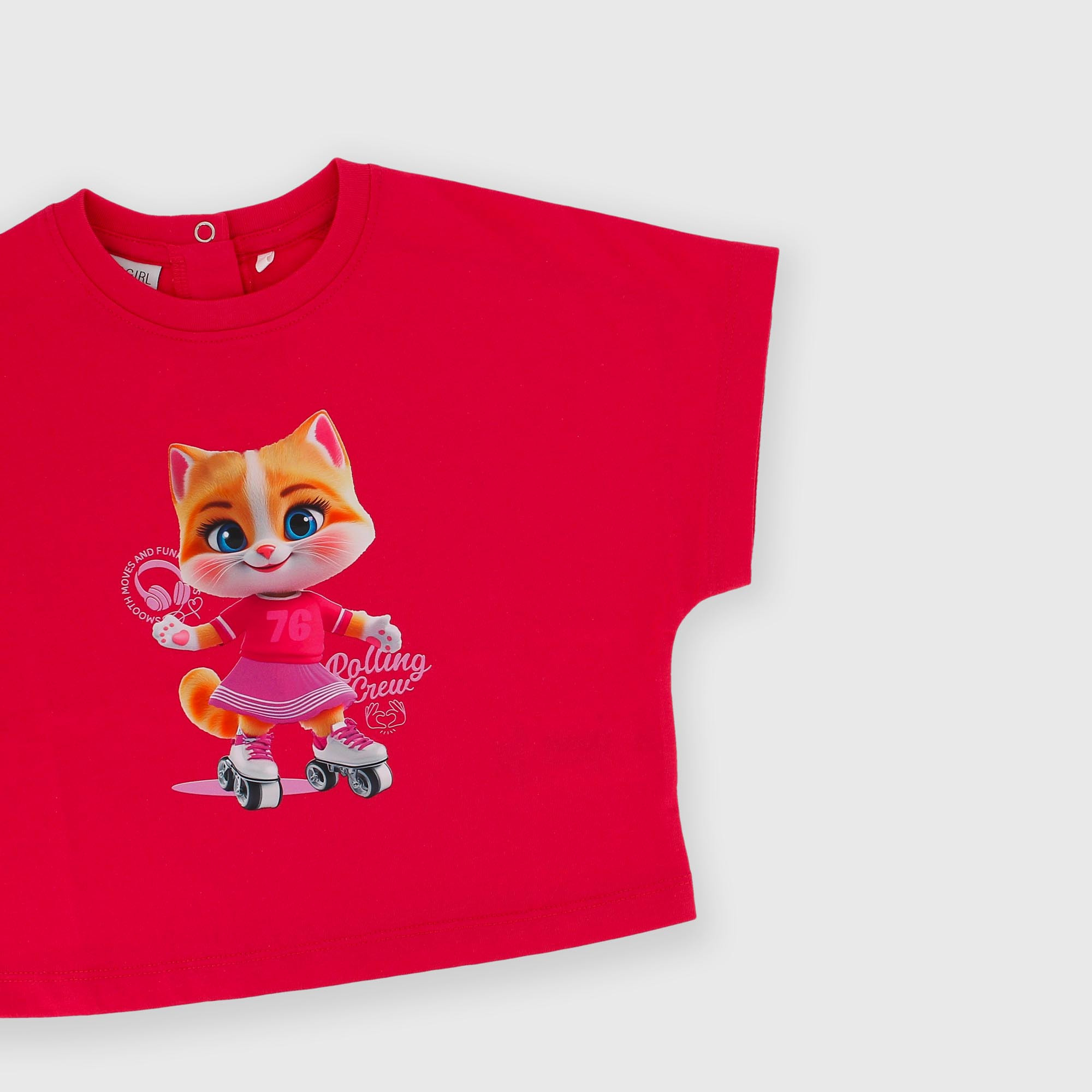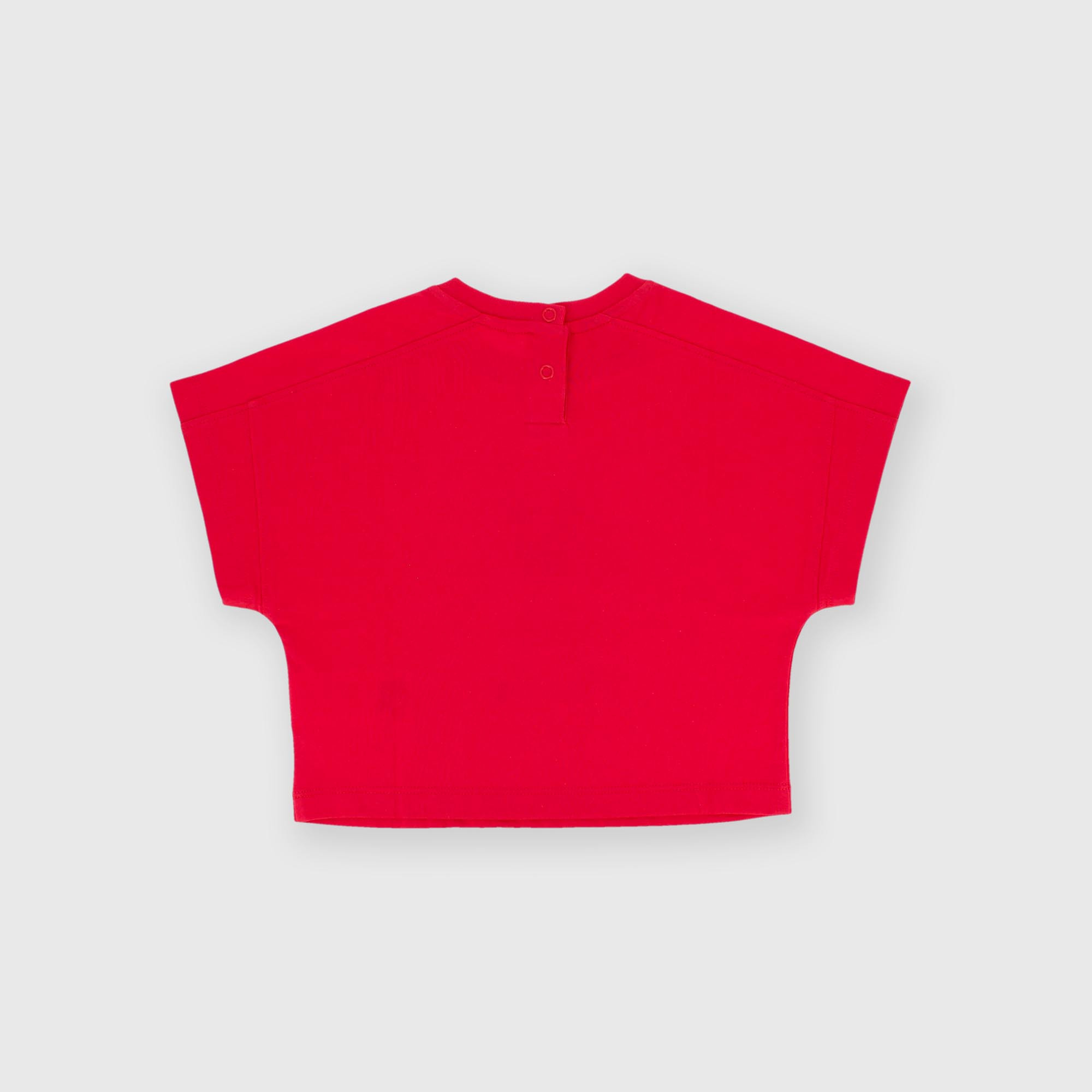 Camiseta de jersey, cuello redondo y manga corta. Cierre con corchetes automáticos en la parte posterior. Estampado en la parte delantera.