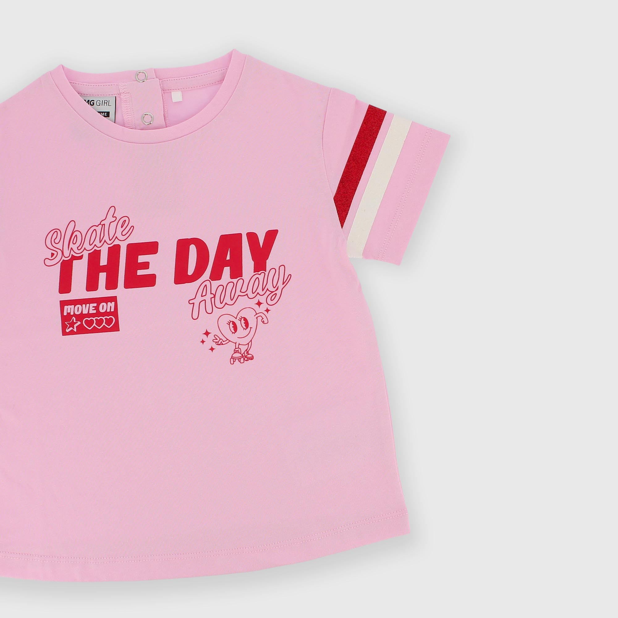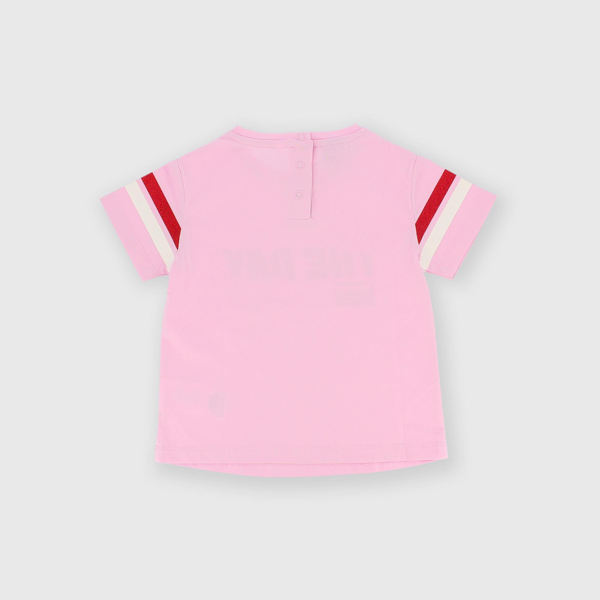 Camiseta de jersey, cuello redondo y manga corta con bandas brillantes en contraste. Cierre con corchetes automáticos en la parte posterior. Estampado en la parte delantera.
