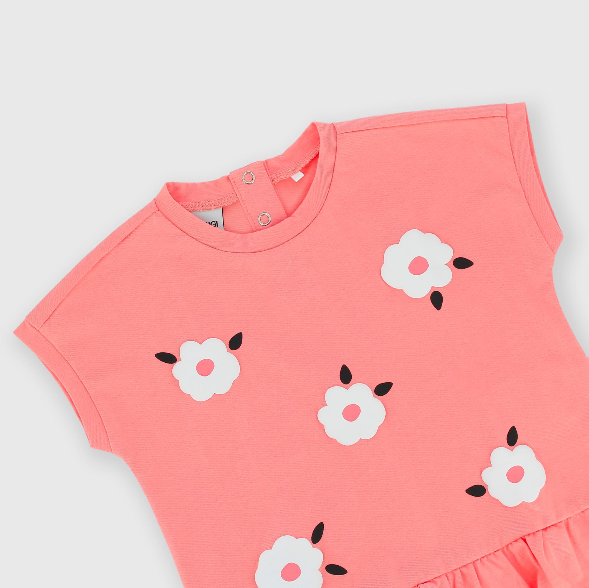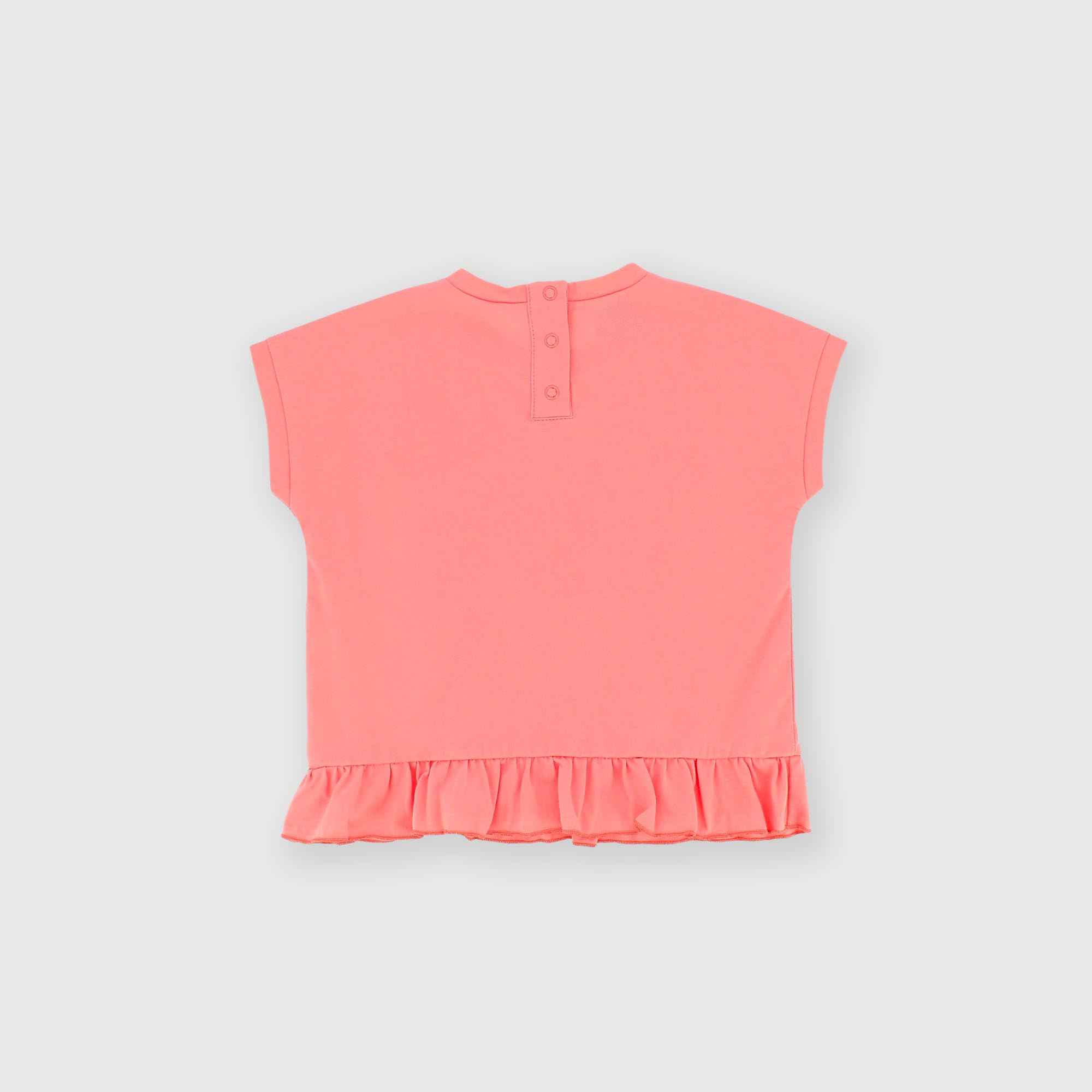 Camiseta de tejido Jersey, con cuello redondo, mangas cortas. Cierre con botones automáticos en la parte posterior. Flores efecto goma estampadas en la parte anterior. Volante aplicado en la parte inferior.