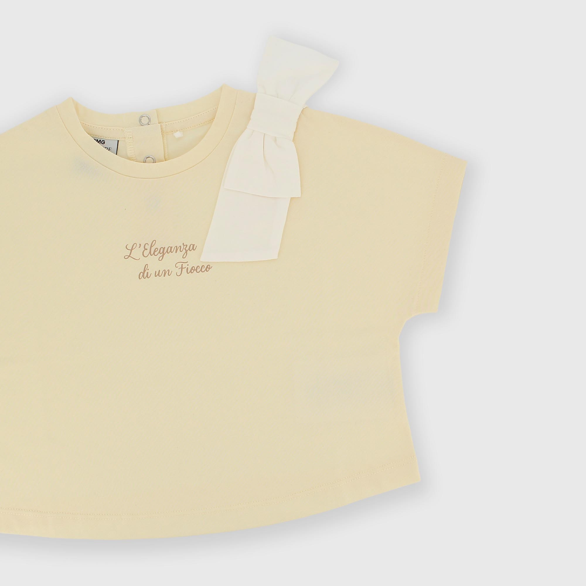 Camiseta de jersey, cuello redondo y manga corta. Cierre posterior con corchetes automáticos. Estampado en la parte delantera. Lazo aplicado en el hombro.
