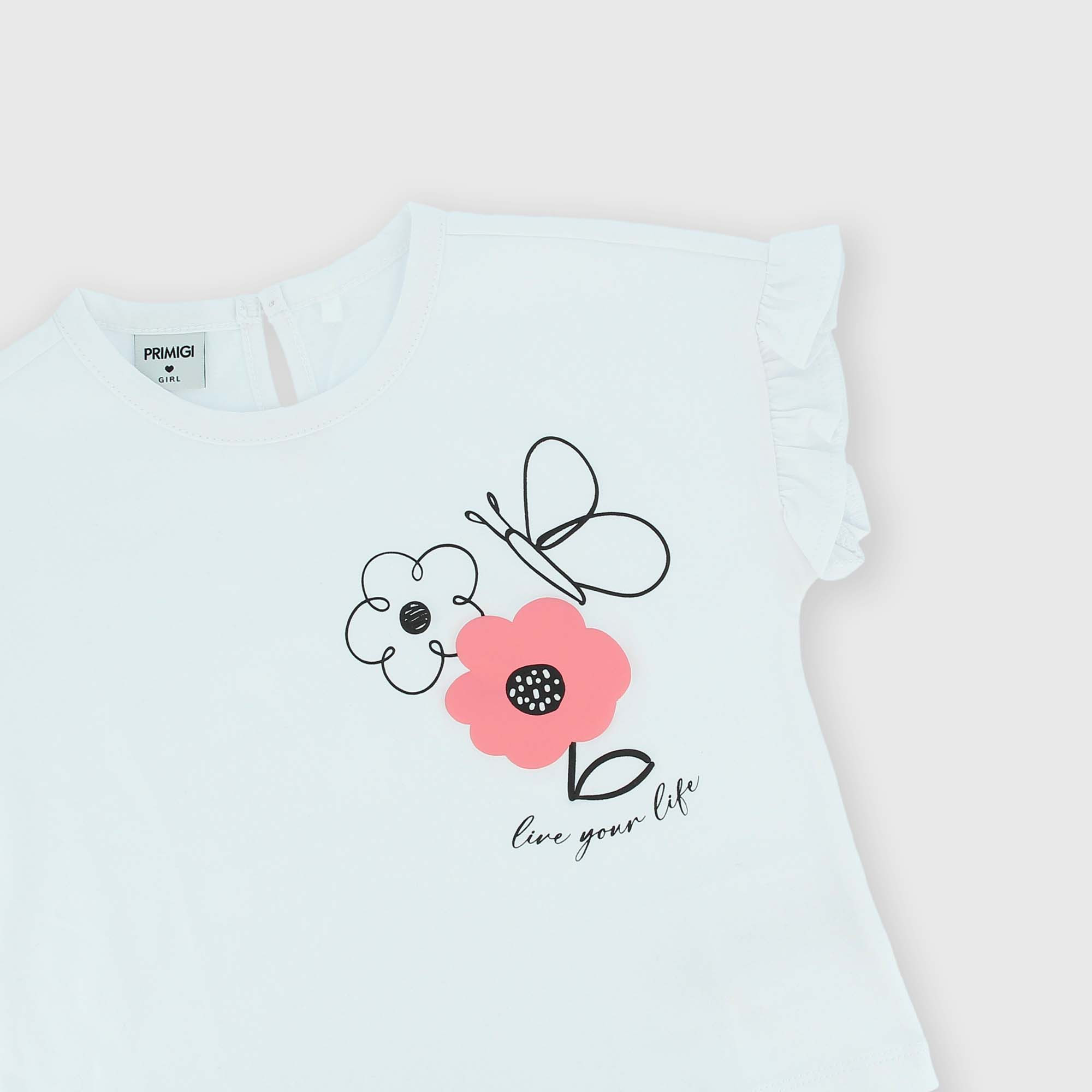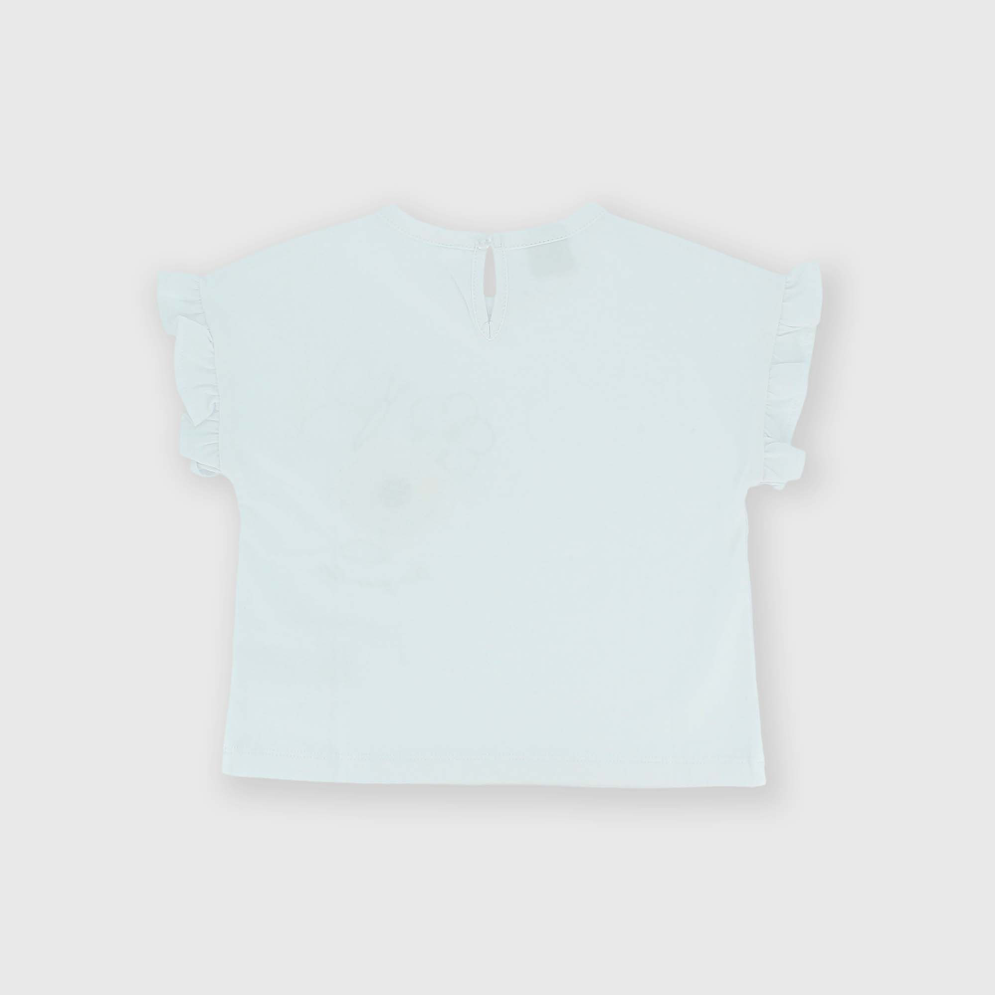 Camiseta de tejido Jersey, con cuello redondo, mangas cortas con volantes. Cierre con botones automáticos en la parte posterior. Parte delantera estampada efecto goma.