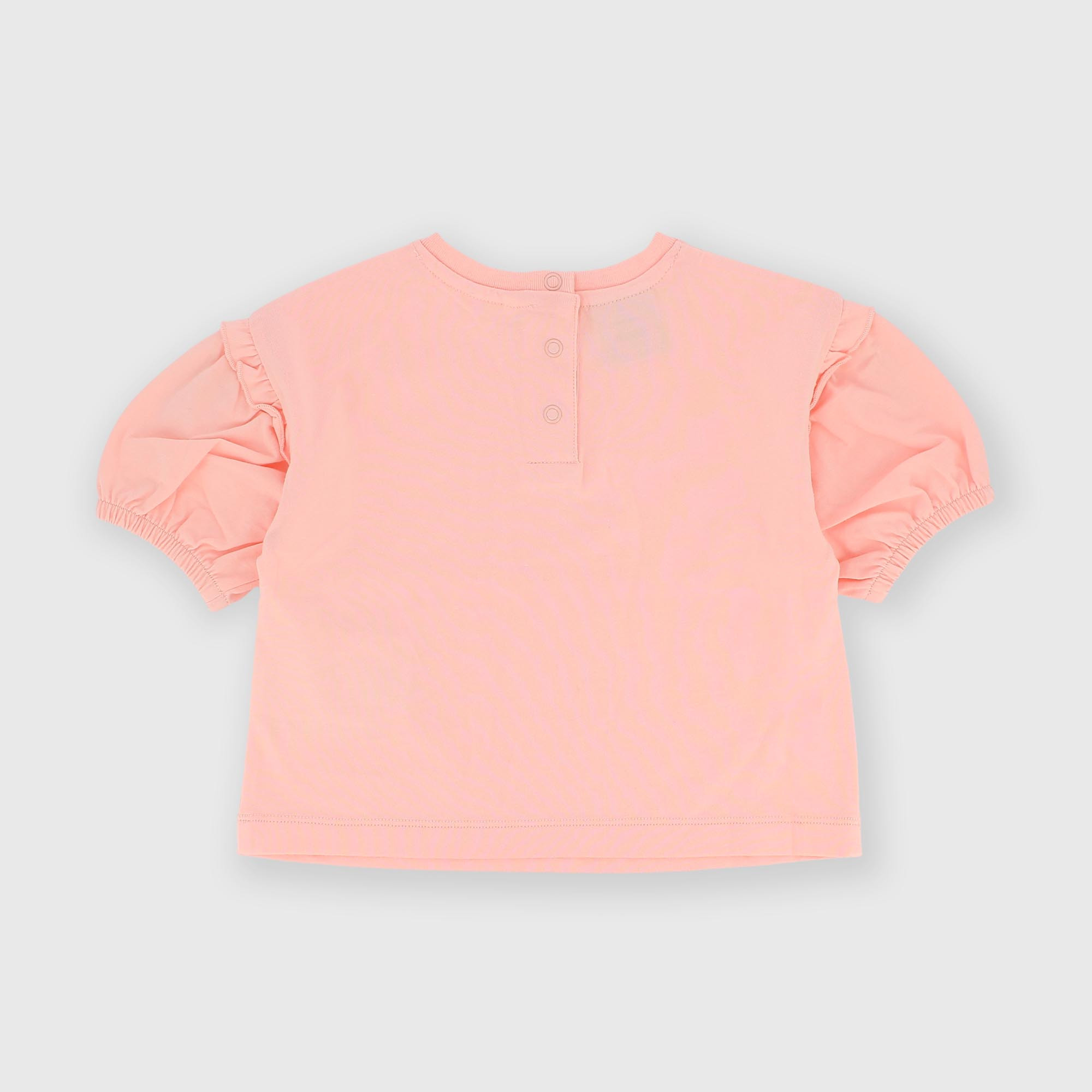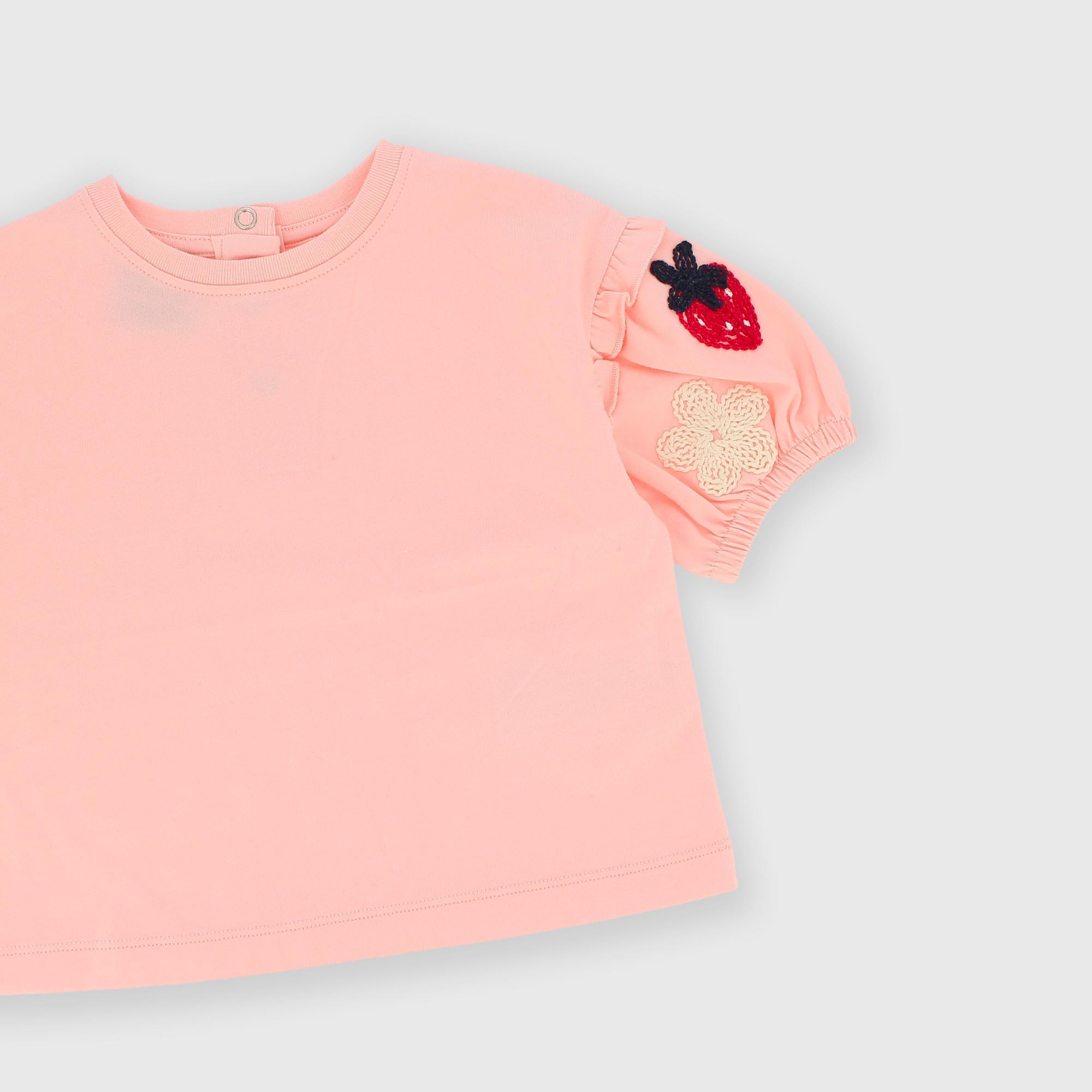 Camiseta de jersey, cuello redondo y manga corta. Cierre con corchetes automáticos en la parte posterior. Bordados de crochet de fresas y flores en las mangas.