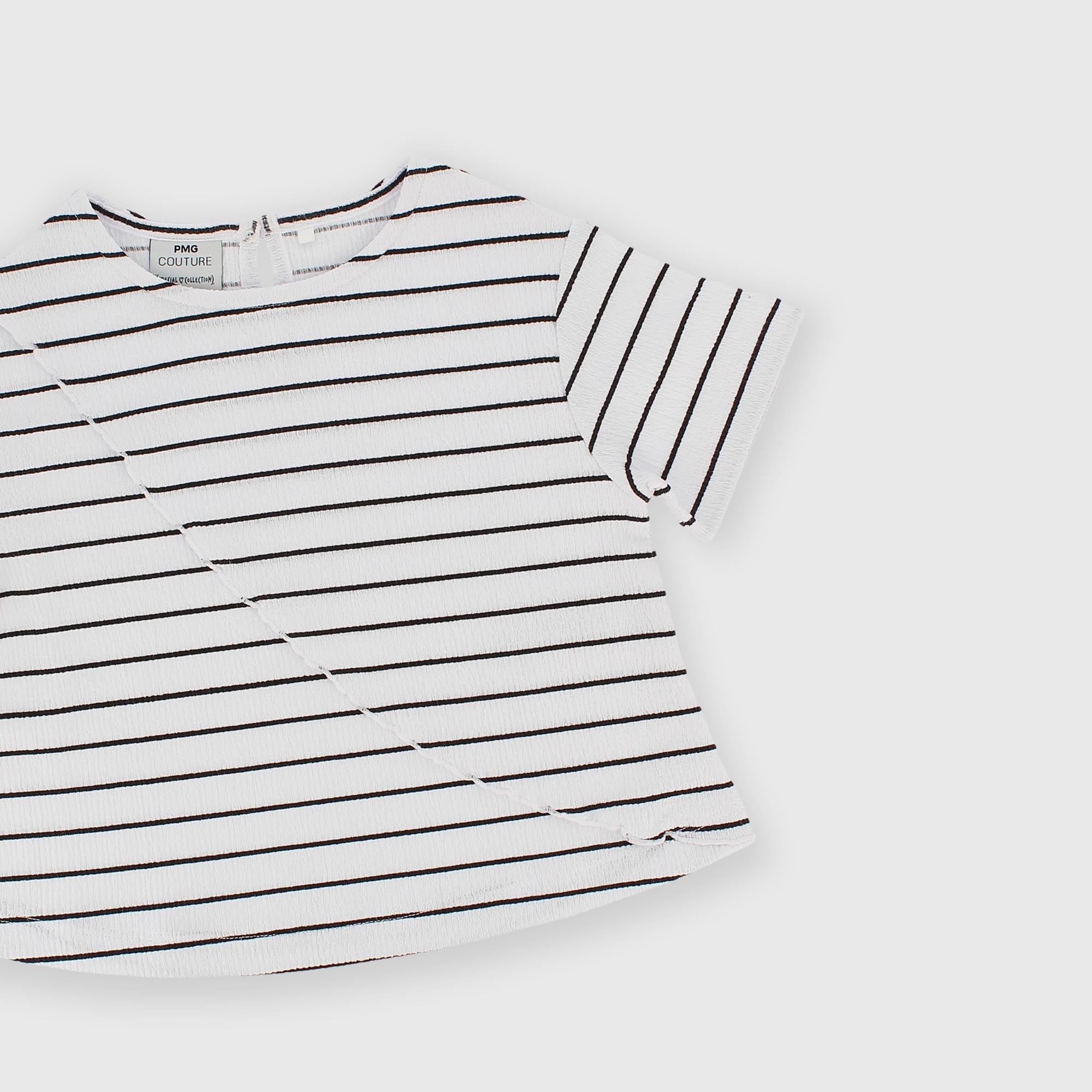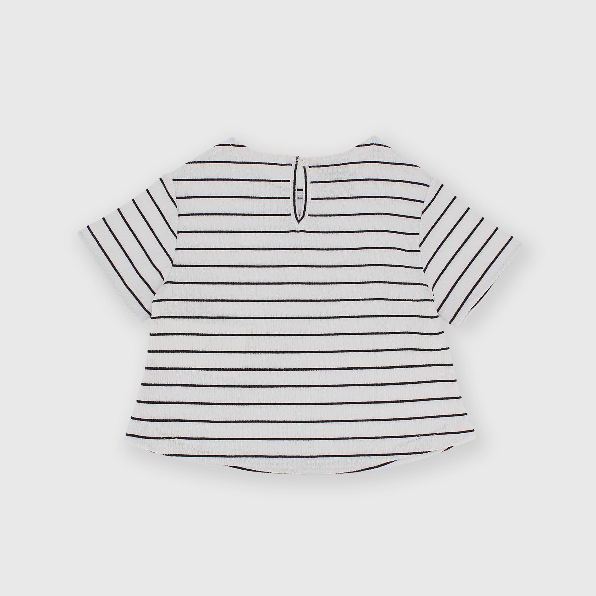 Camiseta de seersucker a rayas, cuello redondo y manga corta. Cruce en la parte delantera. Cierre en forma de gota con botón en la parte trasera. Acabados con punto festón