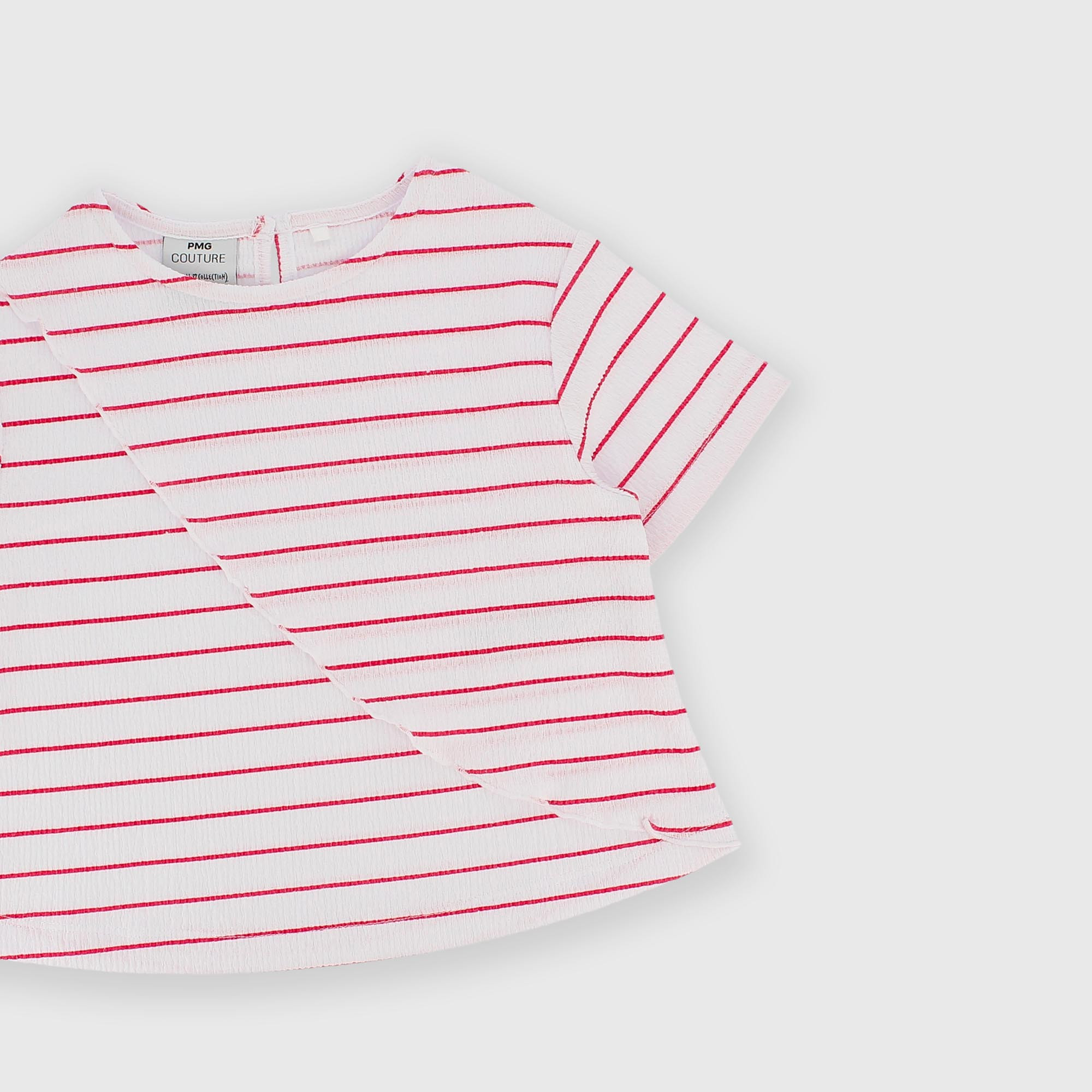 Camiseta de seersucker a rayas, cuello redondo y manga corta. Cruce en la parte delantera. Cierre en forma de gota con botón en la parte trasera. Acabados con punto festón