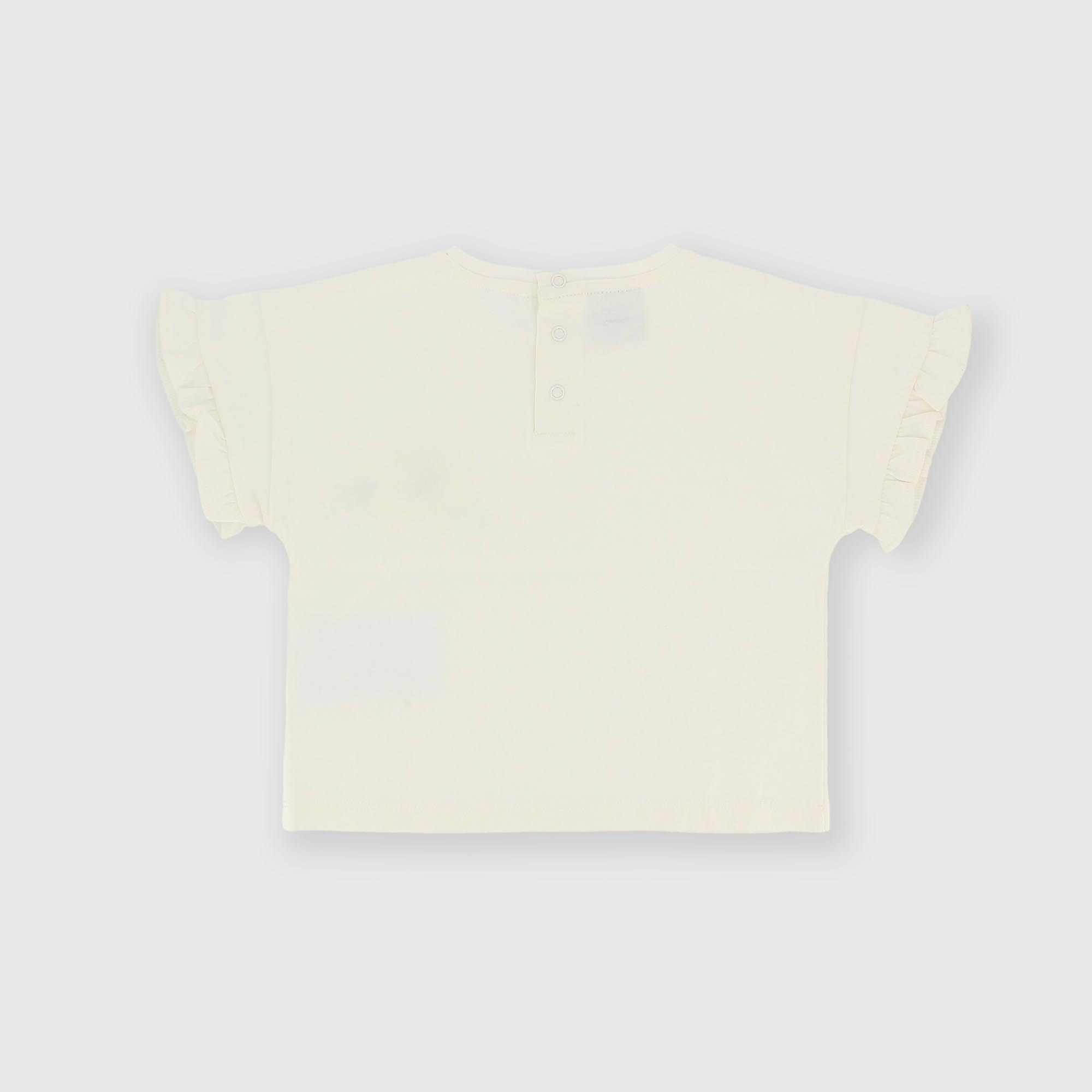 Camiseta de jersey, cuello redondo y manga corta con volantes. Cierre posterior con corchetes automáticos. Estampado de flor en la parte delantera.