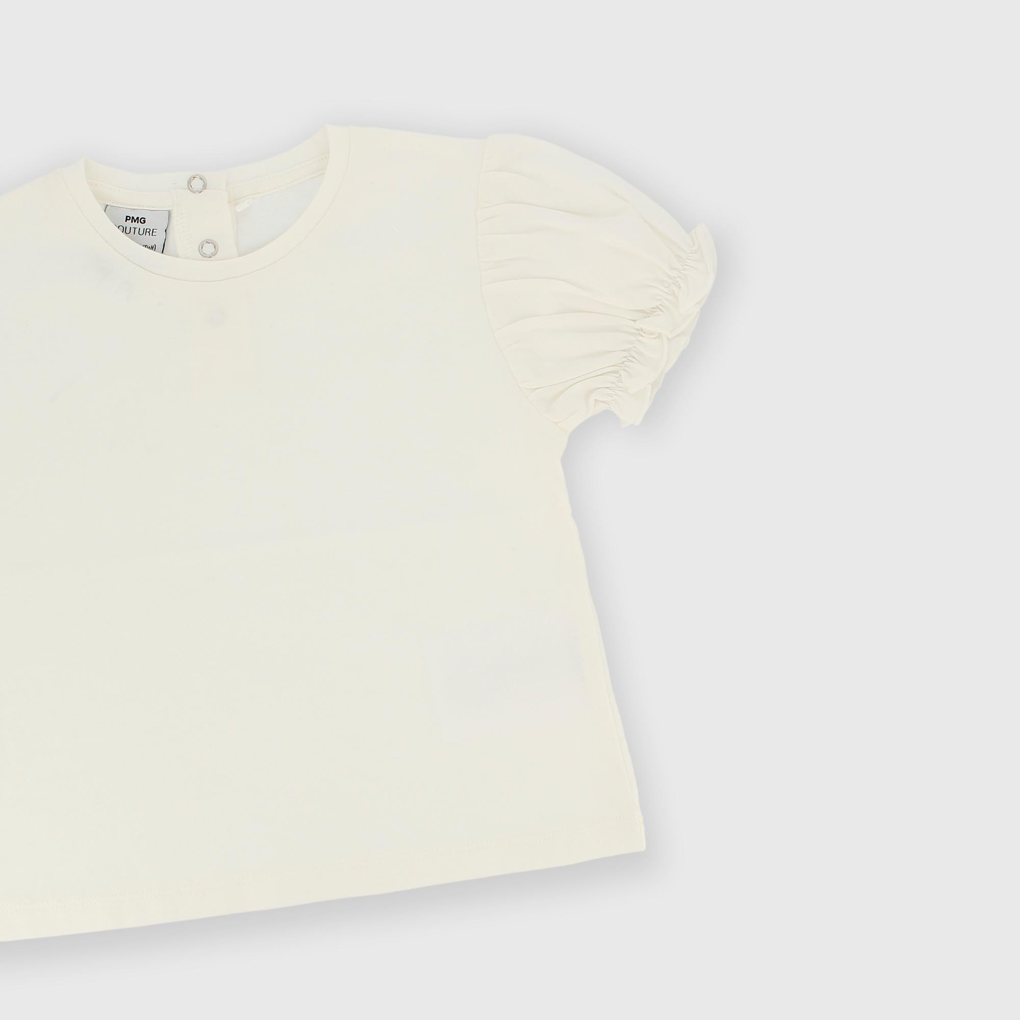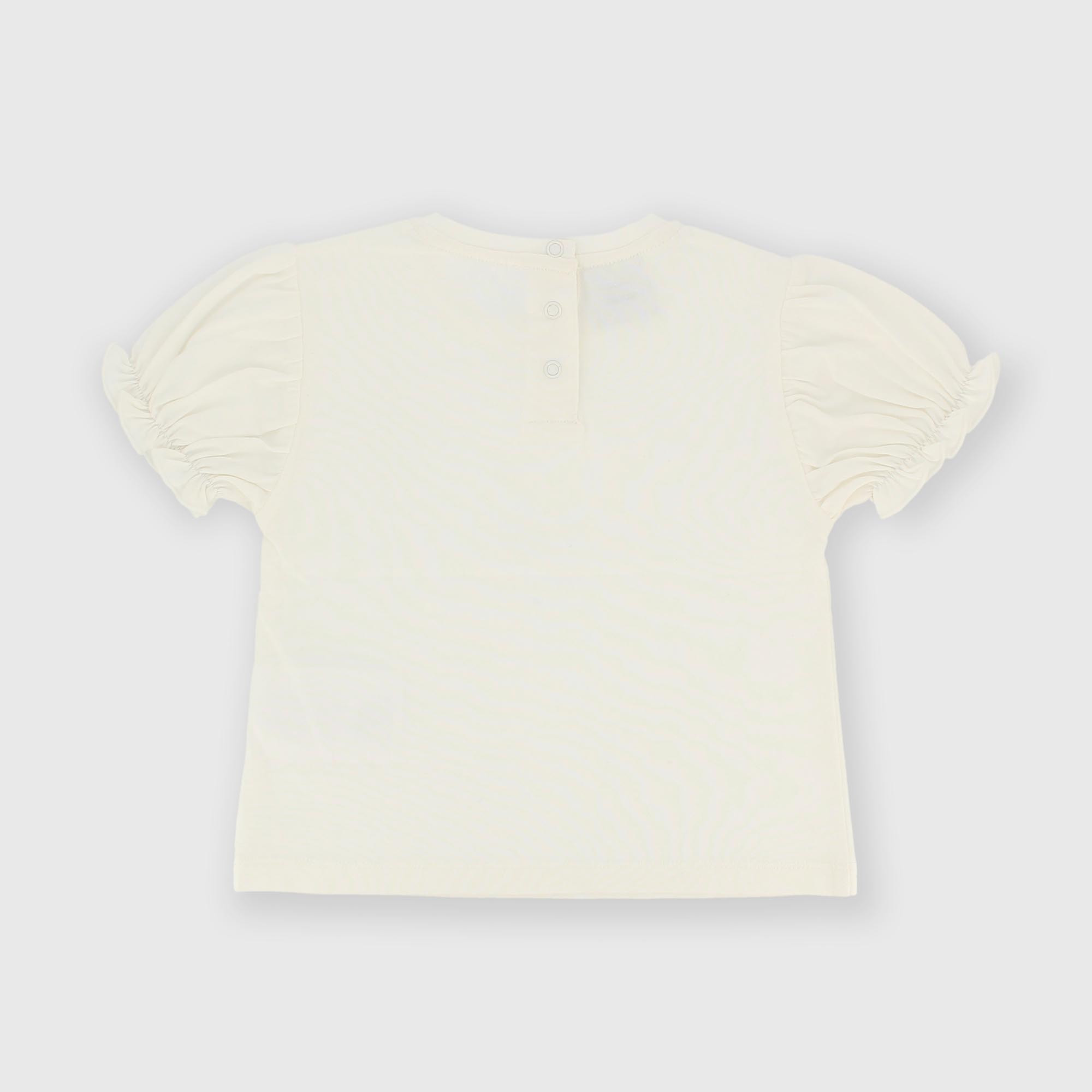 Camiseta de jersey, cuello redondo. Mangas cortas tipo globo de voile. Cierre trasero con botones automáticos.
