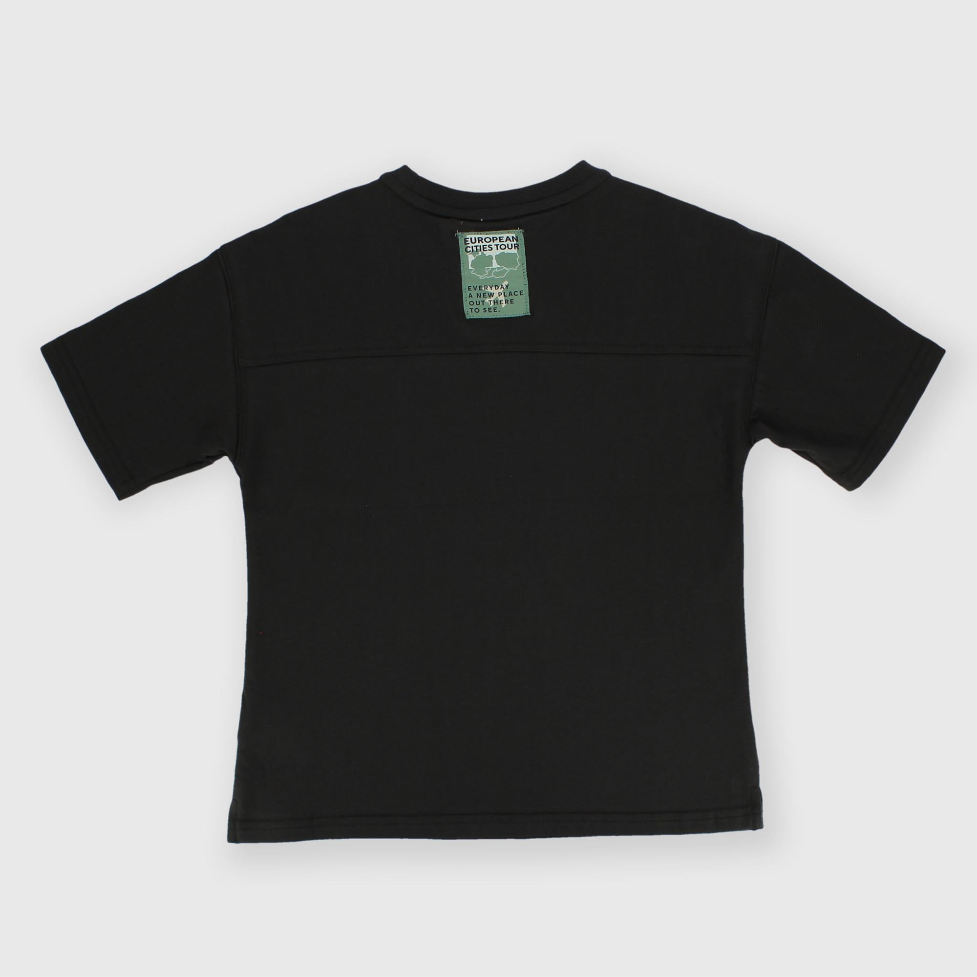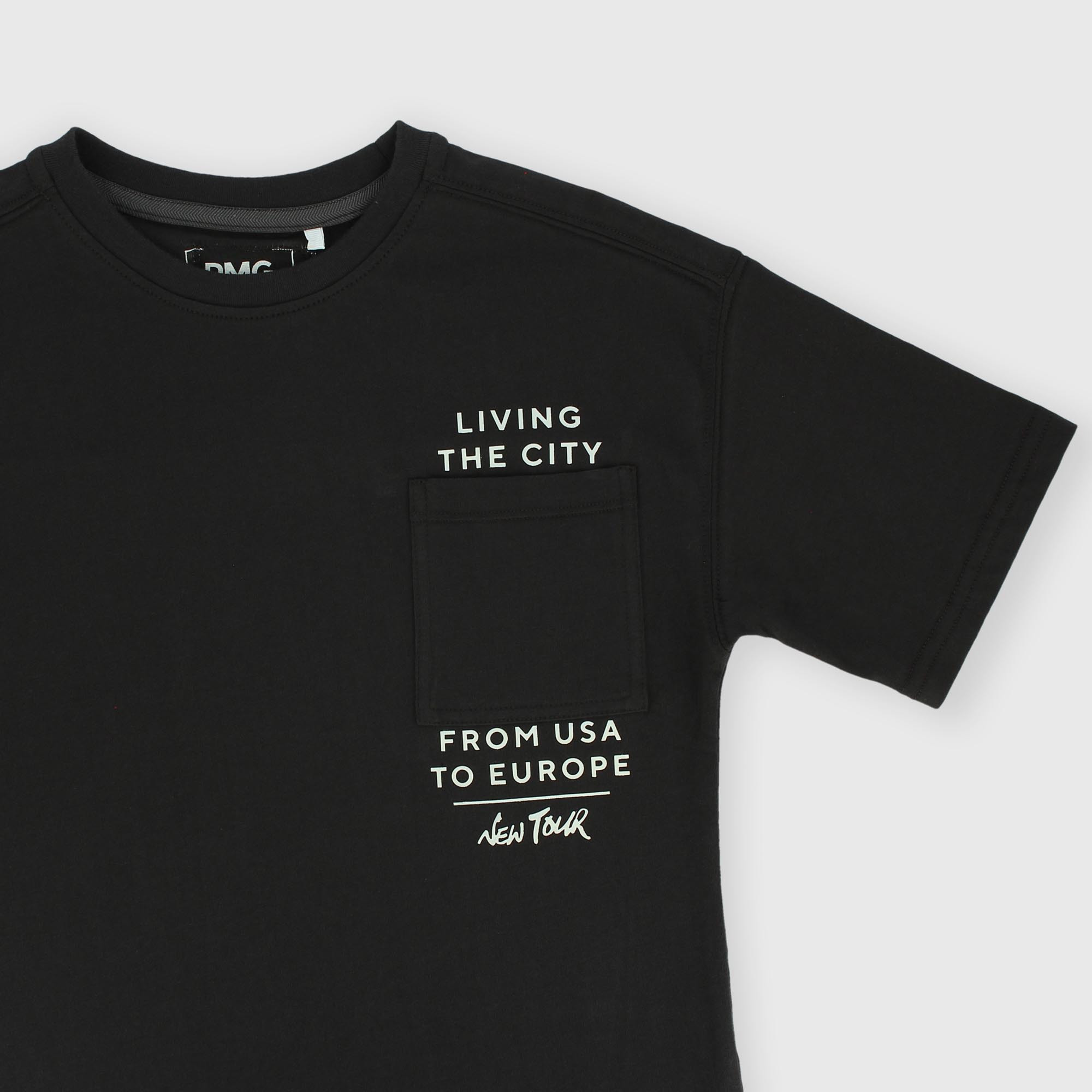 Camiseta de tejido Jersey, con cuello redondo, mangas cortas. Bolsillo en el pecho. Estampado con detalles efecto goma en la parte anterior y pequeño patch con escritas en la parte trasera.