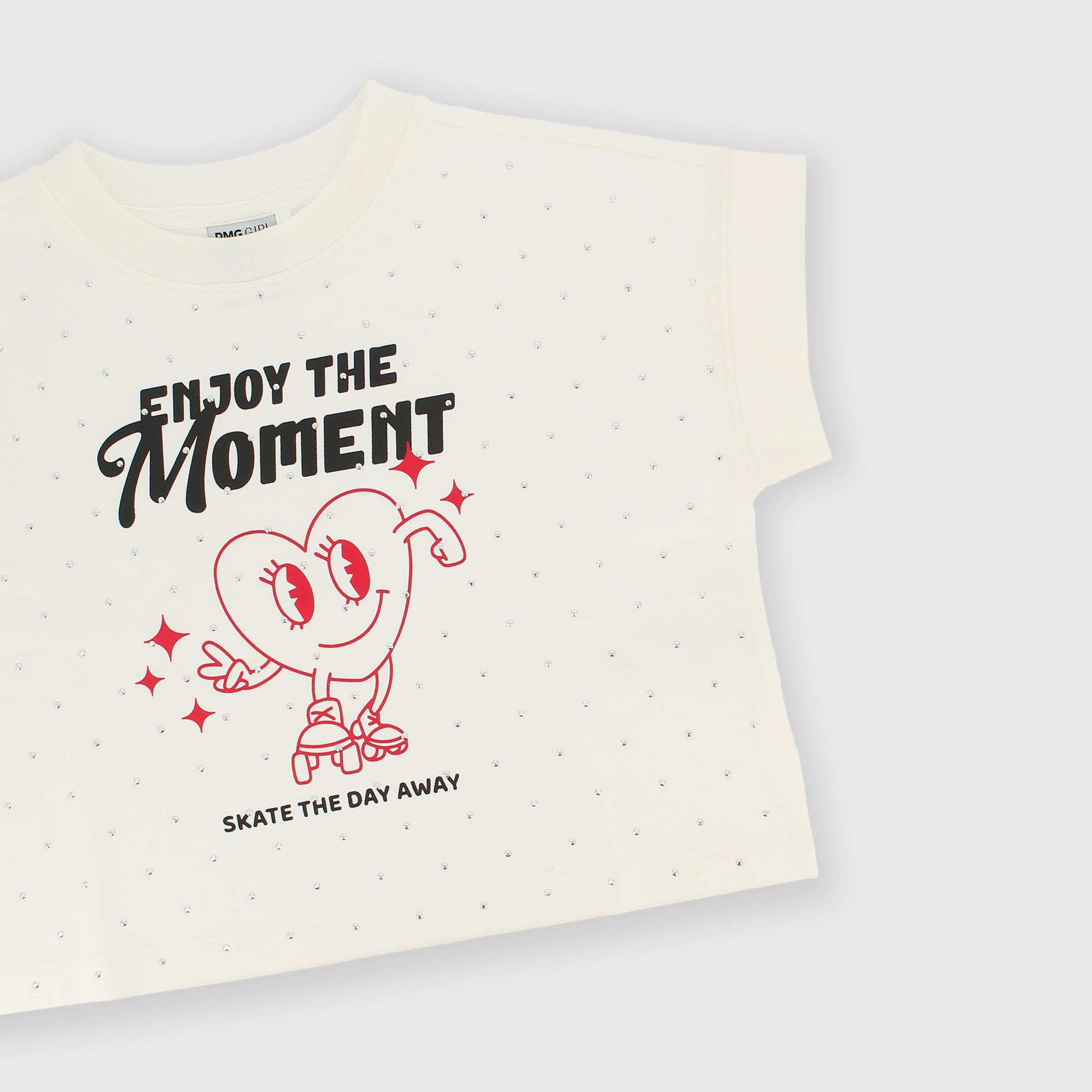 Camiseta de jersey, cuello redondo y manga corta. Estampado y tachuelas aplicadas en la parte delantera.
