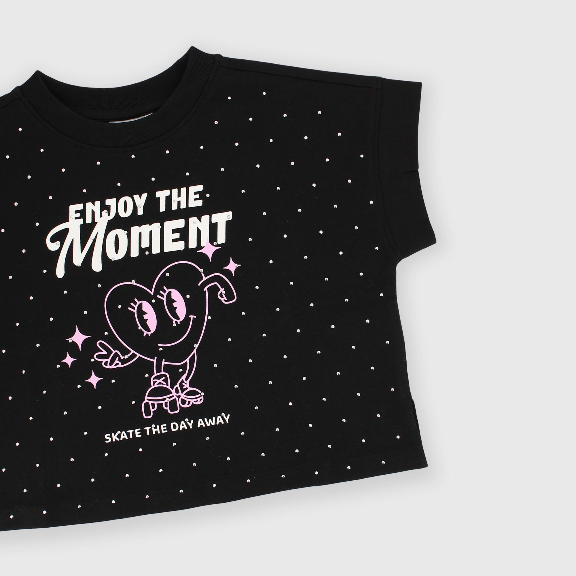 Camiseta de jersey, cuello redondo y manga corta. Estampado y tachuelas aplicadas en la parte delantera.