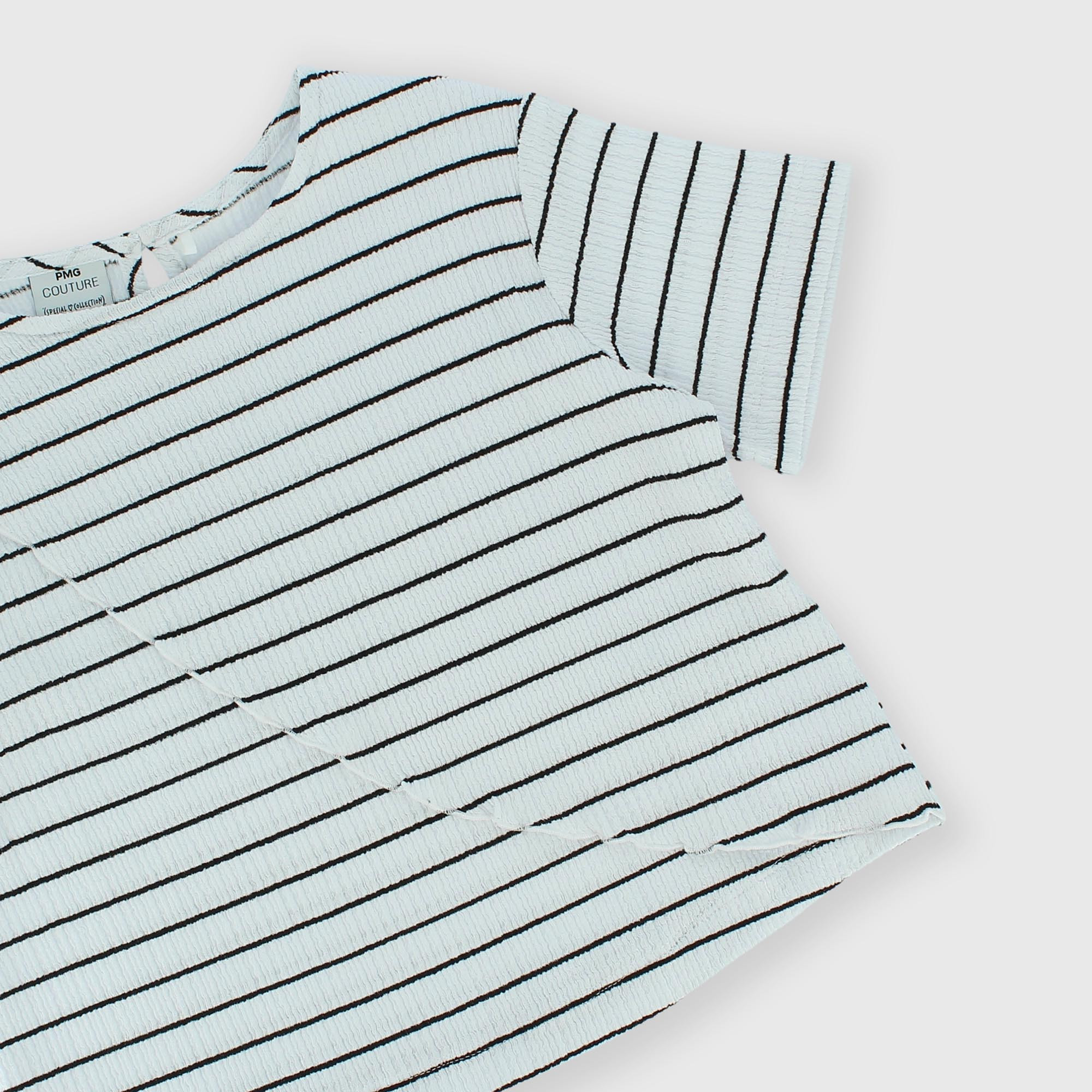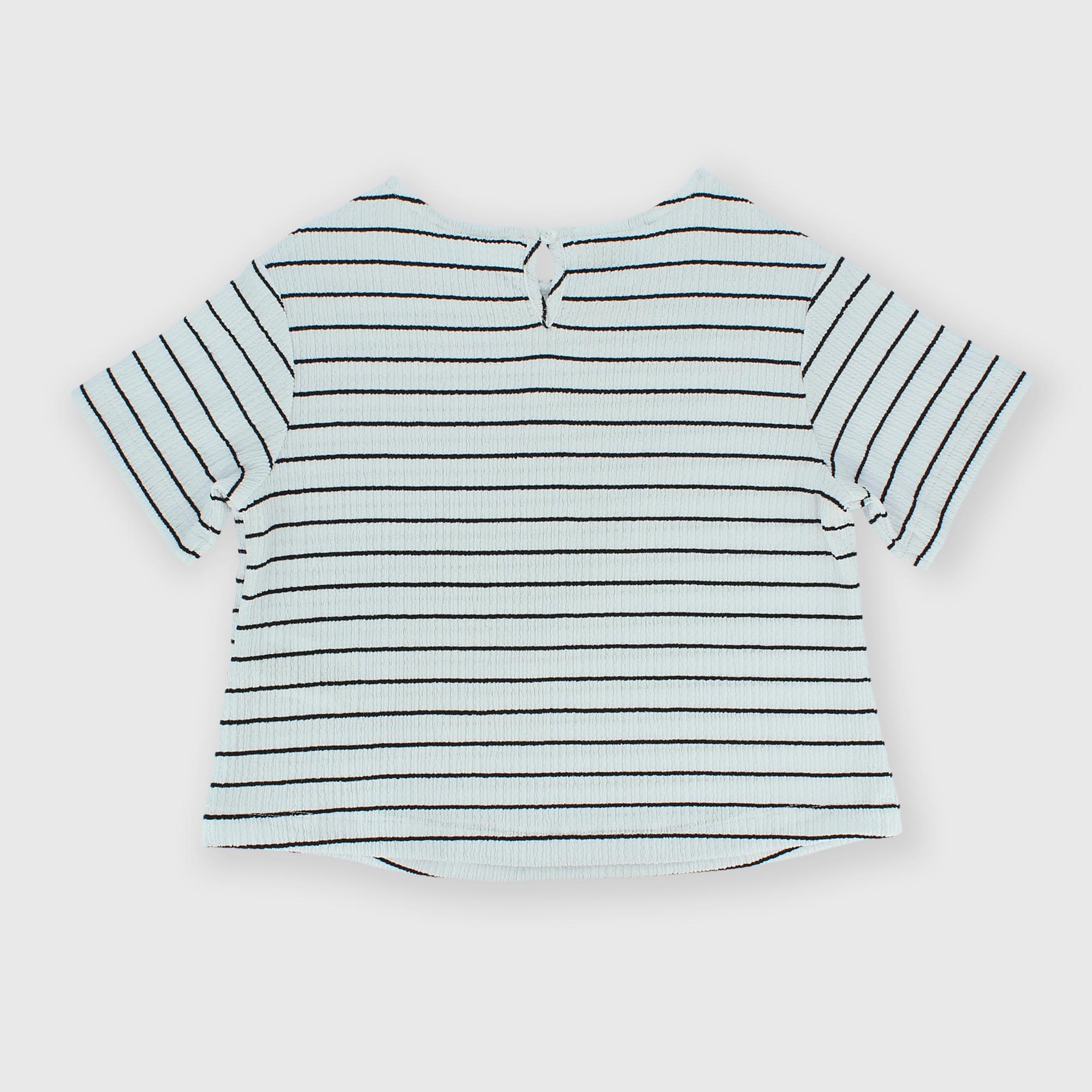 Camiseta de tejido seersucker de rayas, con cuello redondo, mangas cortas. Parte delantera cruzada. Cierre tipo gota con botón en la parte posterior. Acabados en punto bambola.