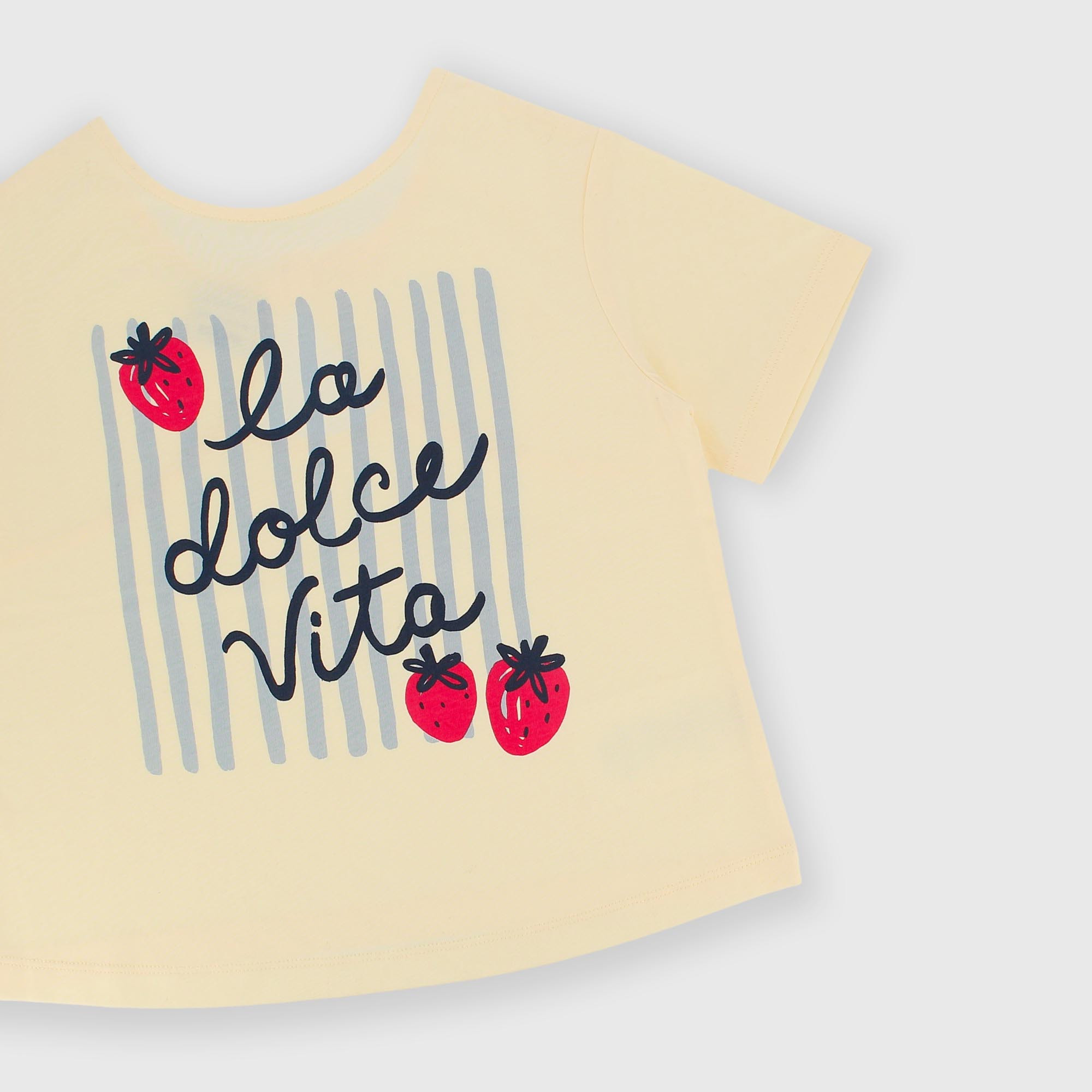 Camiseta de jersey, cuello redondo y manga corta. Lazo pequeño y abertura en la parte posterior. Estampado en la parte delantera.