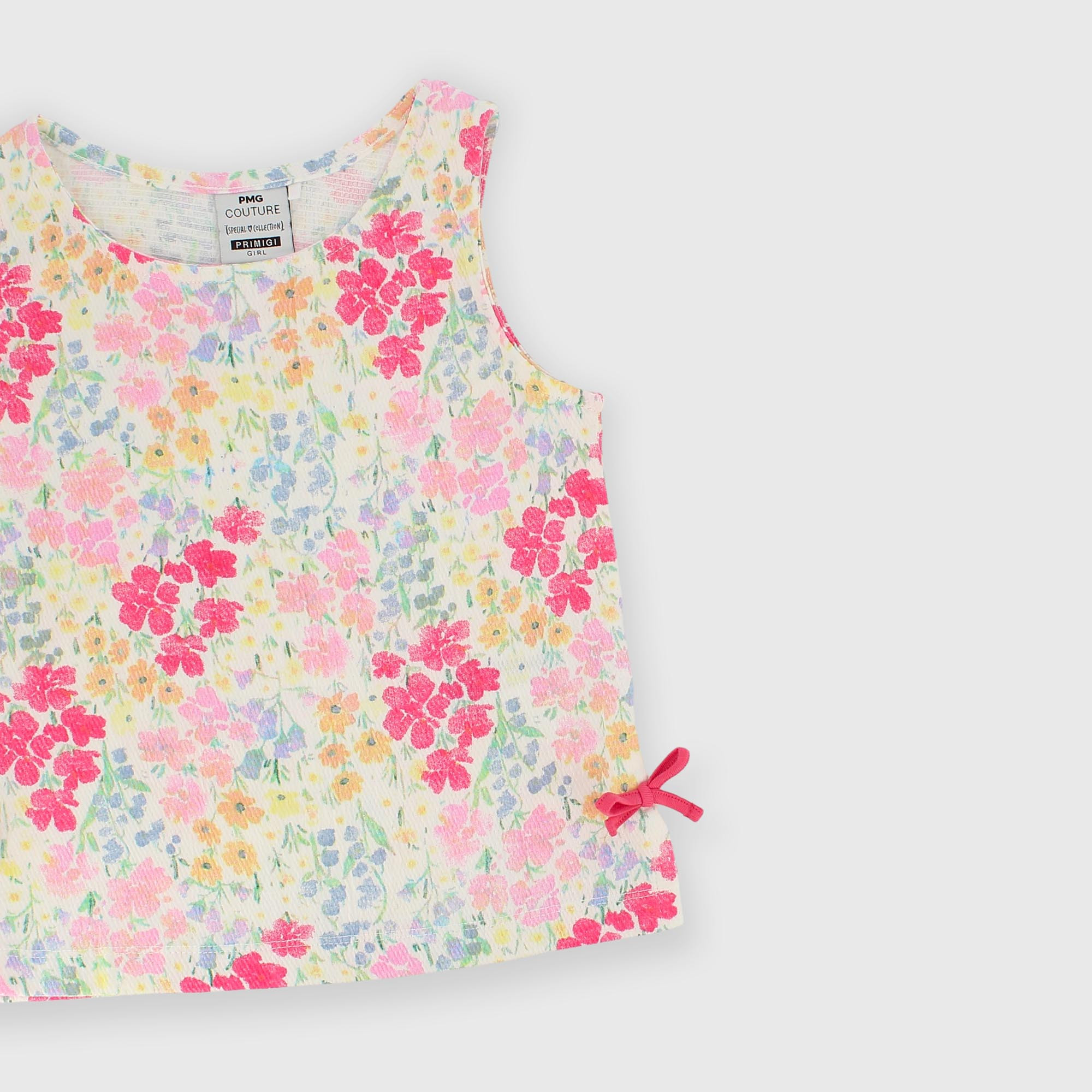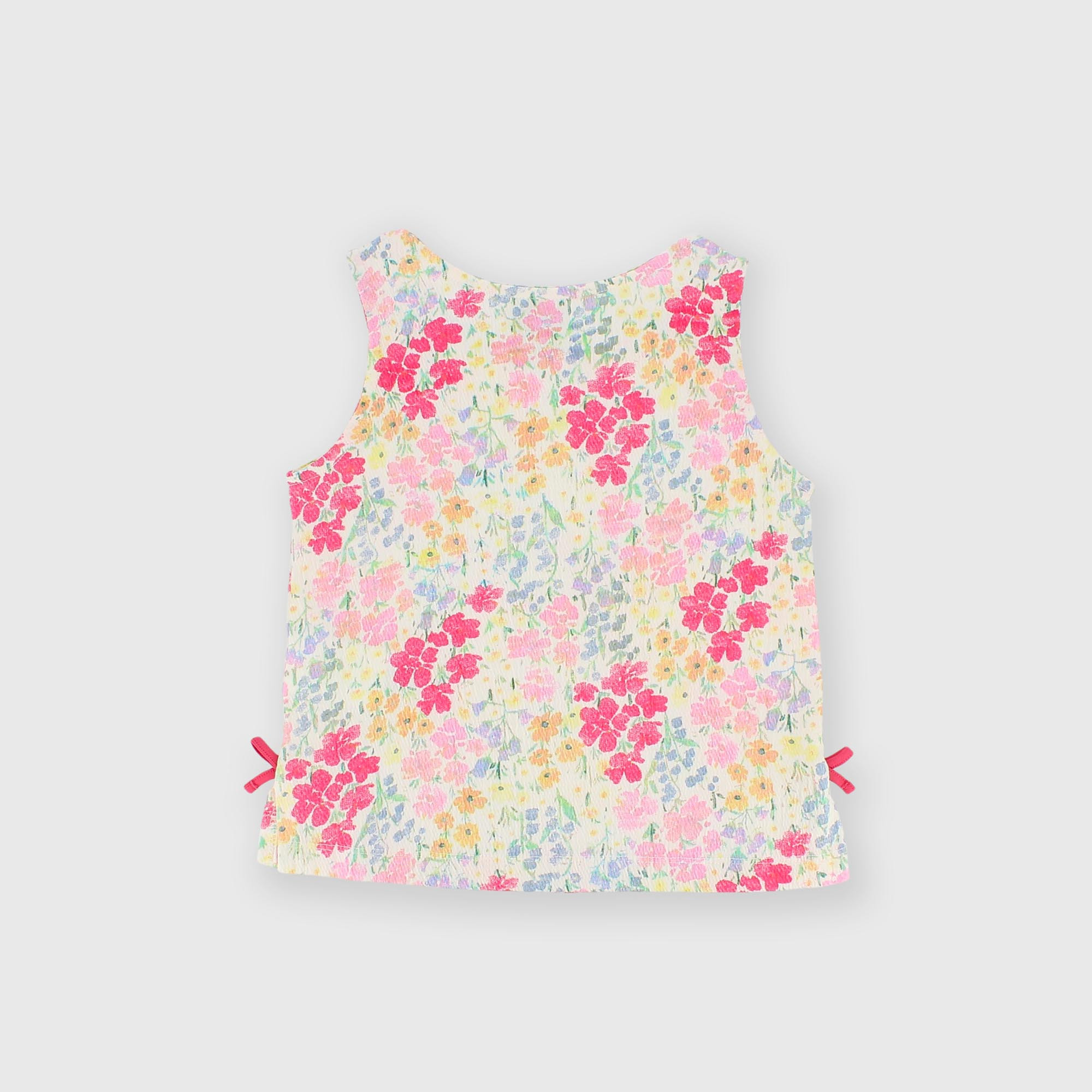 Camiseta de tirnates de seersucker con cuello redondo. Flores multi color estampadas all over. Lazos aplicados en los lados.