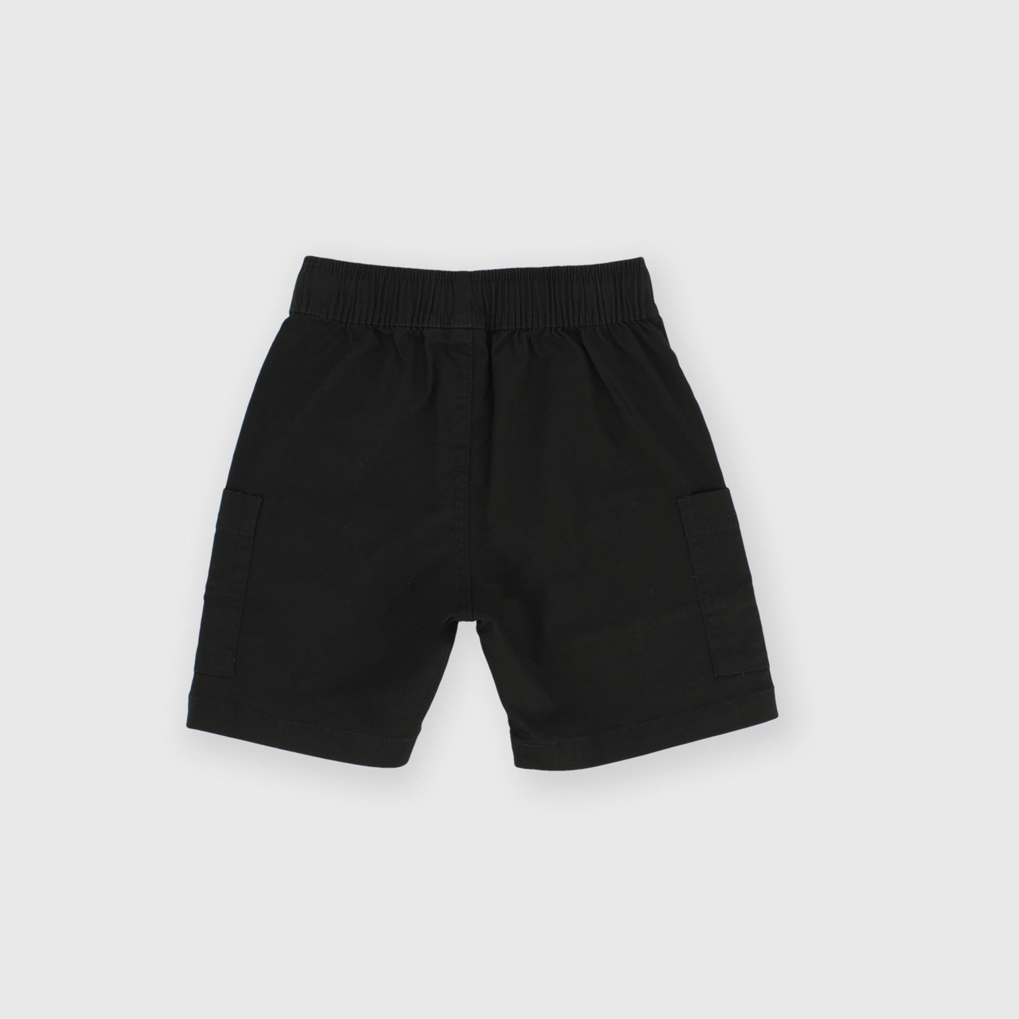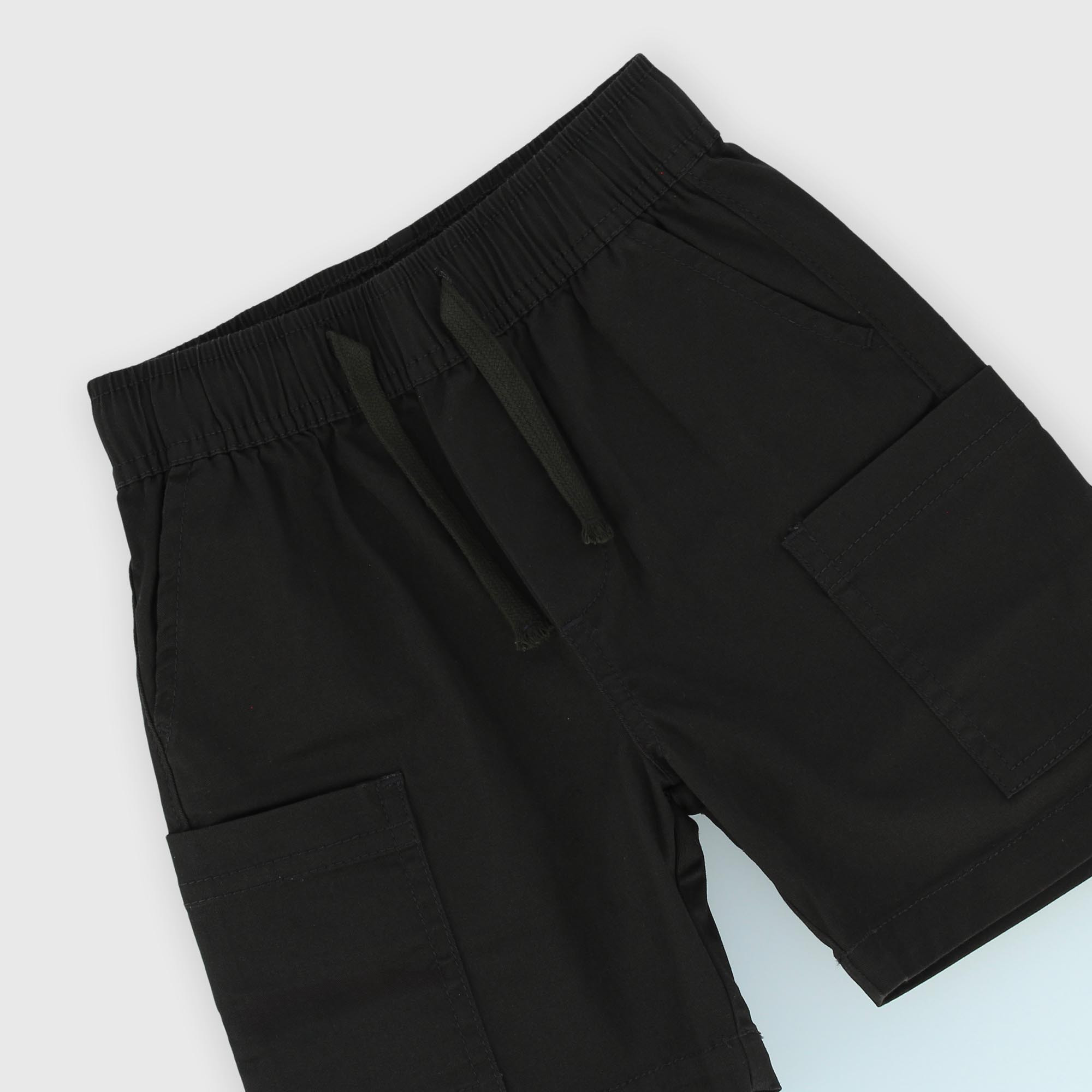 Bermuda de gabardina con cintura elástica y cordones delanteros. Bolsillos franceses y grandes bolsillos de parche en los lados.