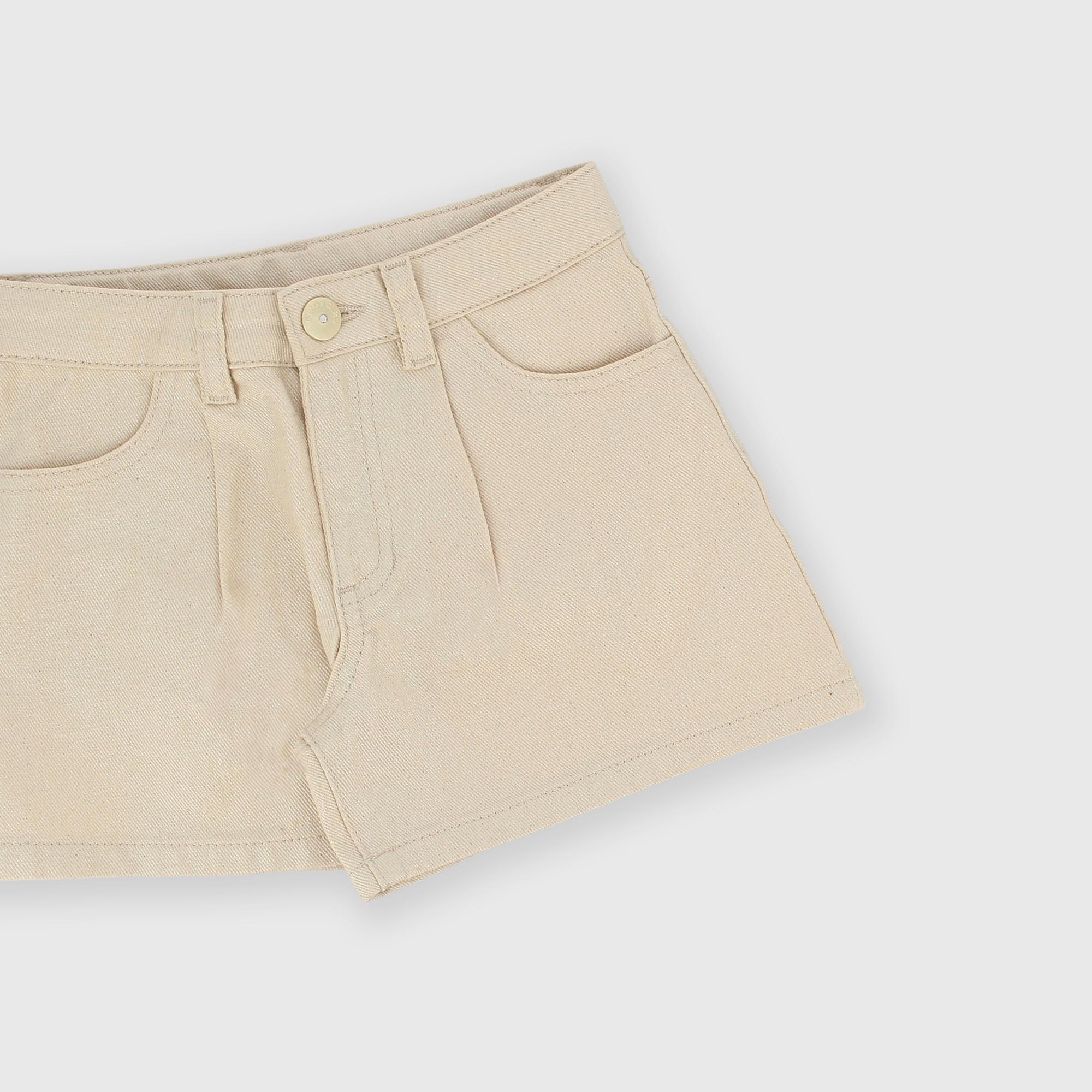 Pantalón corto de algodón con acabado en lurex y cintura regulable en el interior. Bolsillos delanteros y parche en la parte trasera. Pinzas frontales.