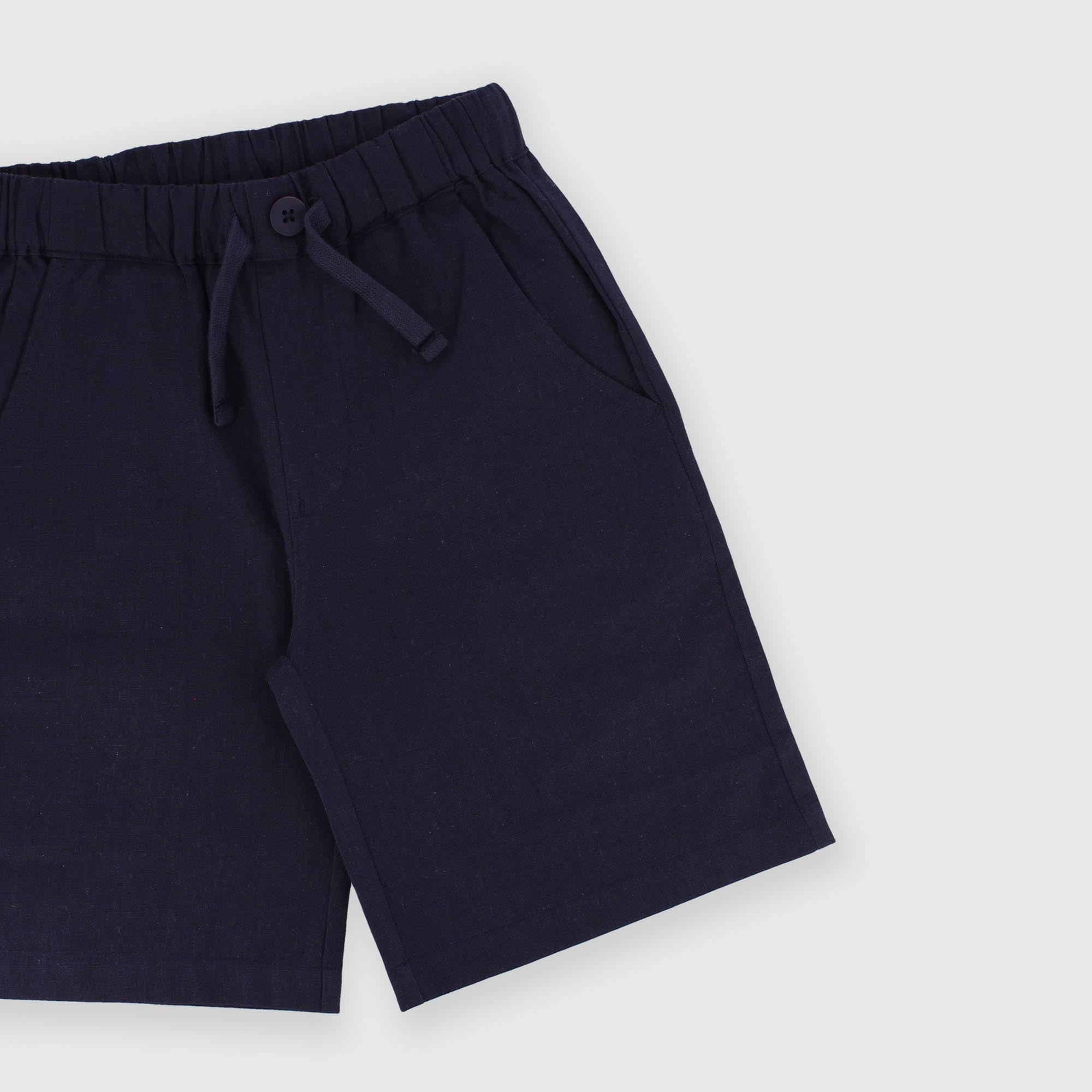 Bermudas de algodón y lino con cintura elástica y cordones frontales. Botón decorativo en la parte delantera. Bolsillos tipo francés.