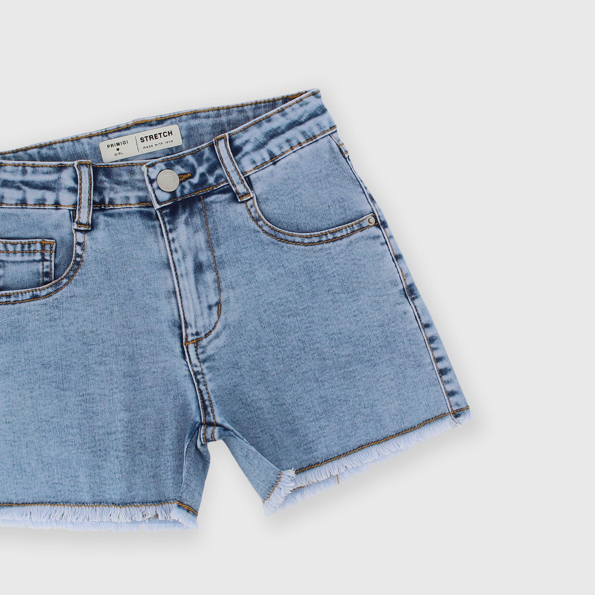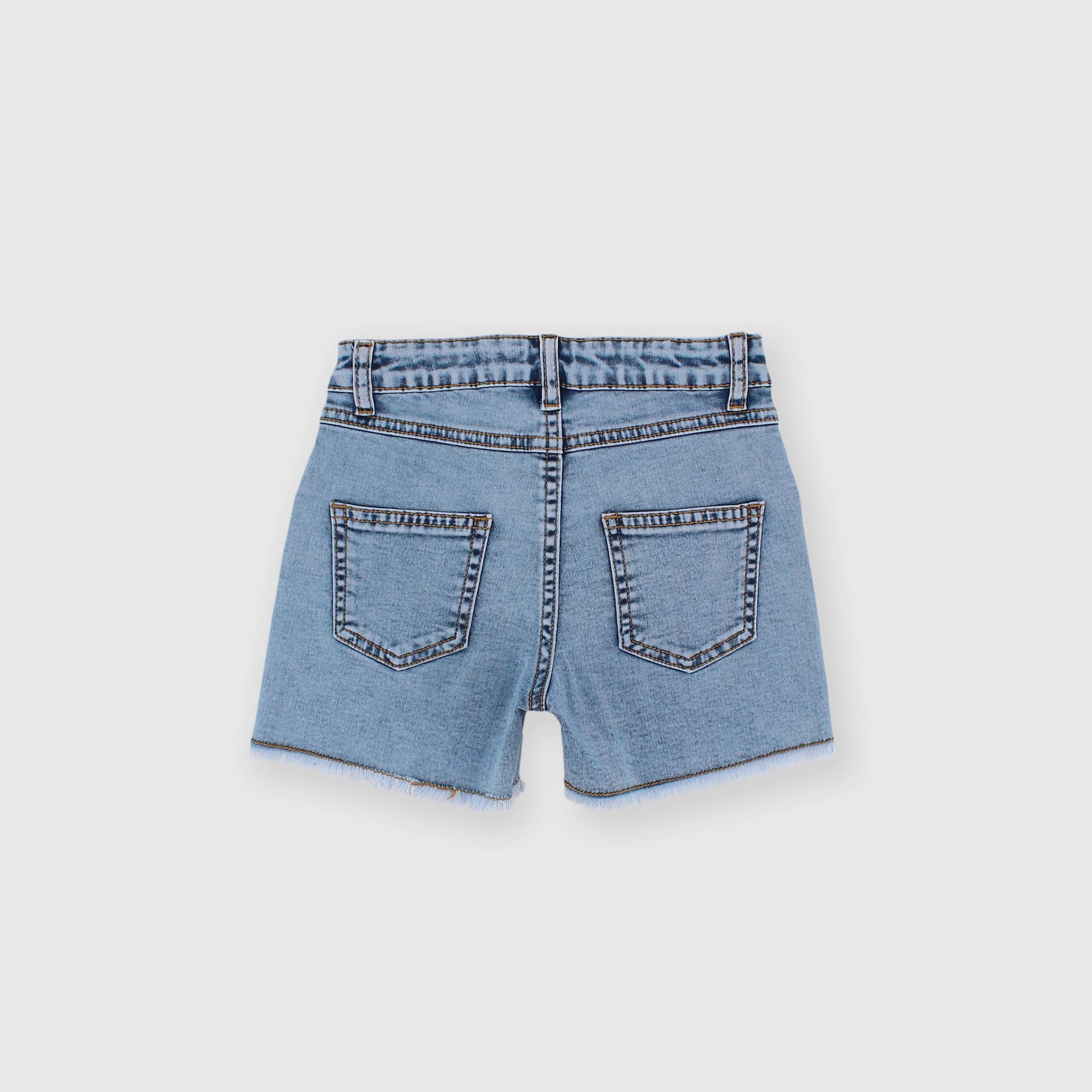 Pantalón corto vaquero con cintura regulable en el interior. Cierre con botón y cremallera. Trabillas en la cintura. Cinco bolsillos. Bajo desflecado.