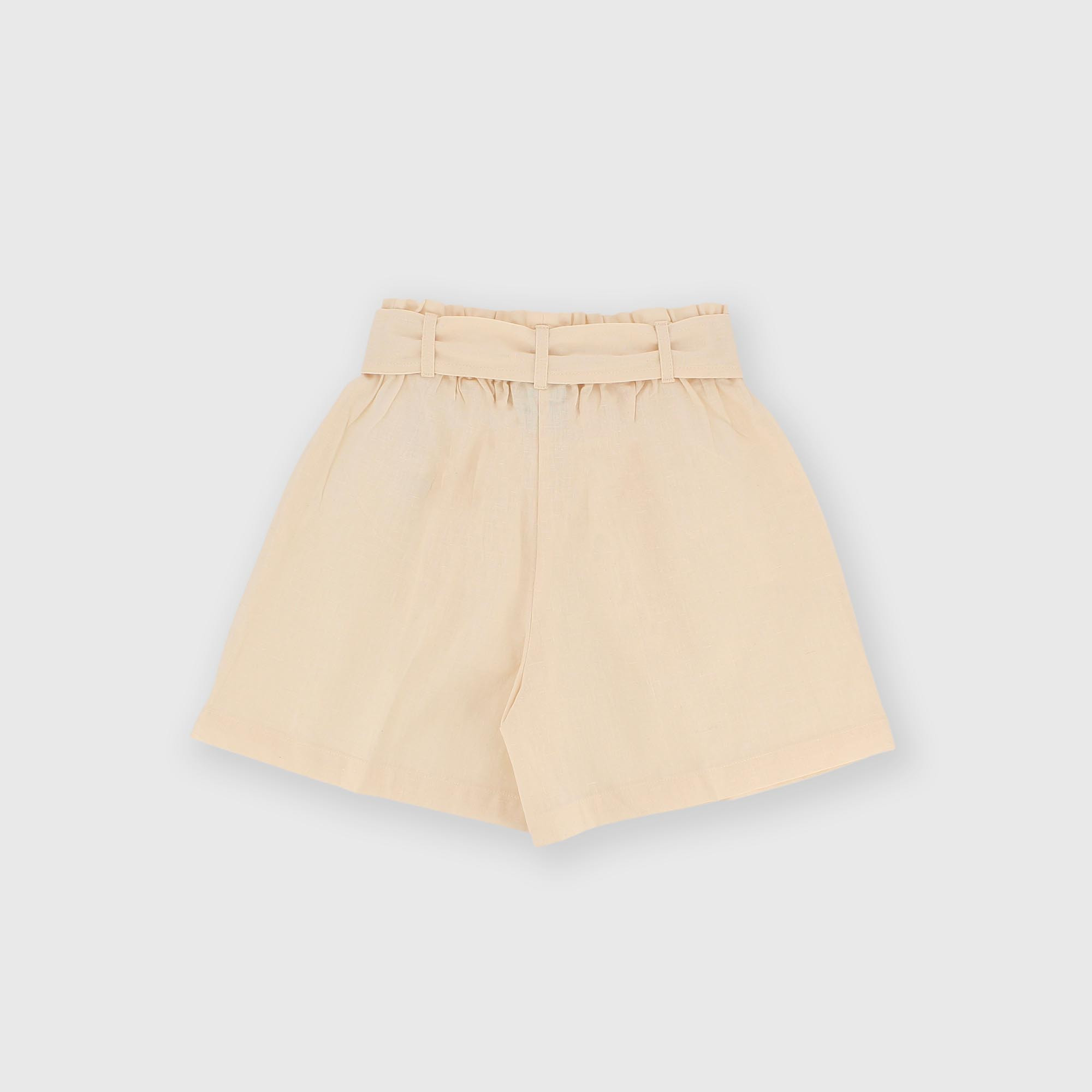 Pantalón corto de algodón-lino con cintura elástica y trabillas. Cinta a juego.