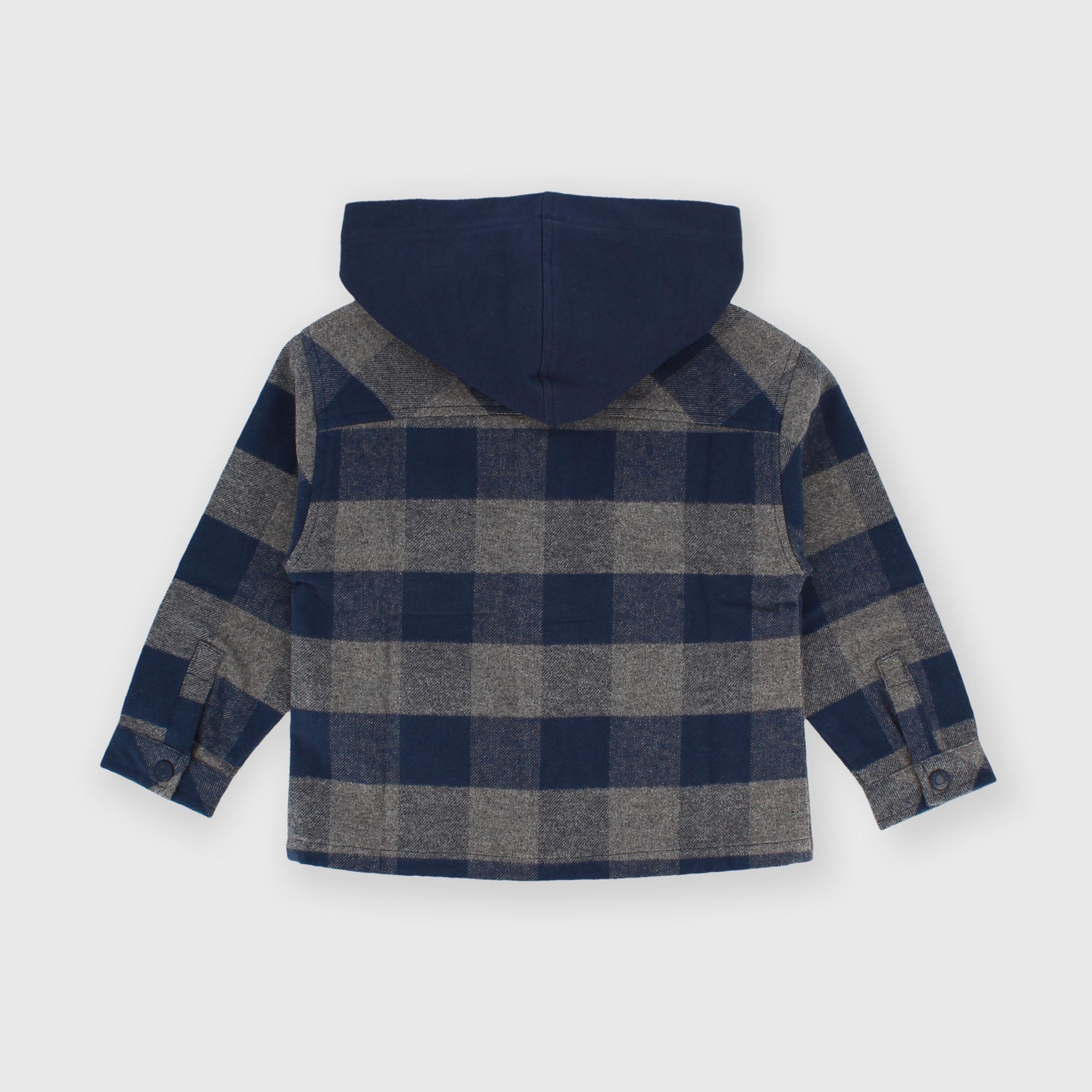 Camisa de franela de cuadros con capucha removible de tejido felpa, mangas largas. Cierre con broches a presión en la parte delantera. Bolsillo en el pecho.