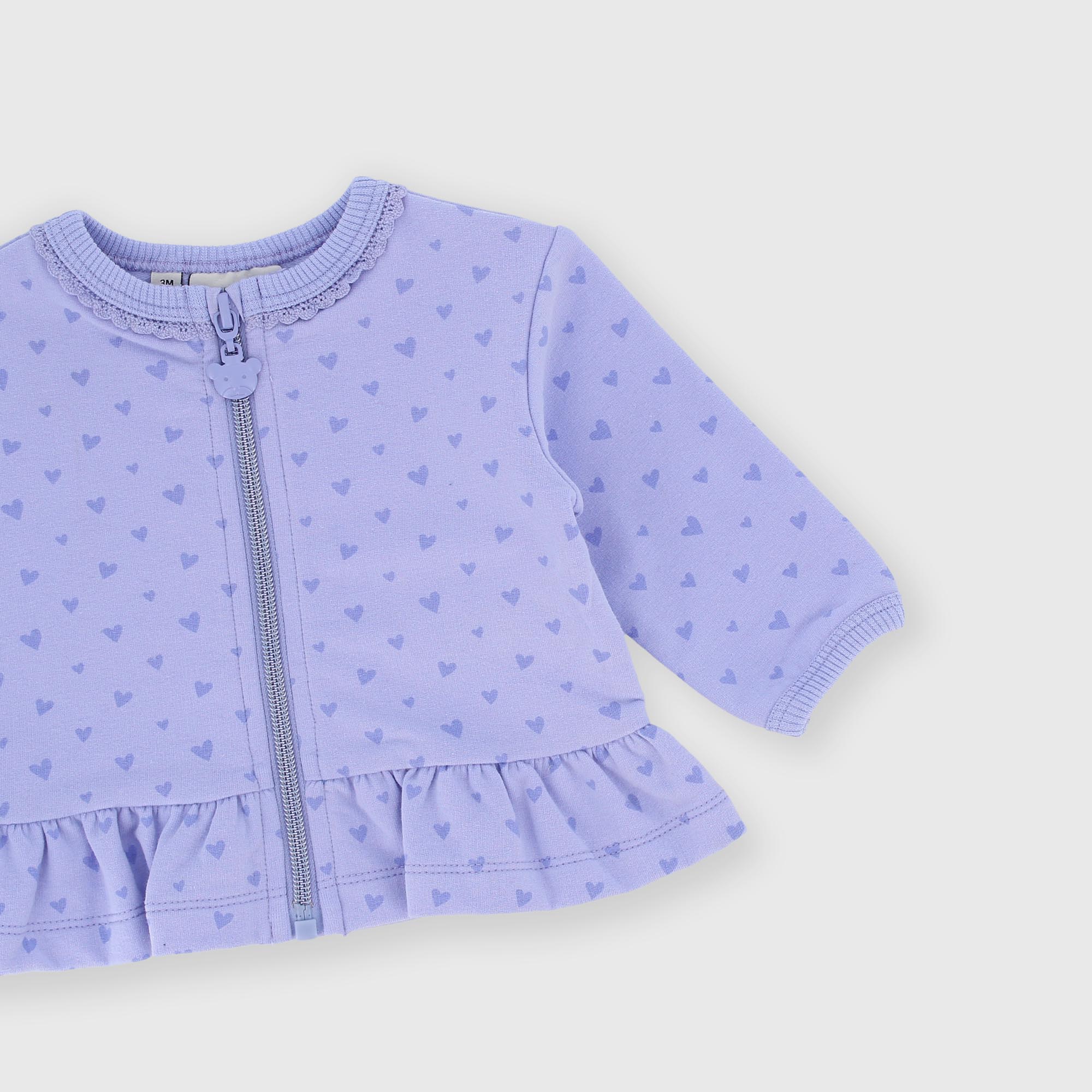 Sudadera con cuello redondo y mangas largas. Cierre con cremallera en la parte delantera. Encaje en el cuello. Corazones estampados.